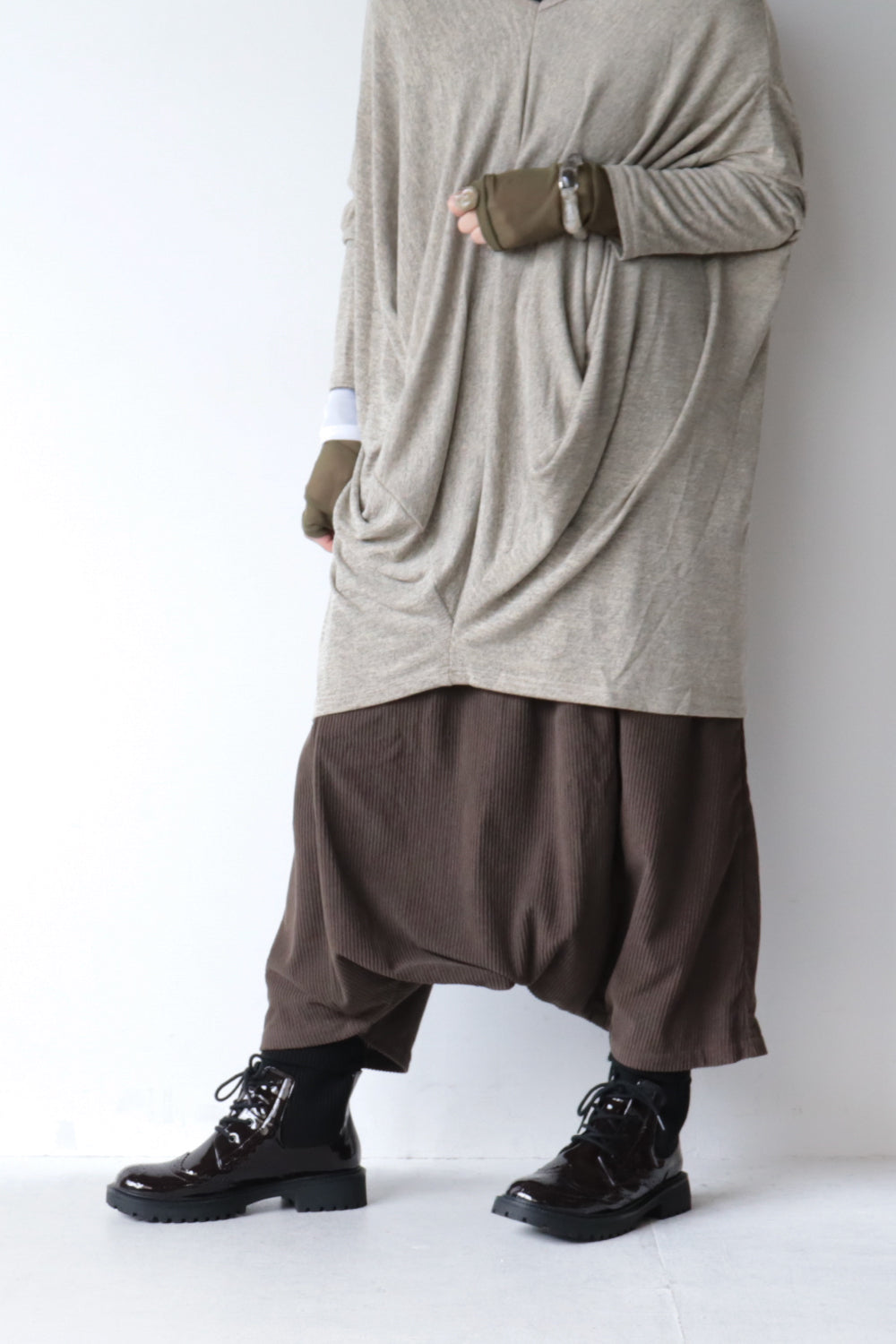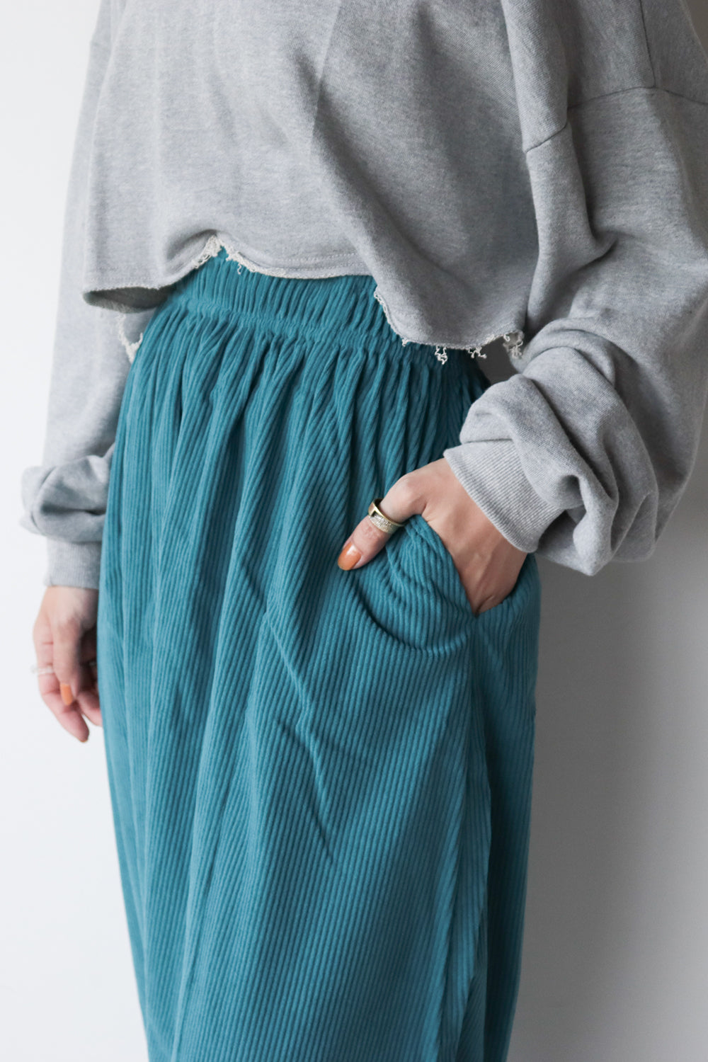 太めのコーデュロイ素材と深めの股上と折り返した裾のデザインがポイント◎