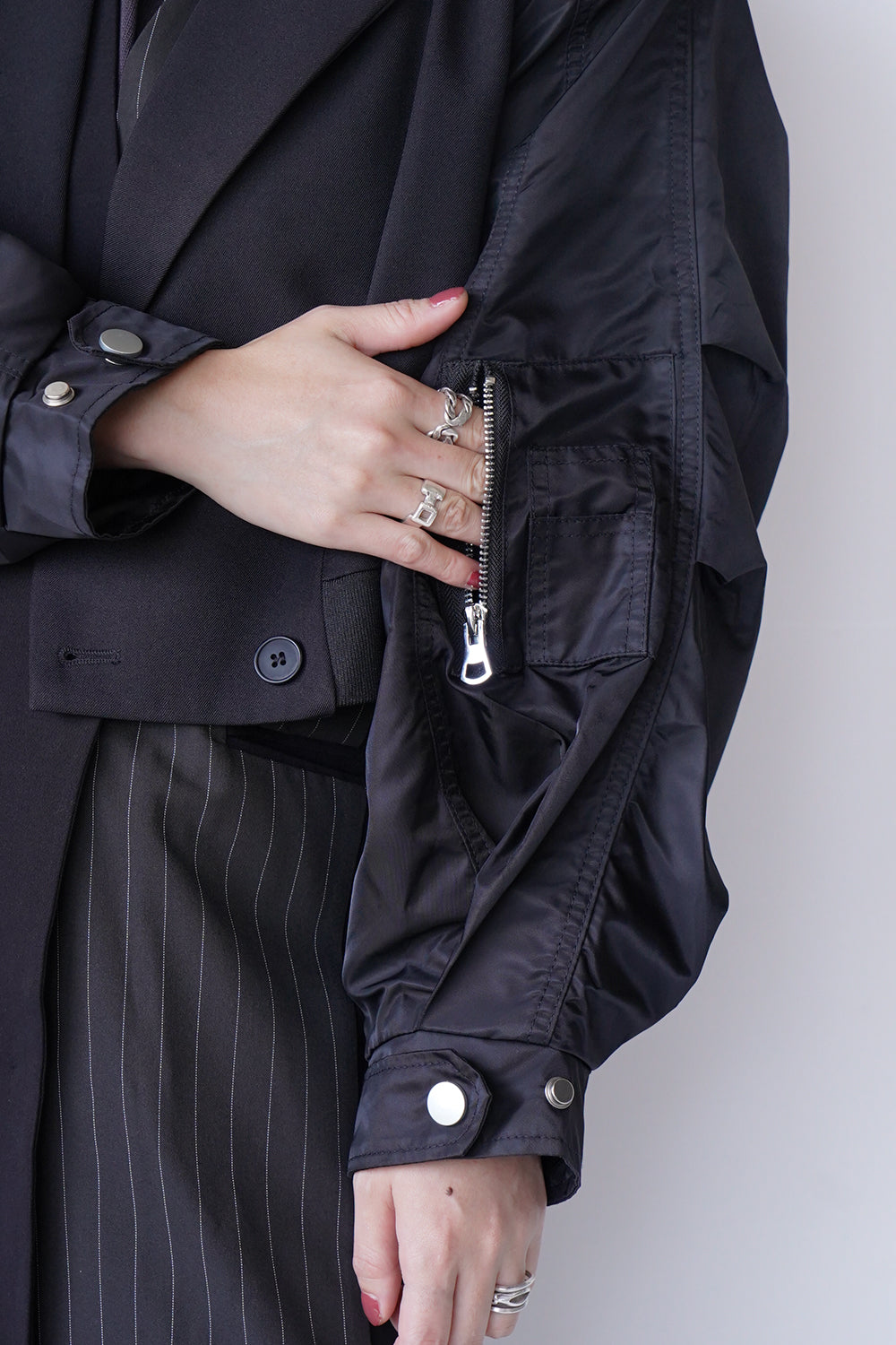 異素材の組み合わせで仕上げたショート丈テーラードジャケット。上品さにMA-1を思わせるナイロン素材の袖を掛け合わせた、モード感漂う一着!