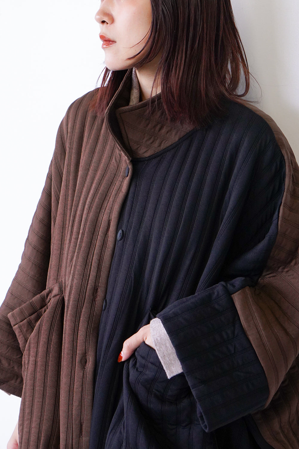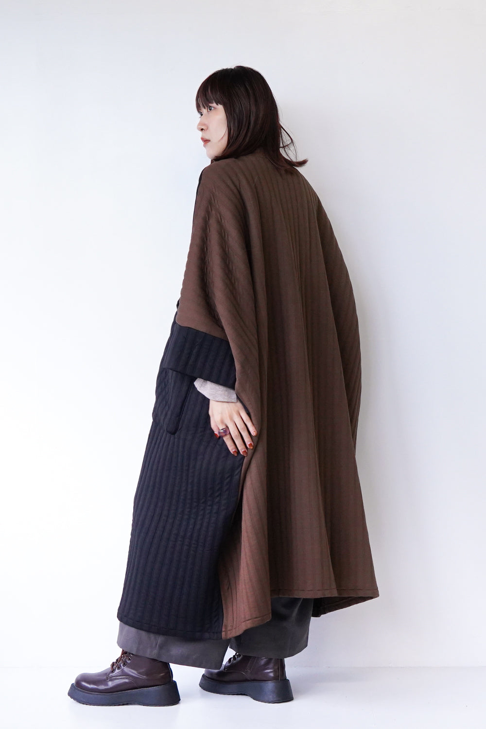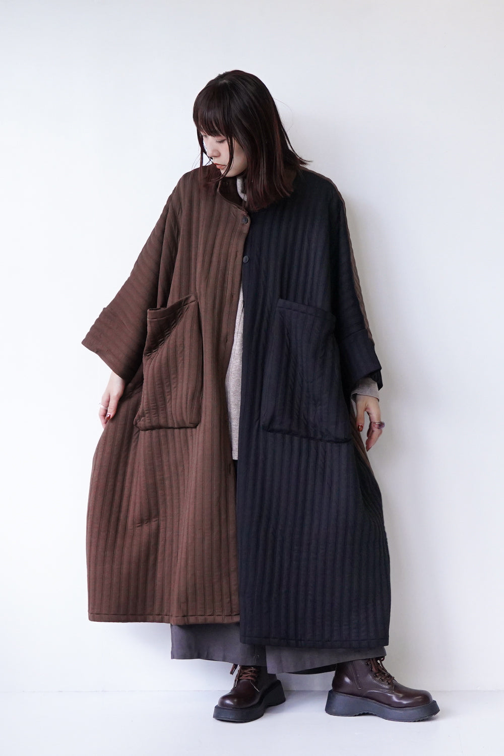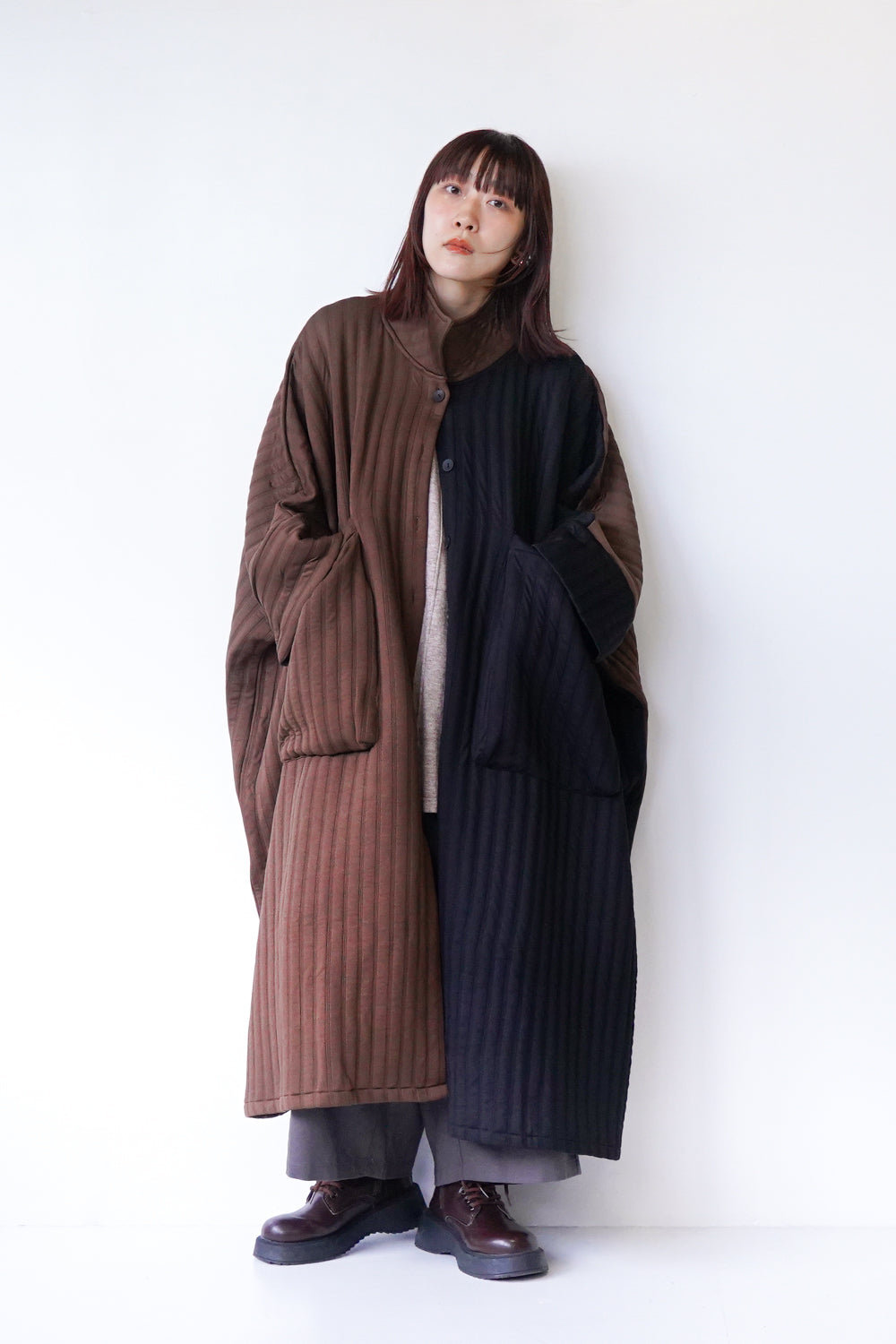 バイカラーにとことんビッグサイズなロングコート。