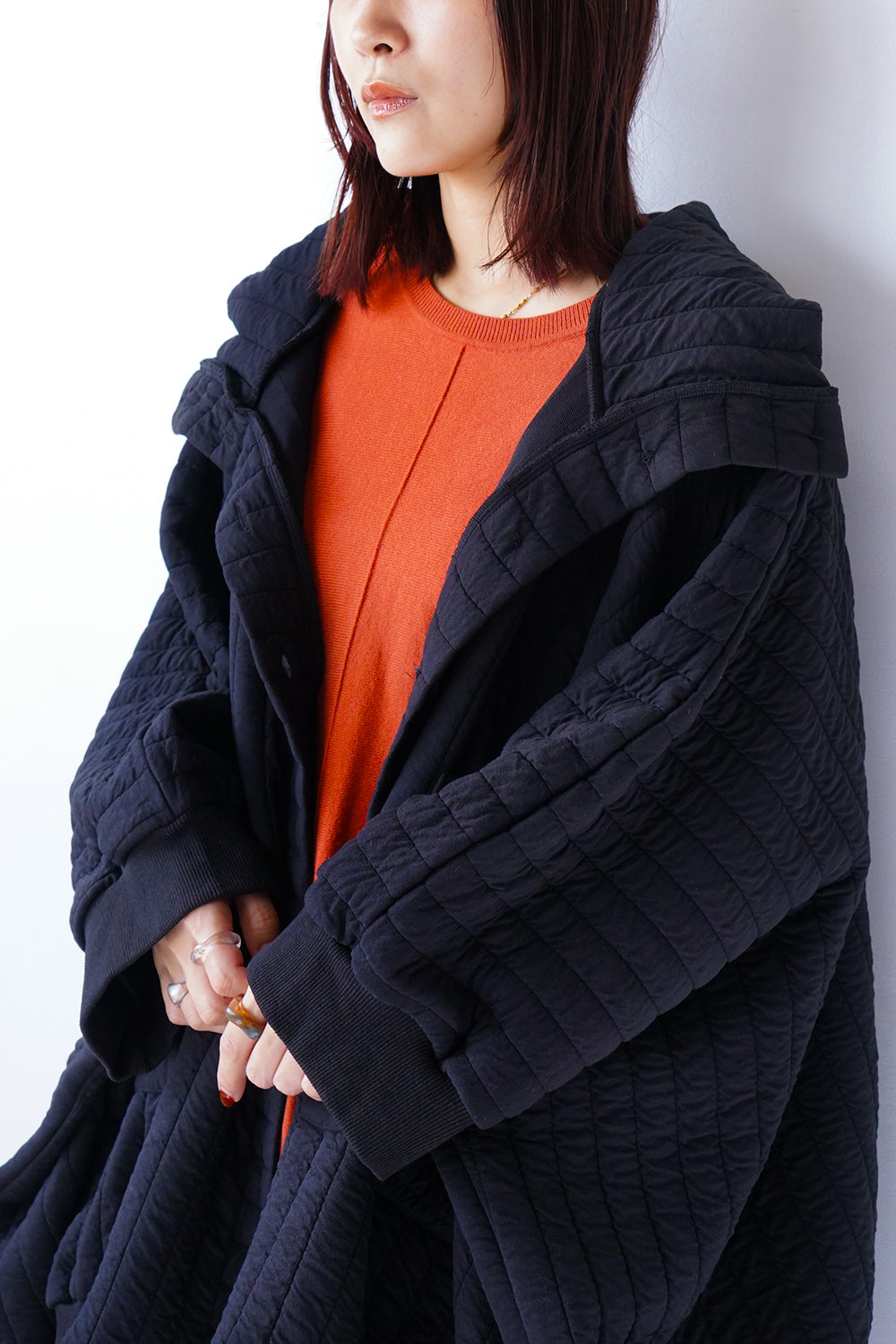 体のラインを拾わないたっぷりシルエットで中にしっかり着込めるサイズ感◎