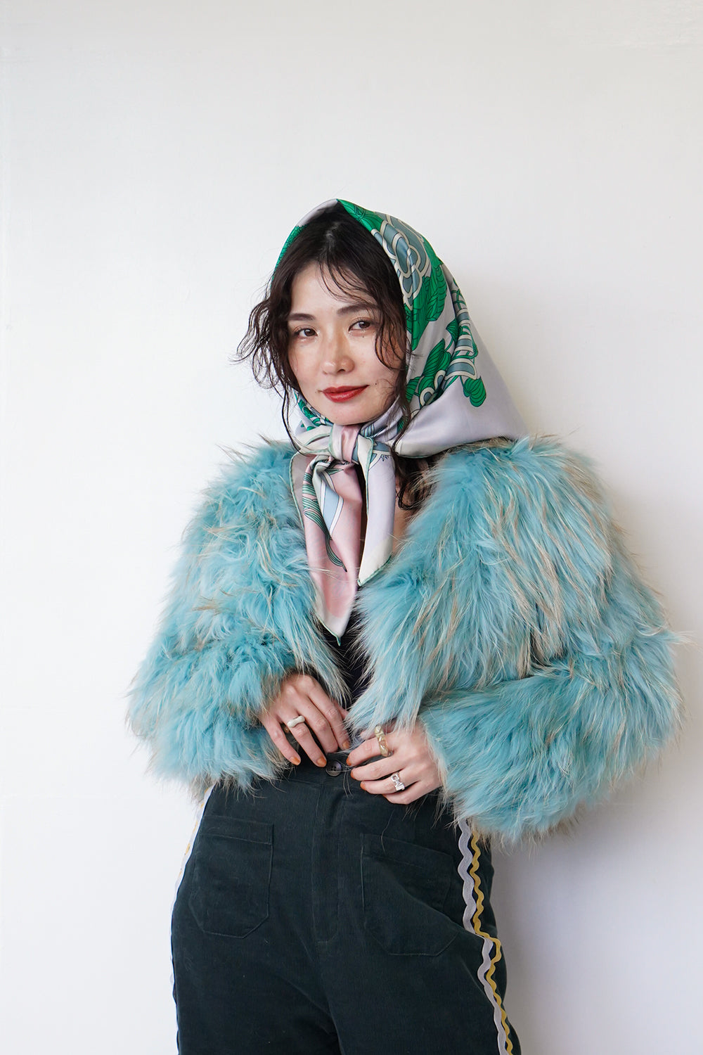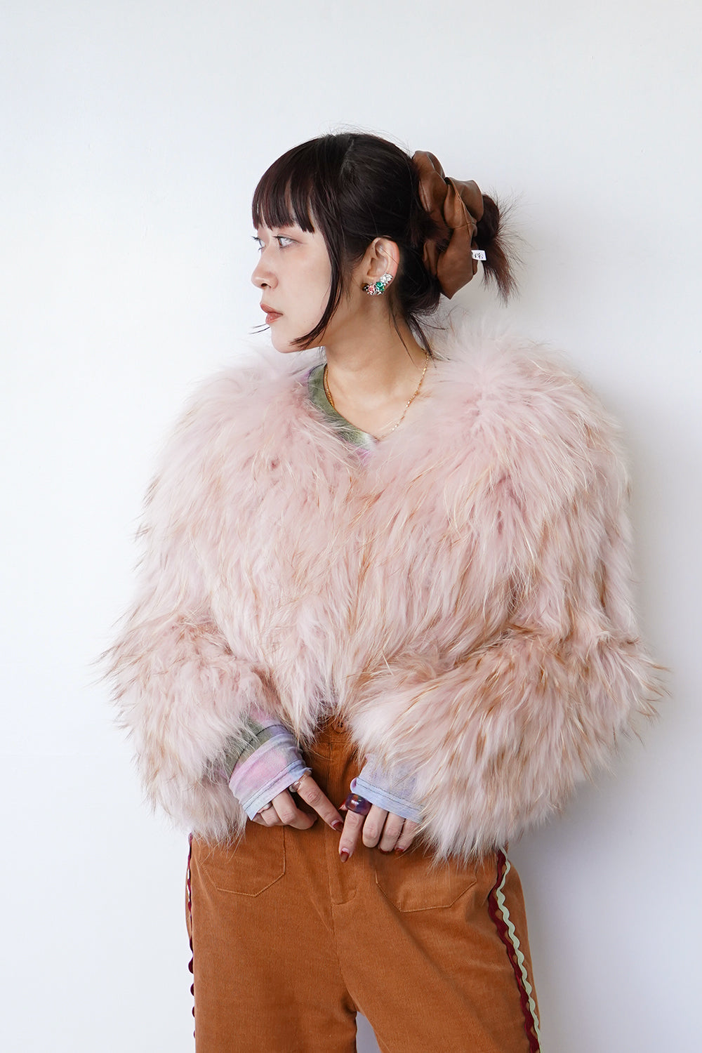 ミックスカラーが印象的なラクーンファーコート。ボリューム感たっぷりでスタイリングの主役級のアイテム♪