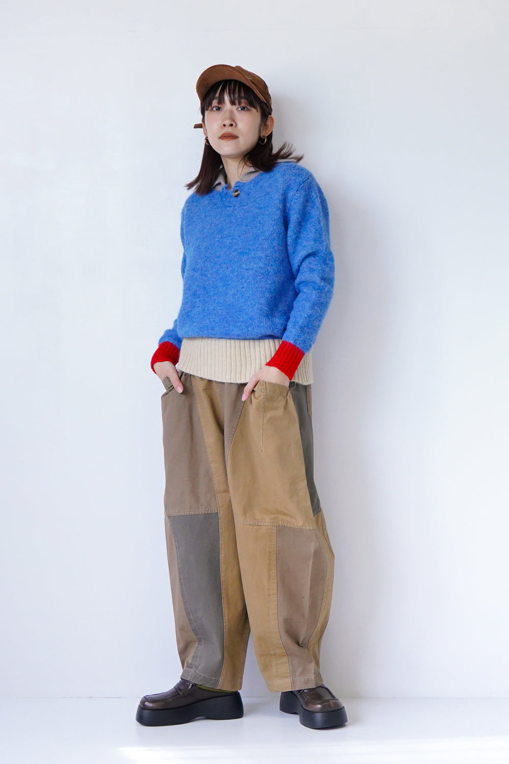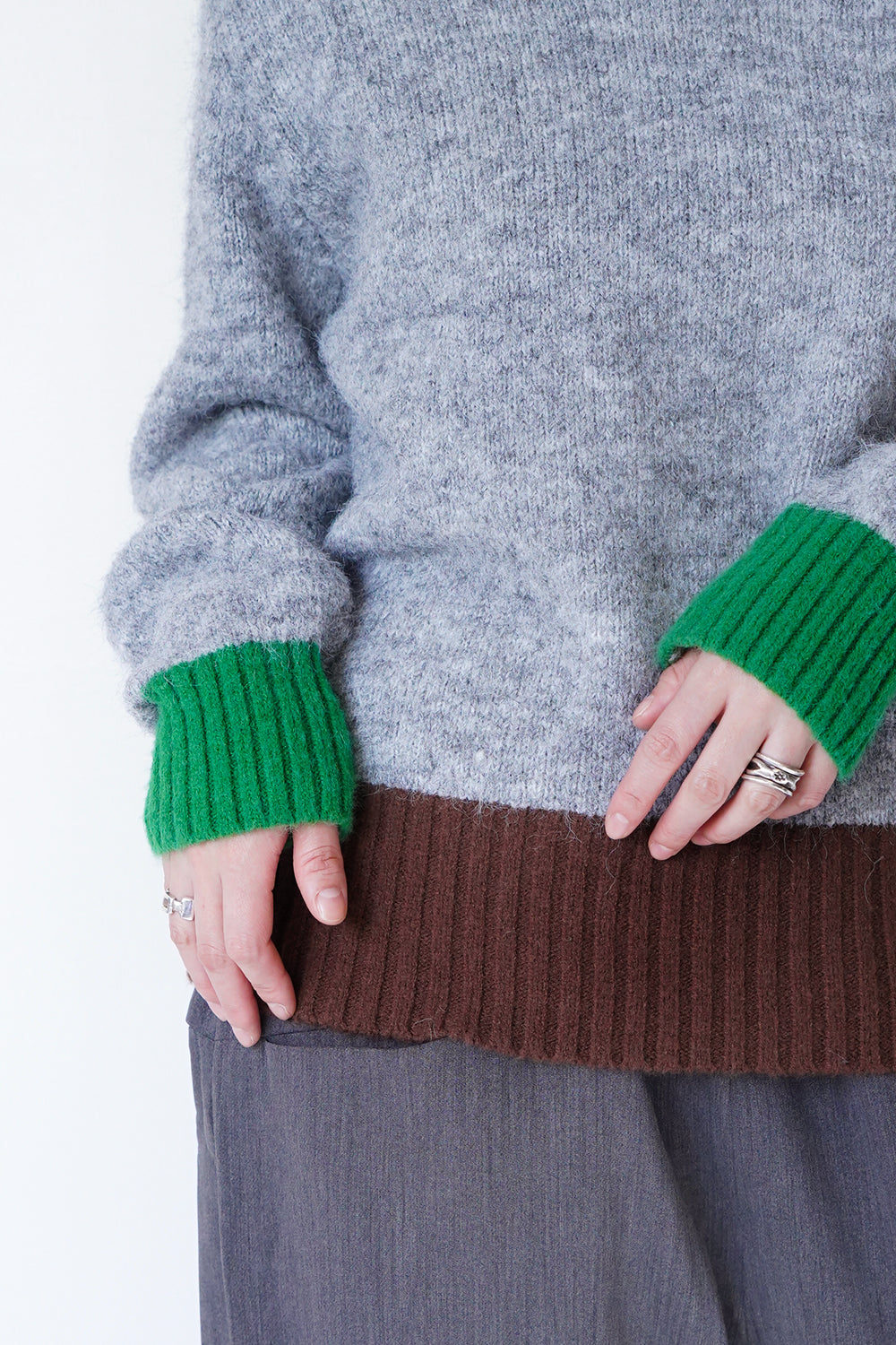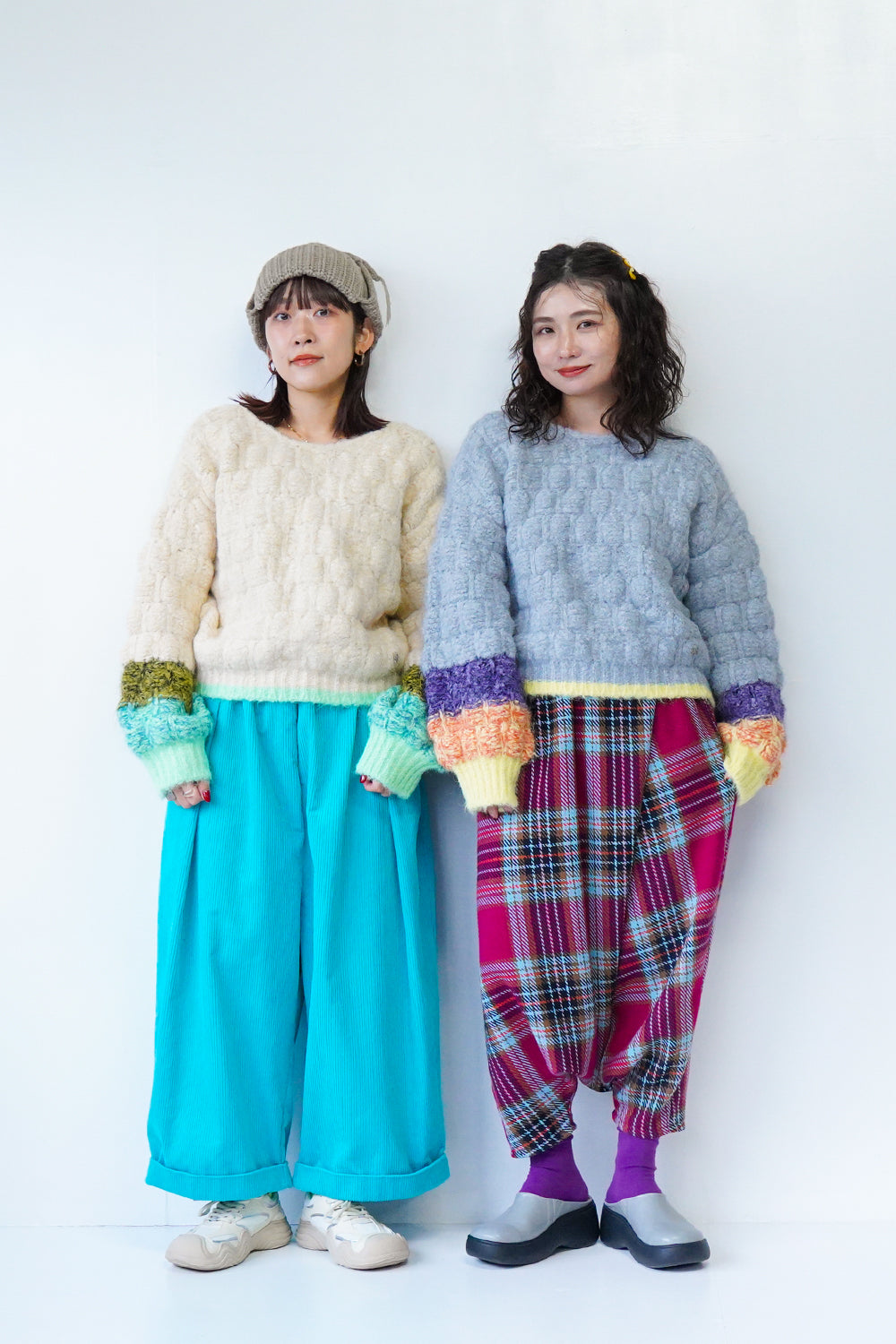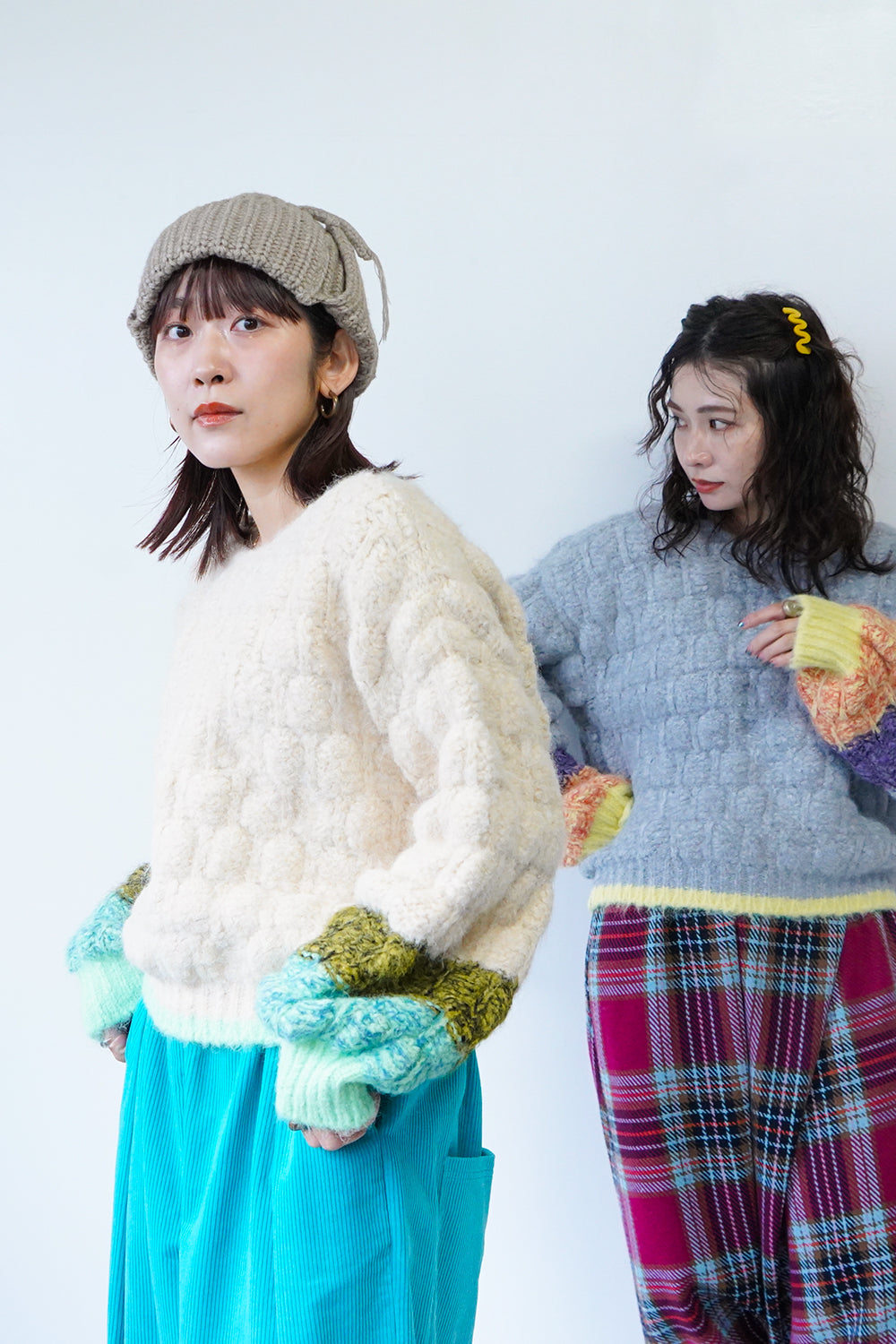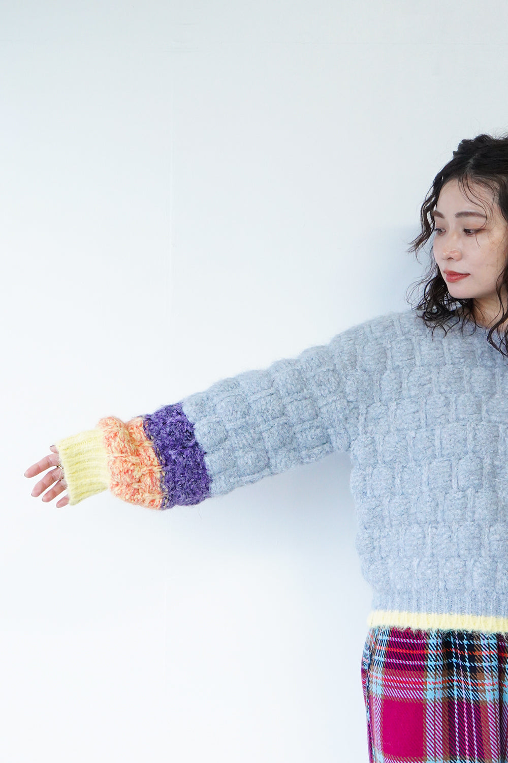 ボリューム感のあるシルエットが印象的な配色ニット。袖の配色カラーによって違った雰囲気を楽しめます。