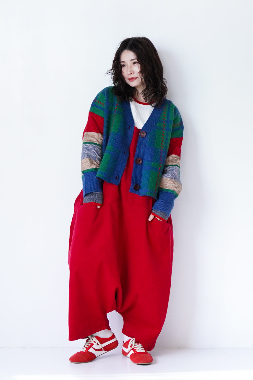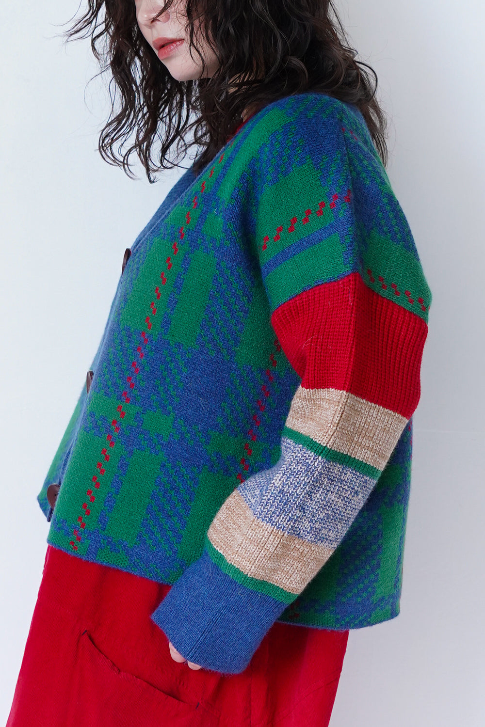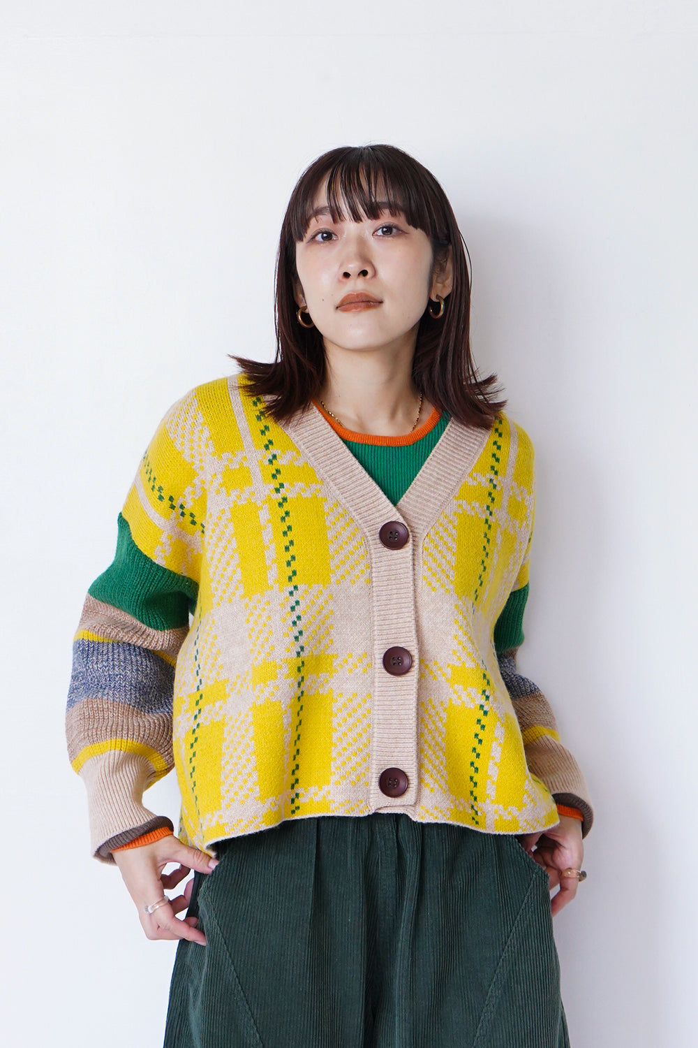 ポップでインパクトのある大柄チェックのニットカーディガン。個性的な配色使いは暗くなりがちな冬のコーデを明るくしてくれます。
