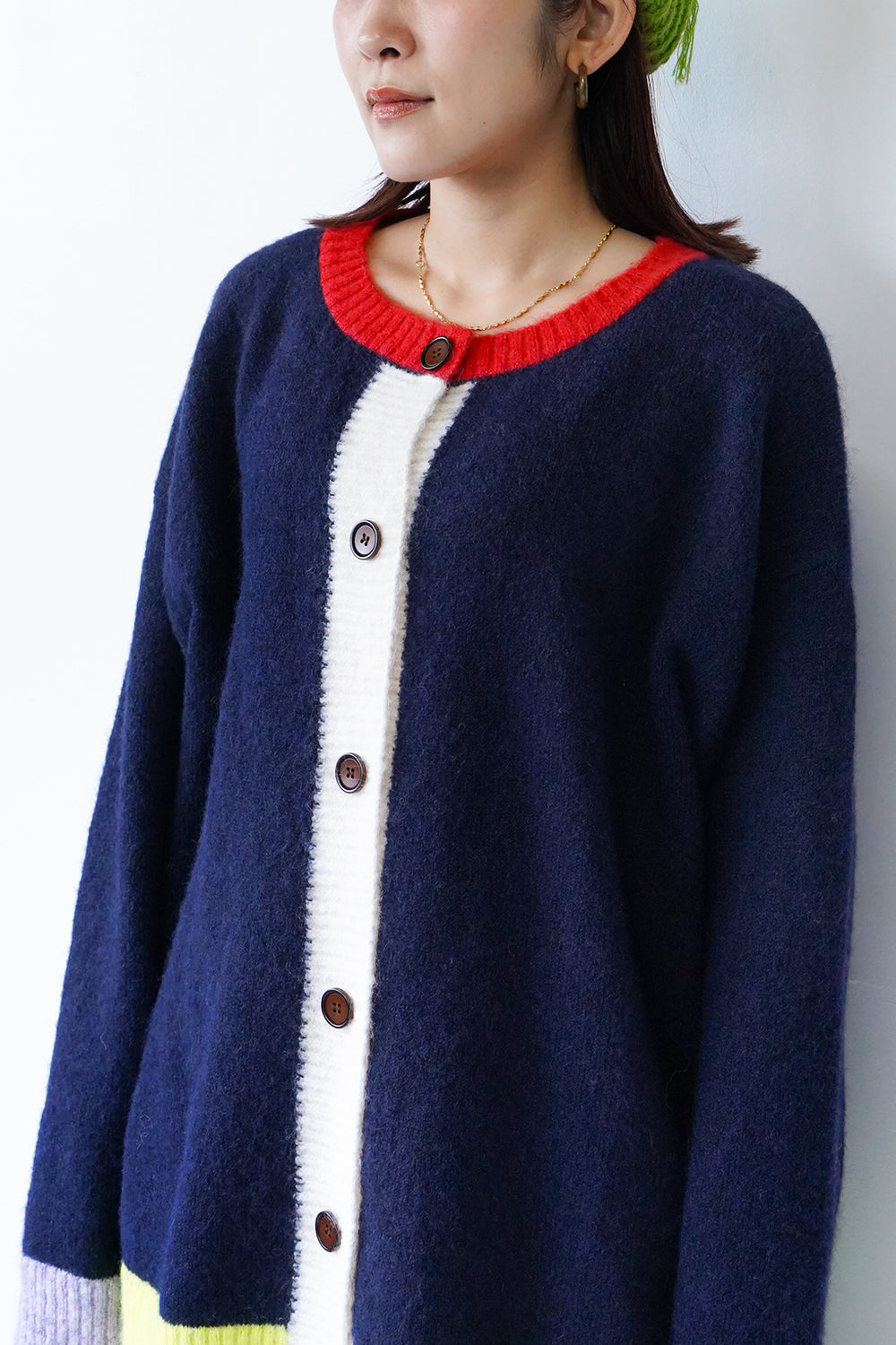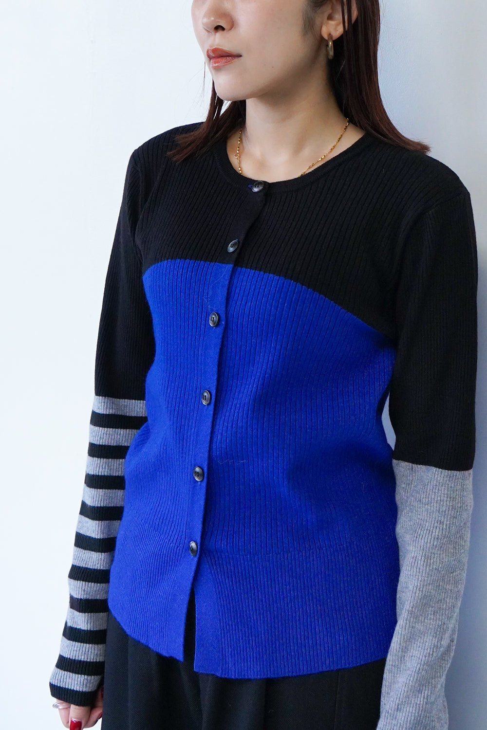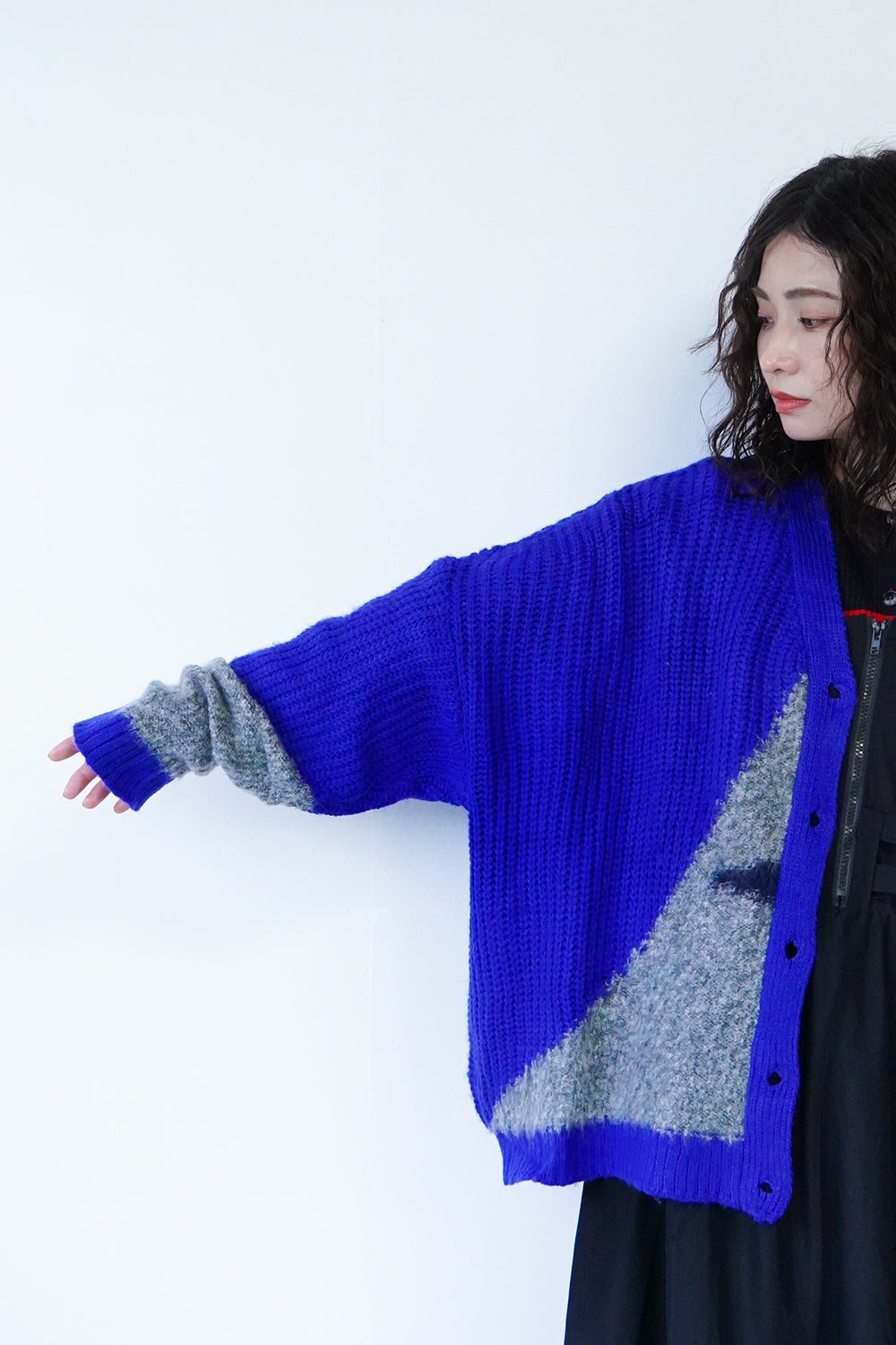 アシンメトリーのデザインが個性的な配色カーディガン。
