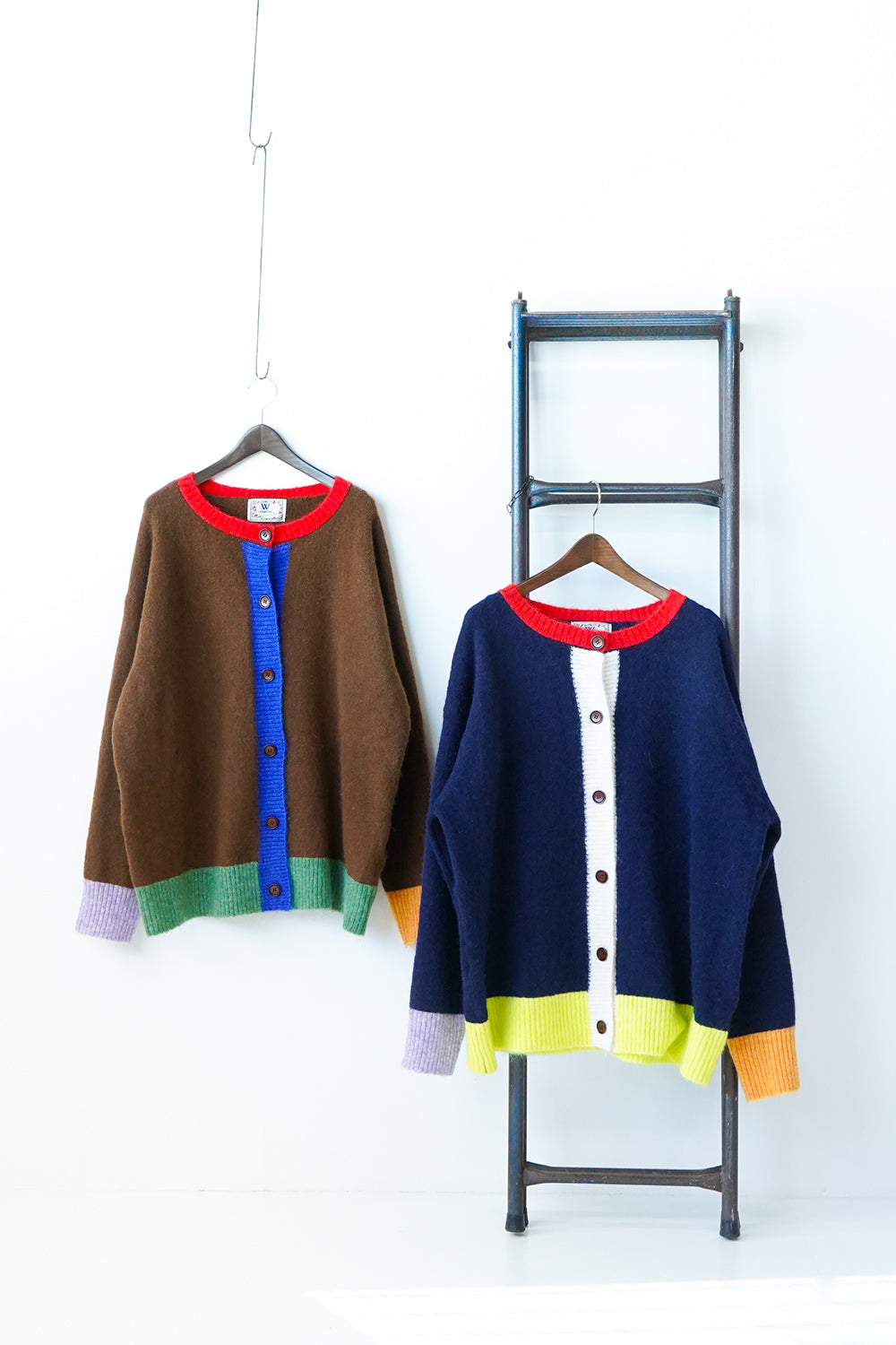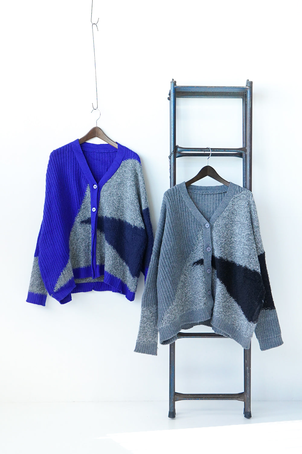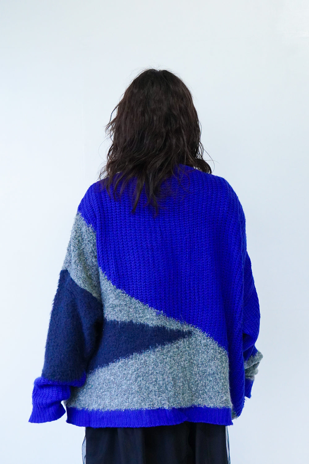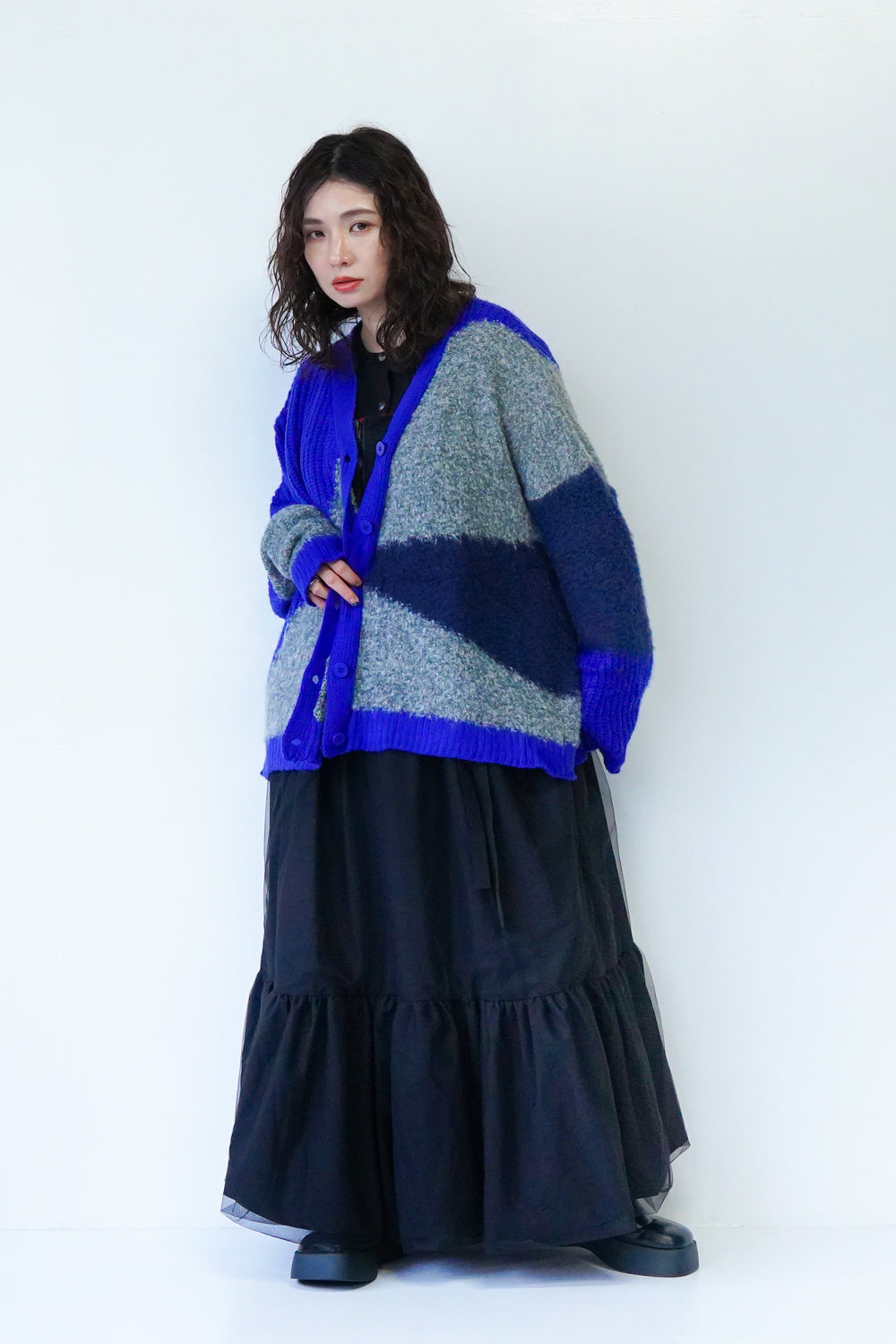 アシンメトリーのデザインが個性的な配色カーディガン。