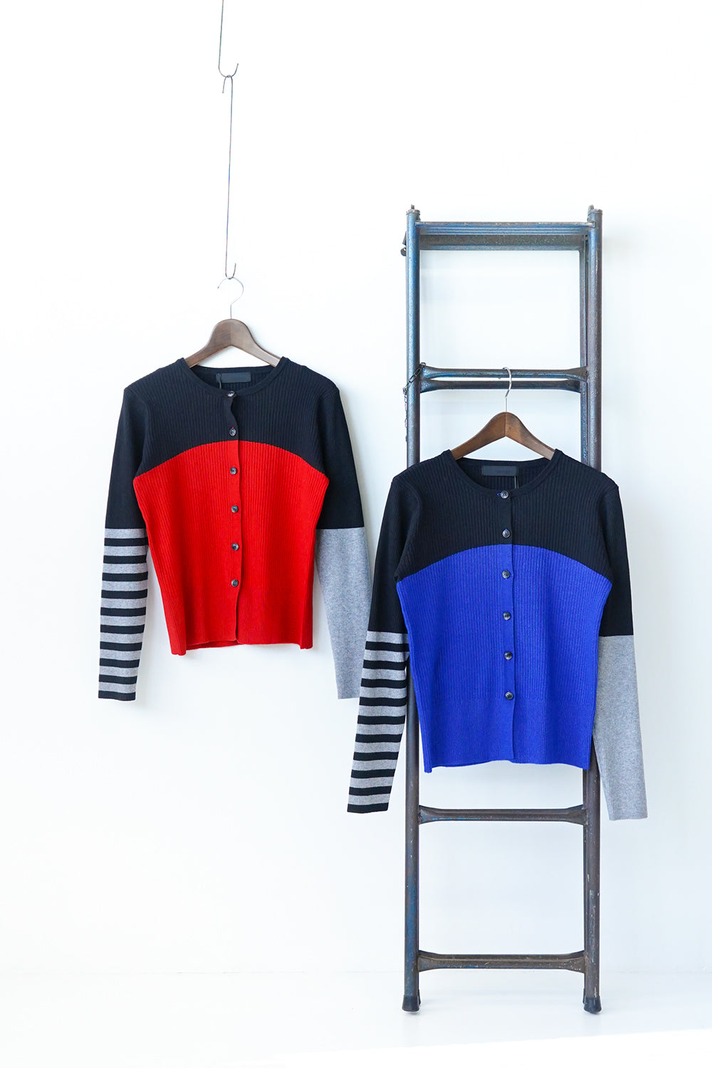 身頃はビスチェ風の切替に、袖は左右で異なるボーダー×無地の掛け合わせがユニークな1枚。ボタンを閉めてトップス感覚で楽しめる1枚です。