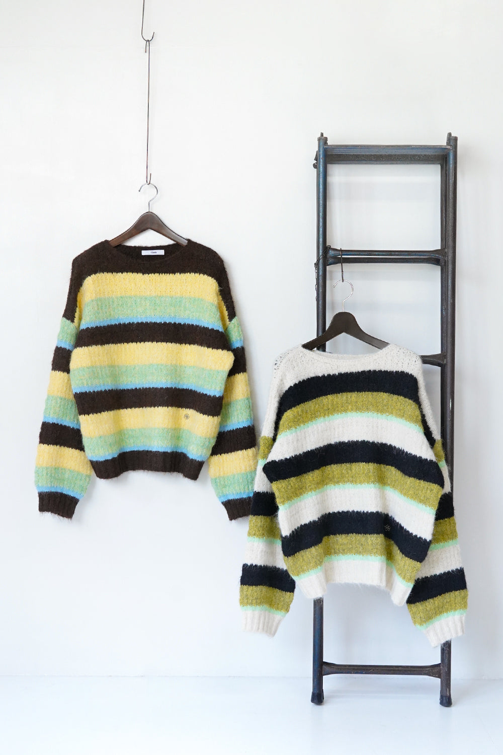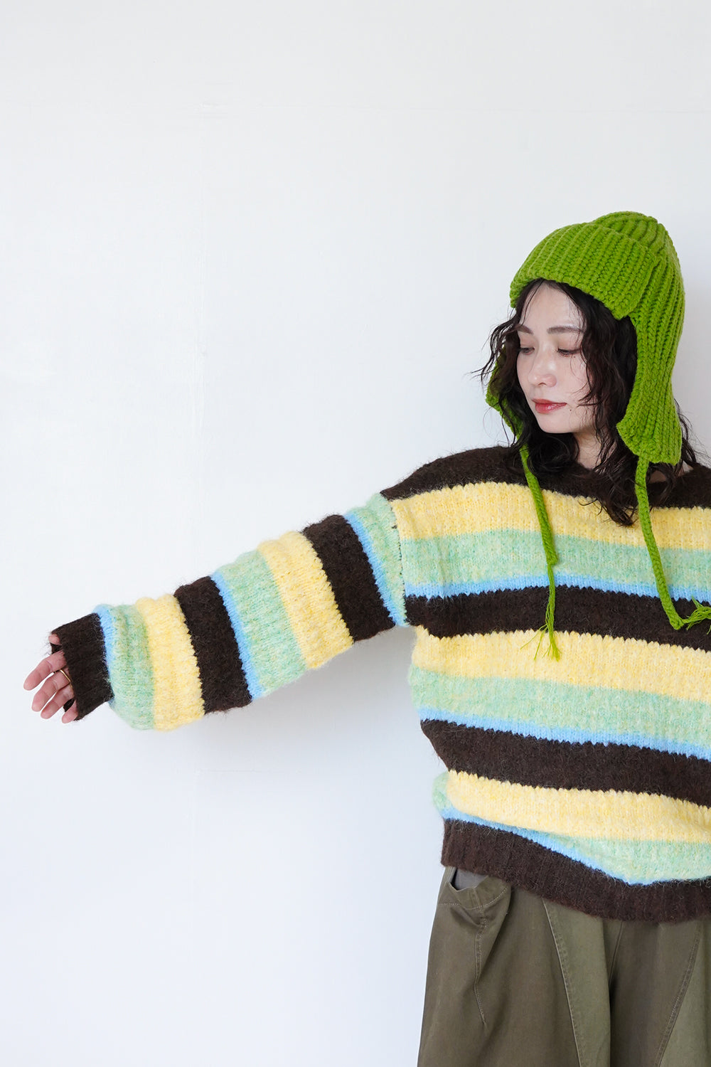 ボリューム感のあるシルエットが印象的なボーダーニット。個性的な配色使いのボーダーラインが珍しい1枚。