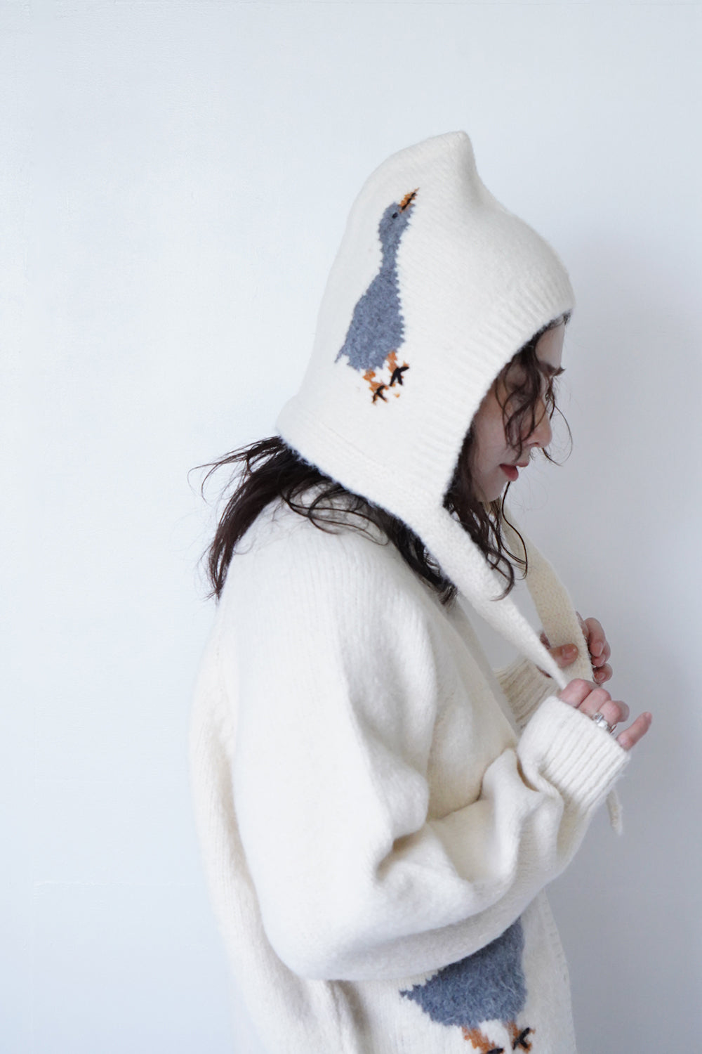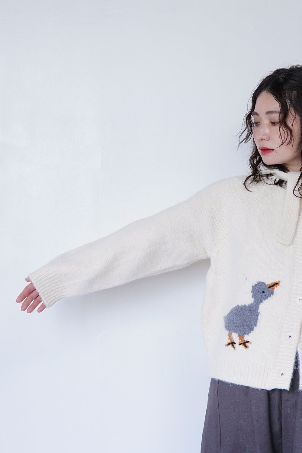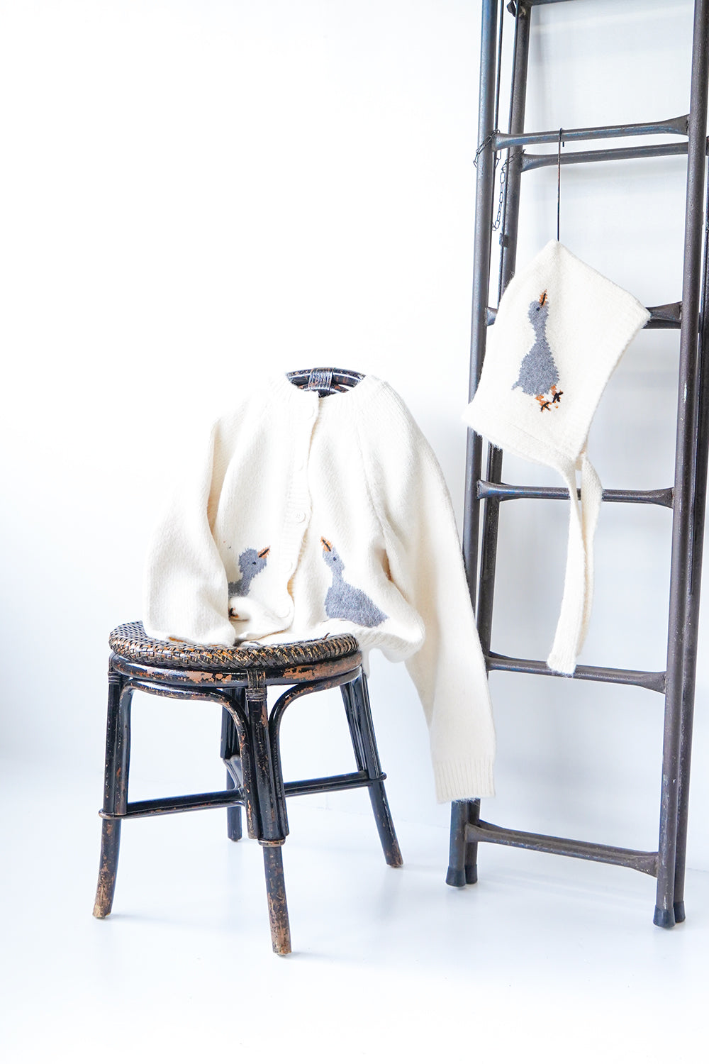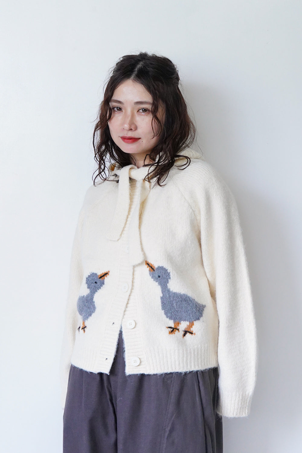 キャッチーな鳥柄がかわいいカーディガンとフードのセットアップ。