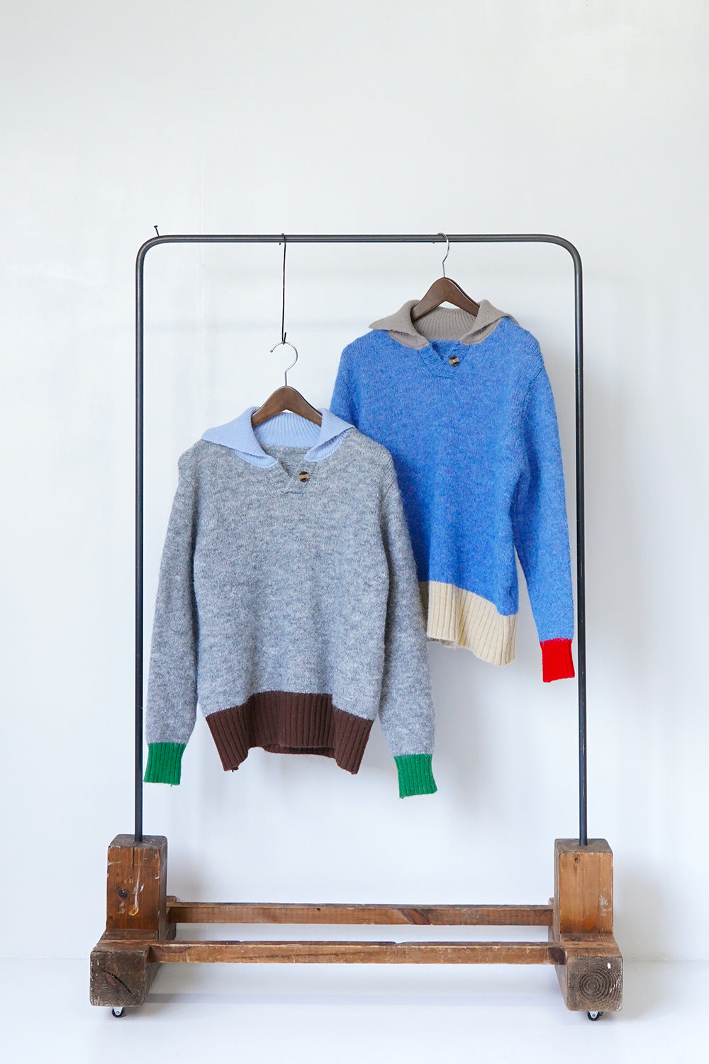 3色使いのポップなカラーが大人かわいい衿付きニット。肌触りのいい柔らかい質感。