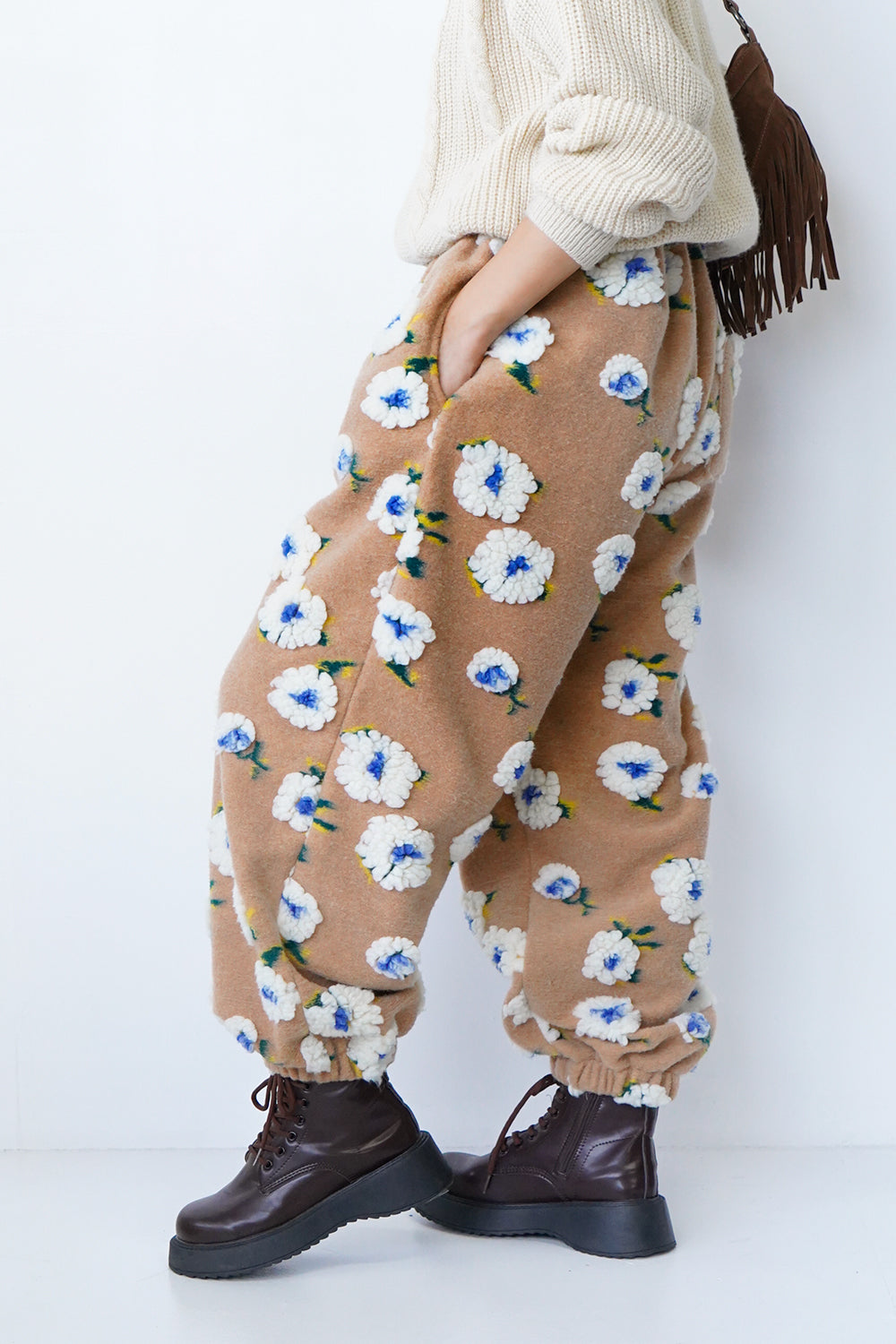 立体的なお花のモチーフが印象的なフリースパンツ。暖かみのあるボア素材のお花がランダムに散りばめられコーデの主役になるアイテム。ウエストはオールゴムで履きやすく、裾もゴム仕様なので防寒性も◎色味によって違う雰囲気のコーデを楽しめます。