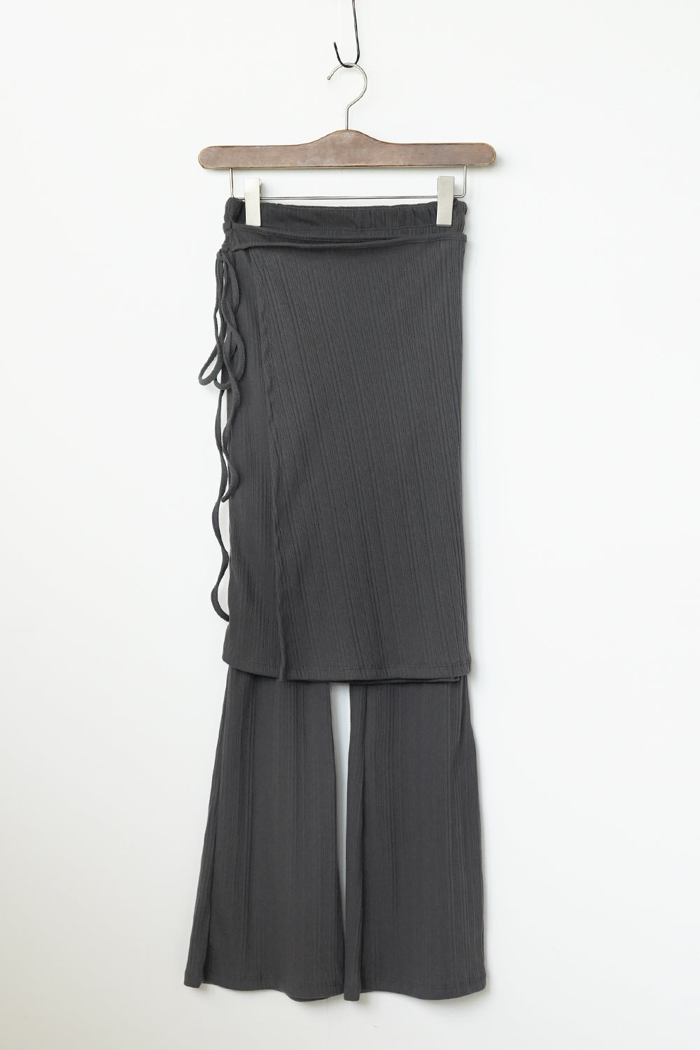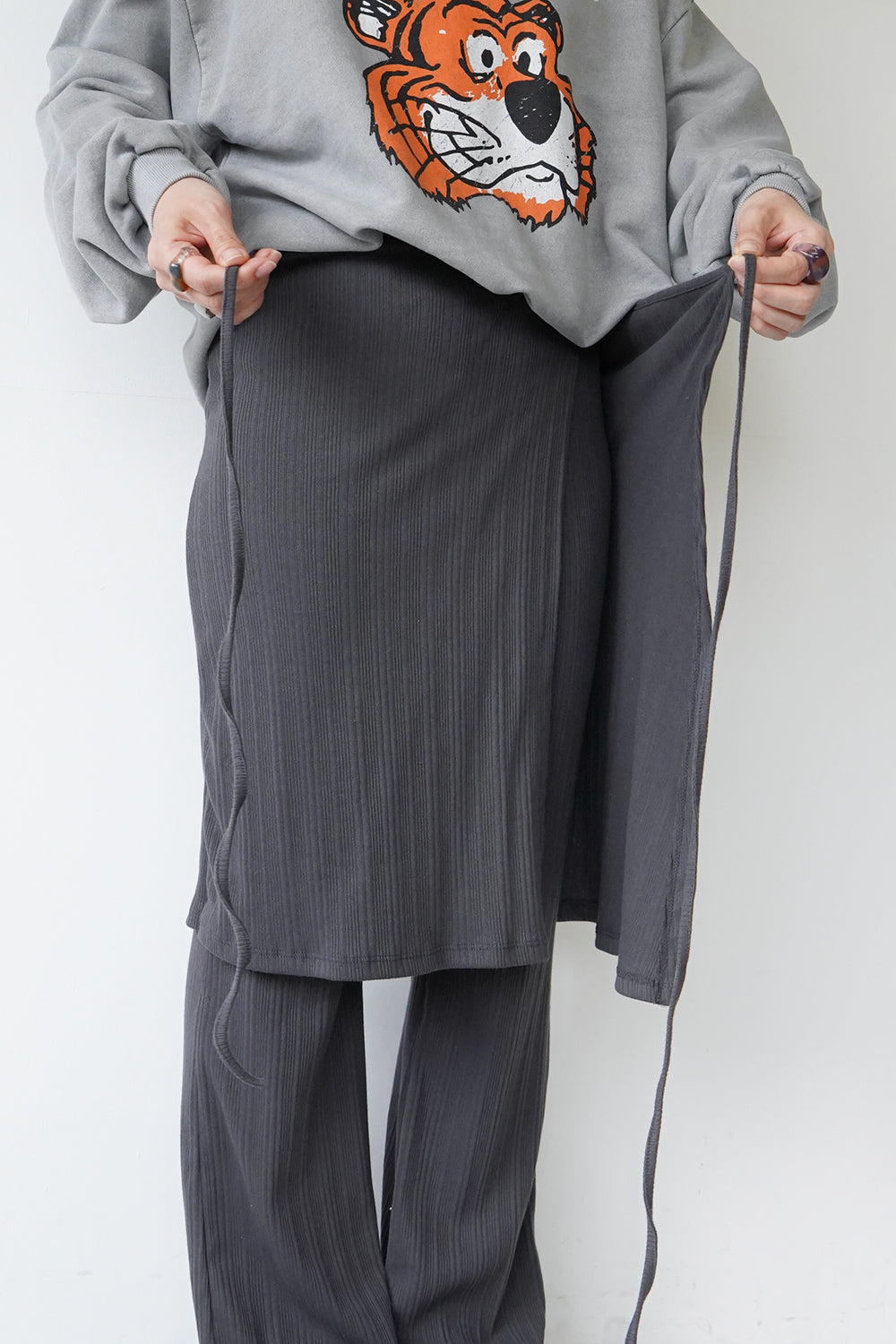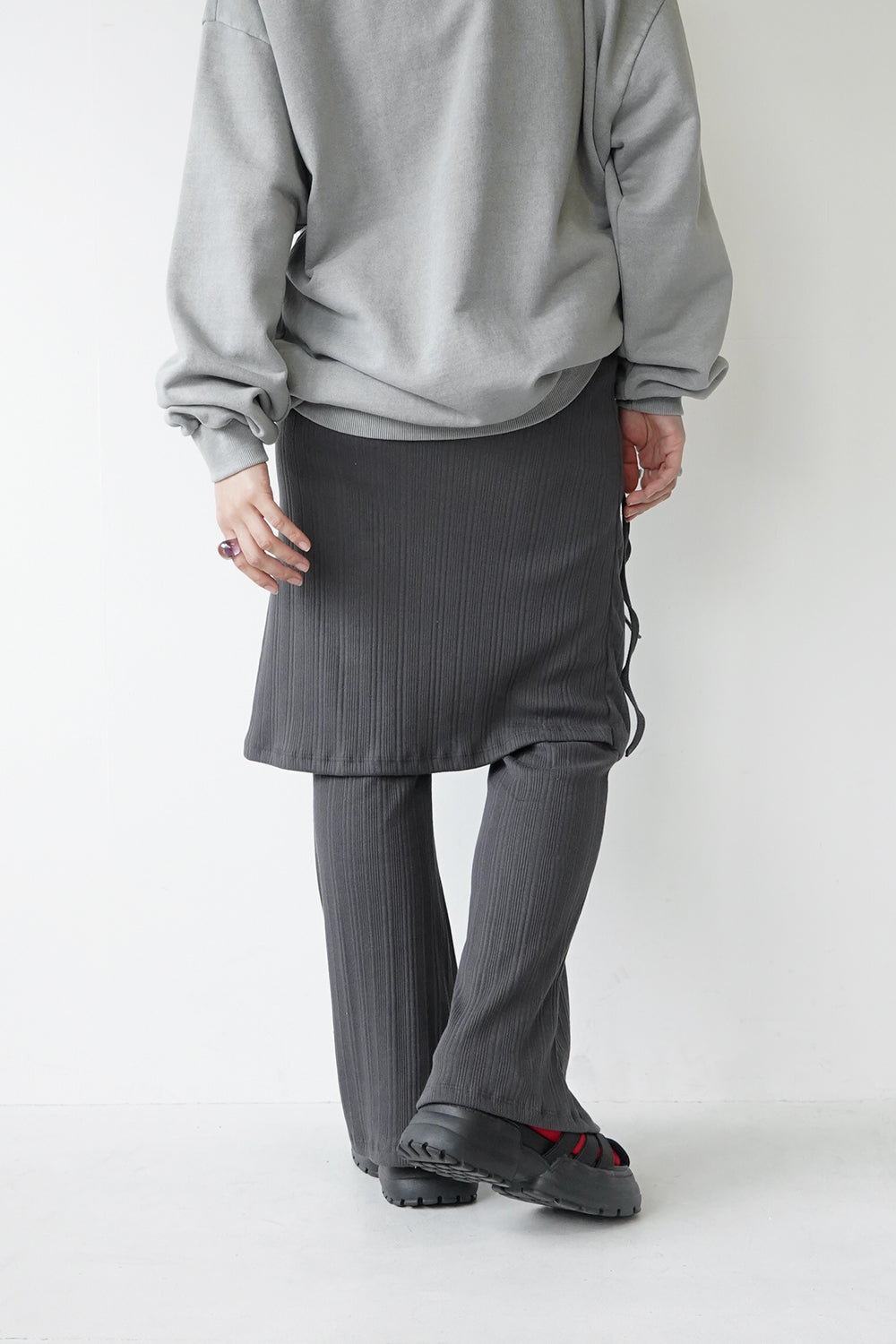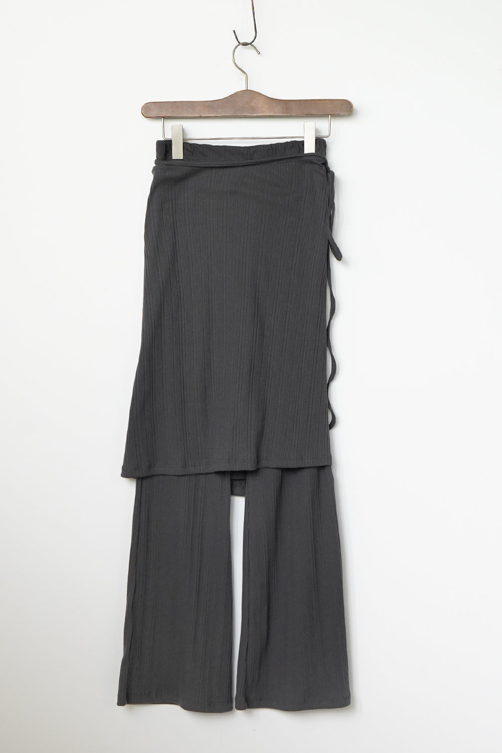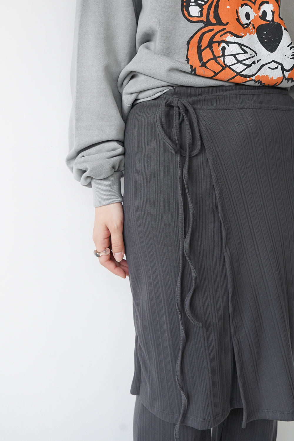 スカートがレイヤードされているリブパンツ。前後のラップスカートが右腰部分にくっついていてぐるりと一周まわして紐で結ぶスタイル。リラックス感のある伸縮素材でウエストはゴム仕様。オーバートップスとの相性が◎細見えする縦ラインと裾にかけたフレアシルエットは女性らしさも兼ね備えたアイテムです。