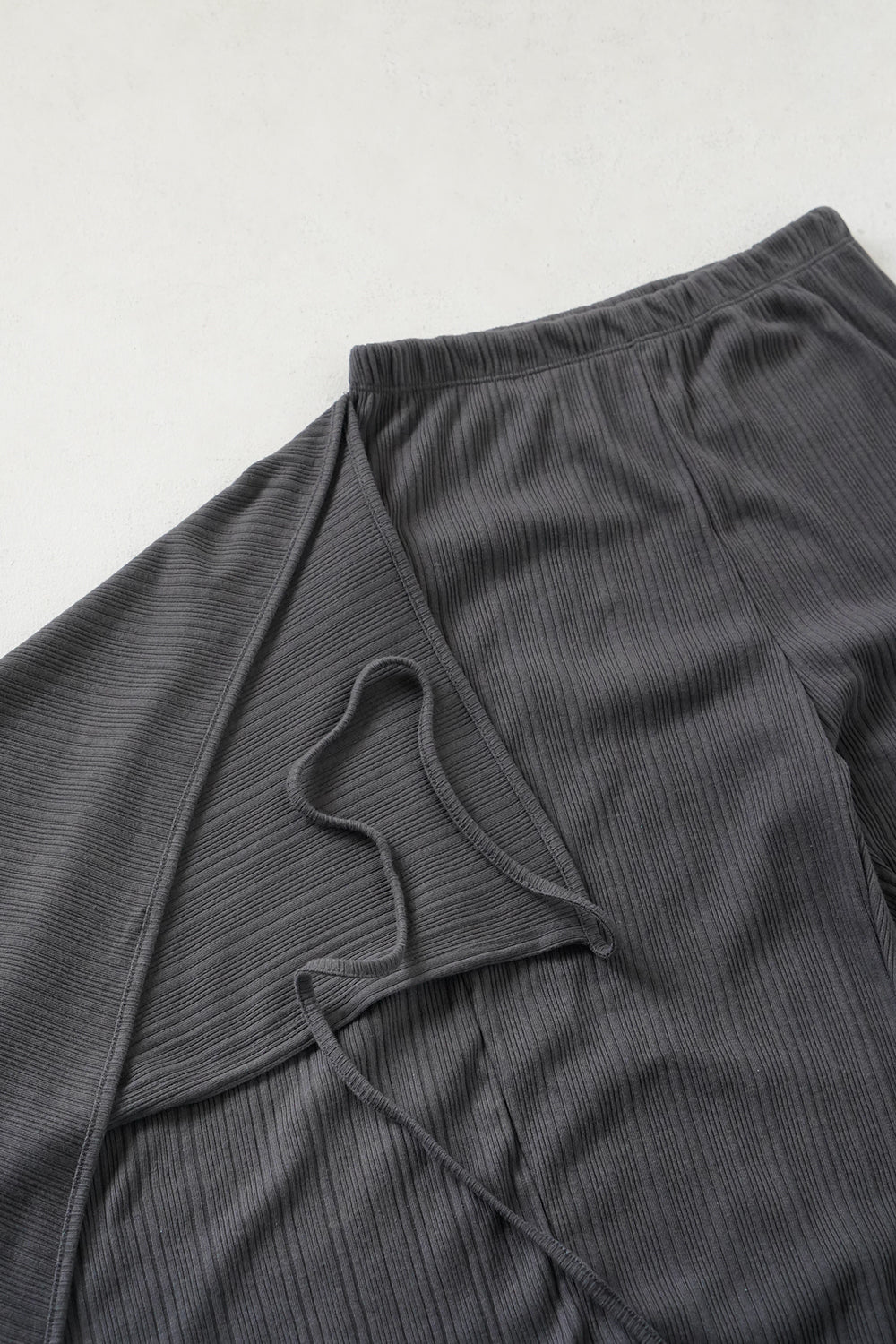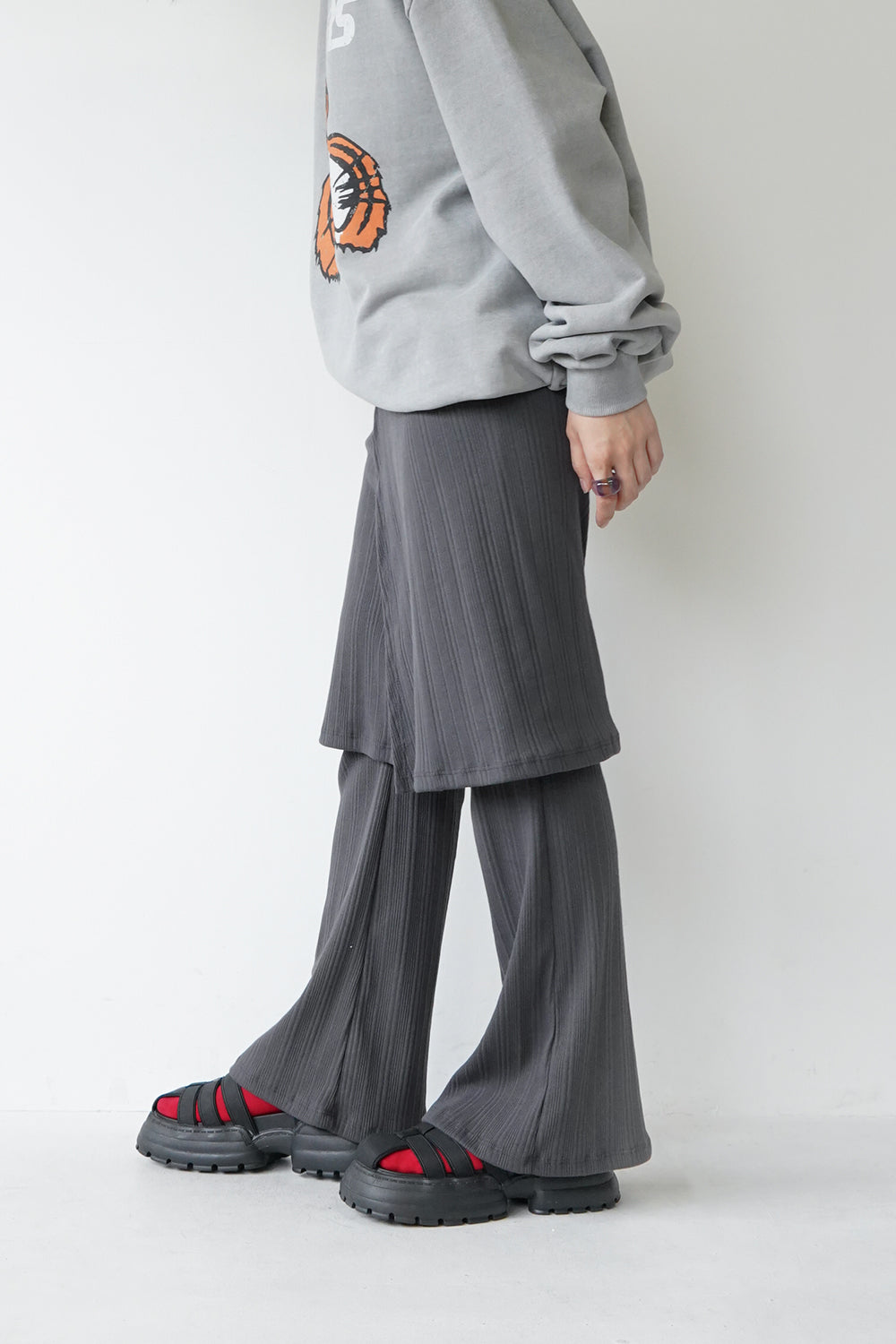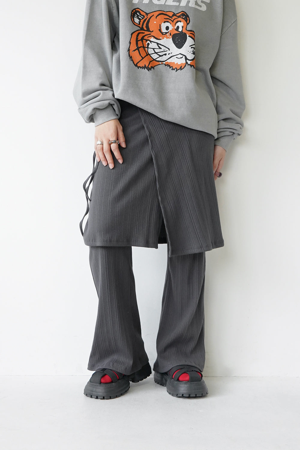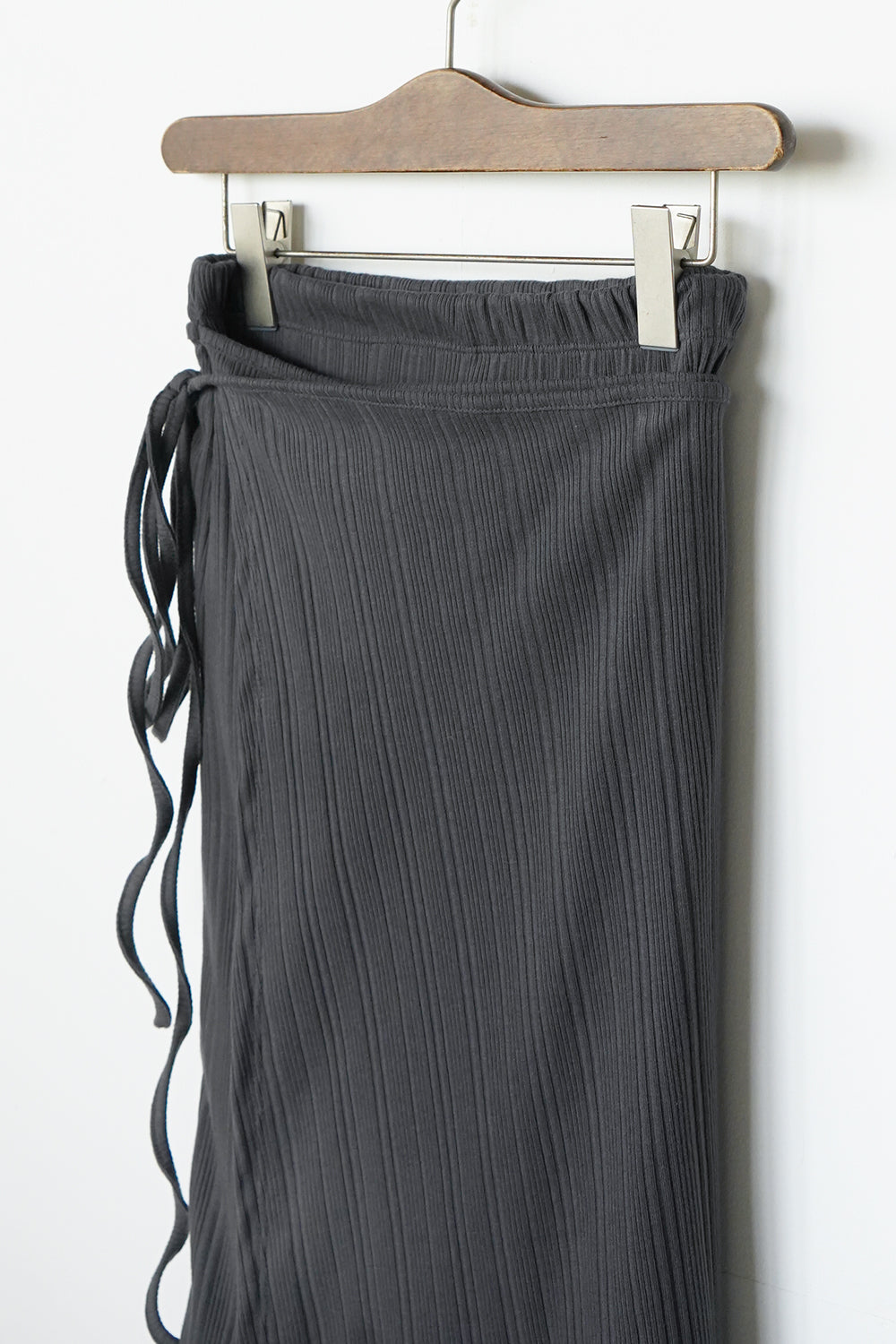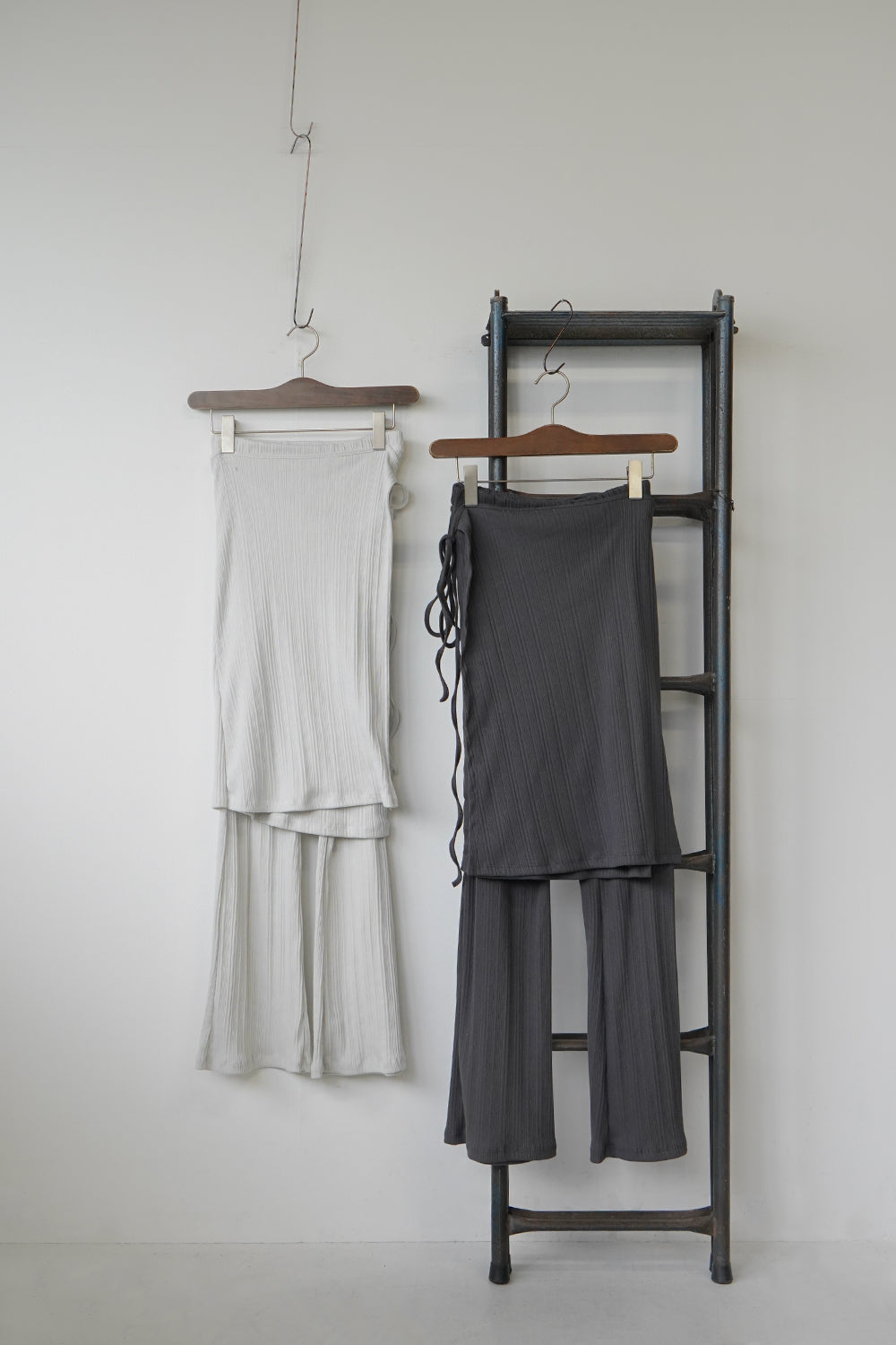 スカートがレイヤードされているリブパンツ。前後のラップスカートが右腰部分にくっついていてぐるりと一周まわして紐で結ぶスタイル。リラックス感のある伸縮素材でウエストはゴム仕様。オーバートップスとの相性が◎細見えする縦ラインと裾にかけたフレアシルエットは女性らしさも兼ね備えたアイテムです。