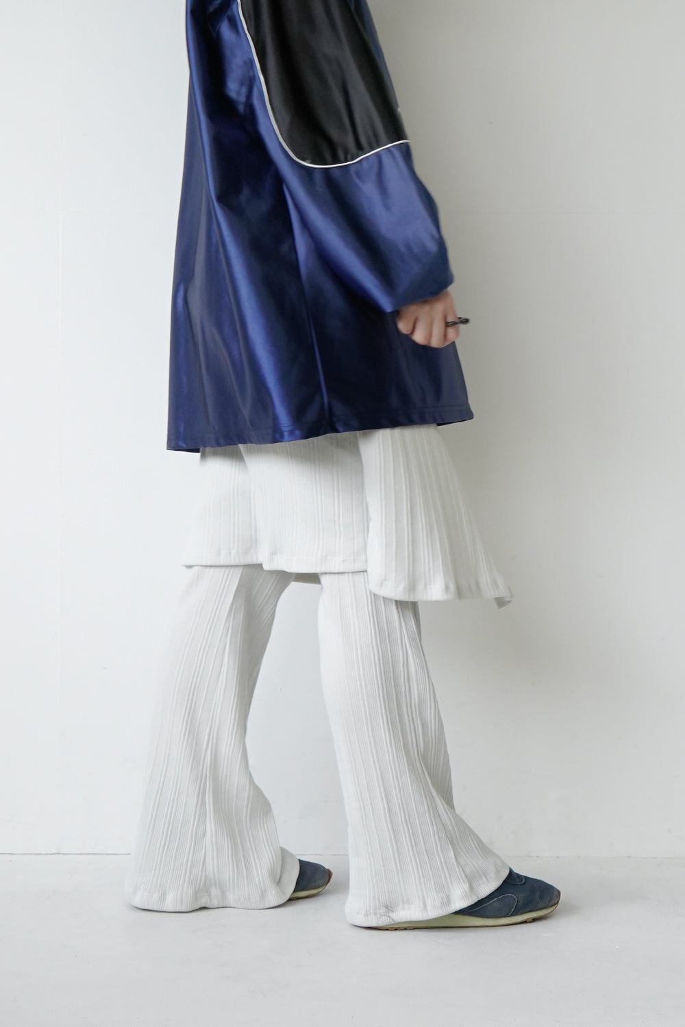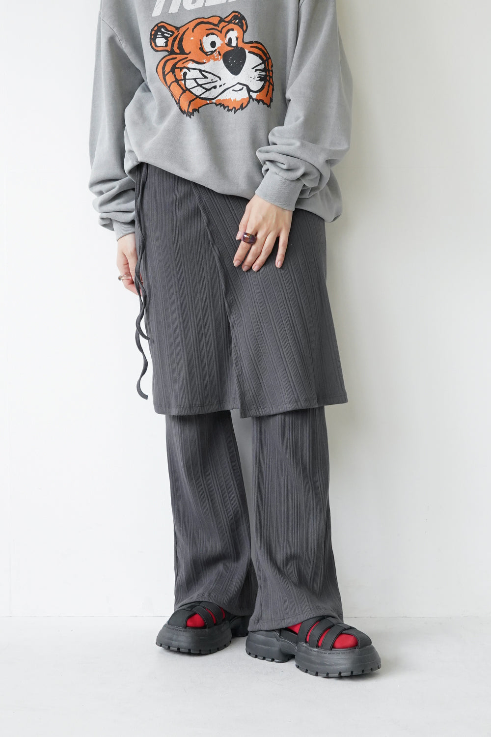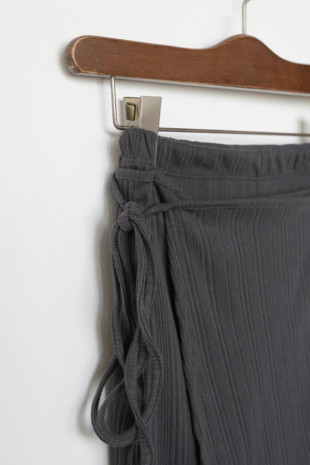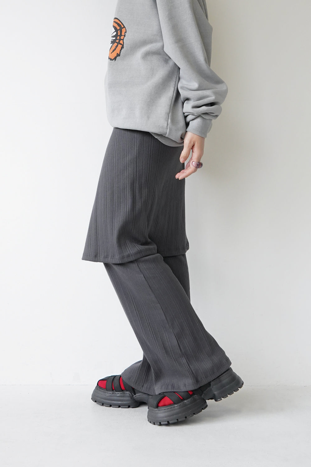 スカートがレイヤードされているリブパンツ。前後のラップスカートが右腰部分にくっついていてぐるりと一周まわして紐で結ぶスタイル。リラックス感のある伸縮素材でウエストはゴム仕様。オーバートップスとの相性が◎細見えする縦ラインと裾にかけたフレアシルエットは女性らしさも兼ね備えたアイテムです。