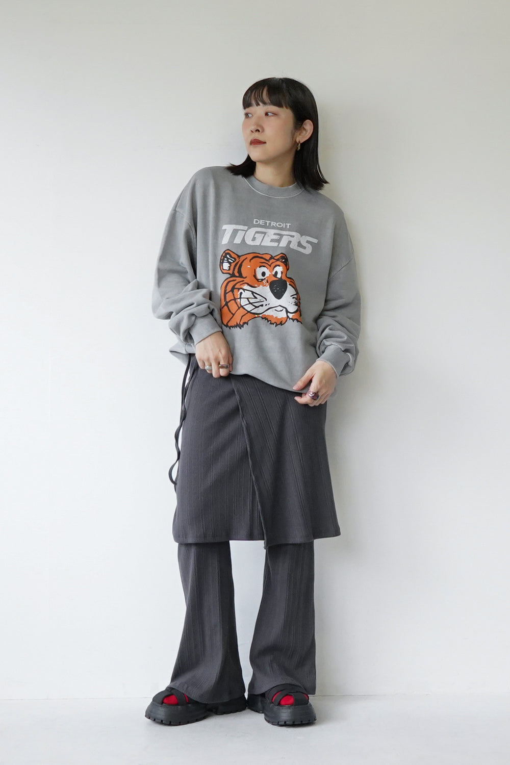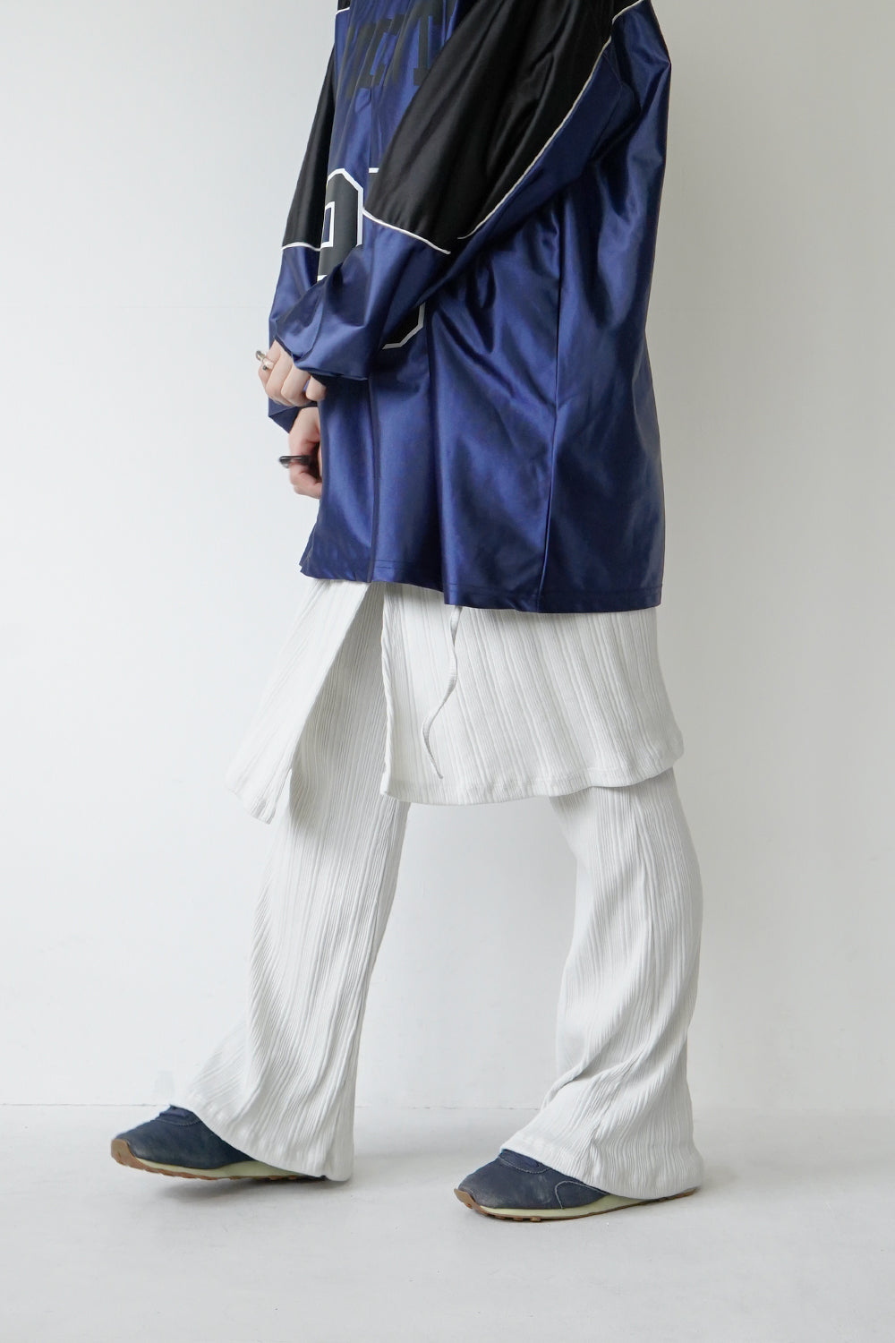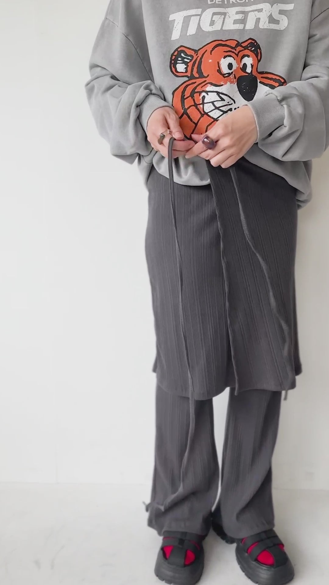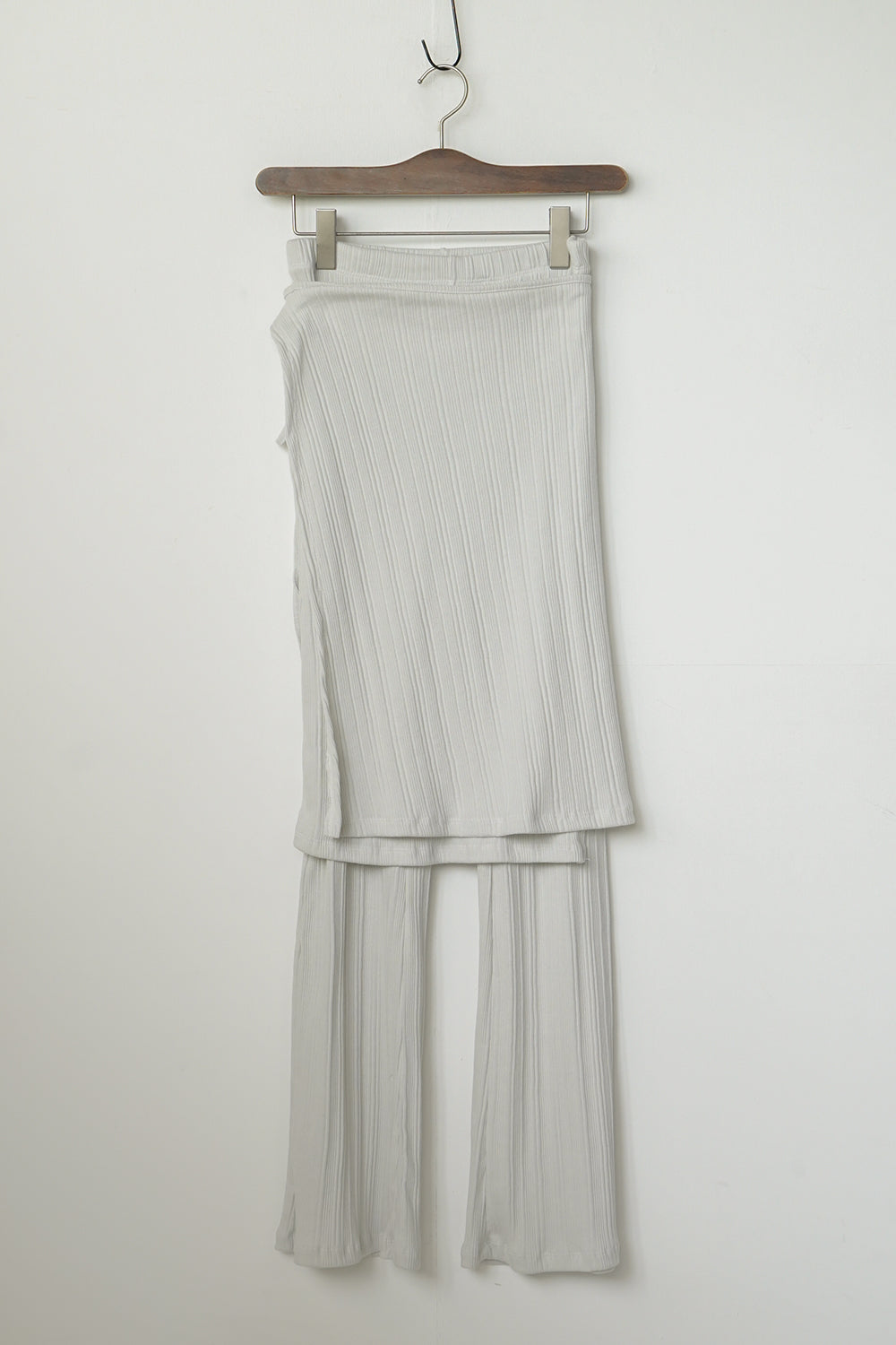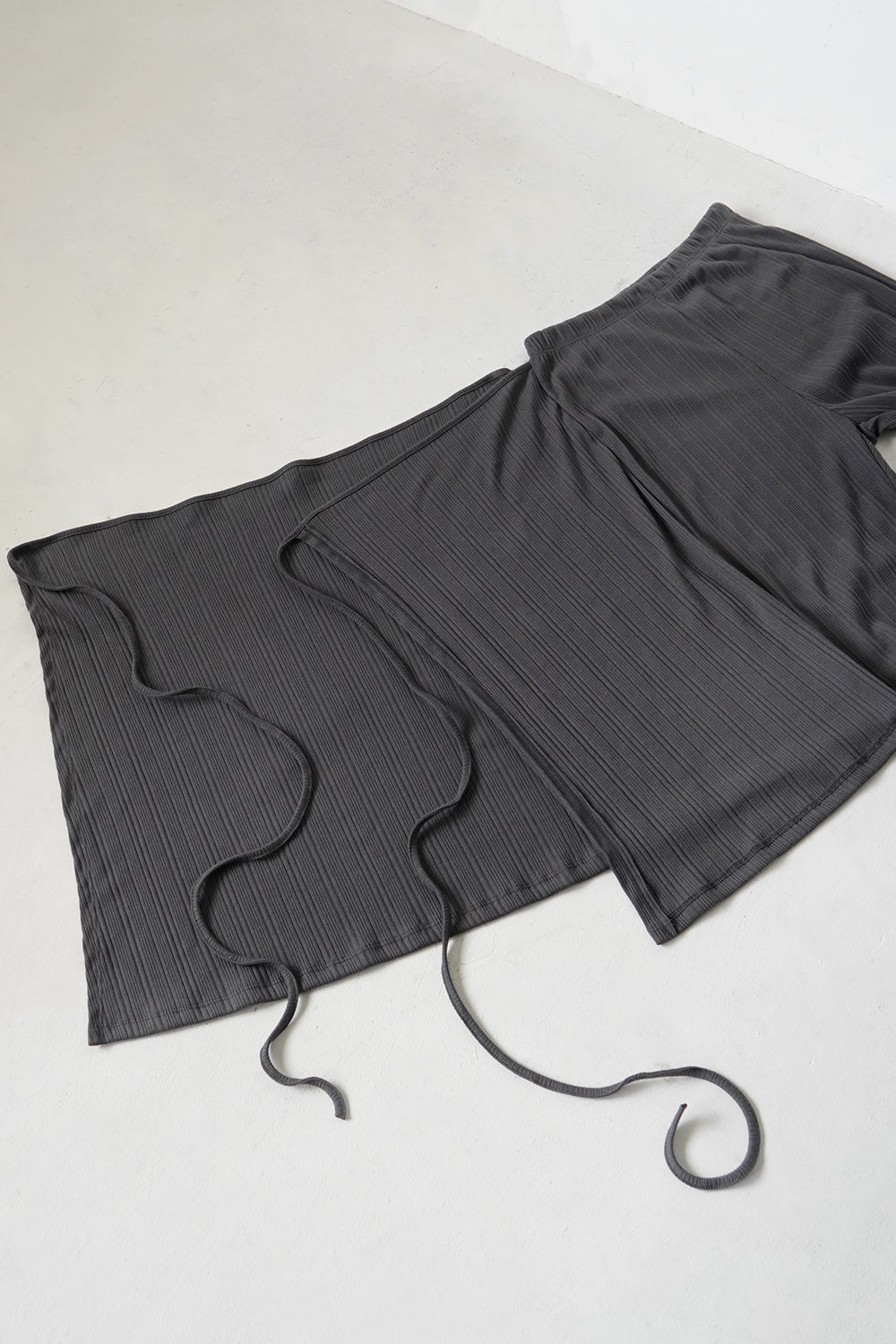 スカートがレイヤードされているリブパンツ。前後のラップスカートが右腰部分にくっついていてぐるりと一周まわして紐で結ぶスタイル。リラックス感のある伸縮素材でウエストはゴム仕様。オーバートップスとの相性が◎細見えする縦ラインと裾にかけたフレアシルエットは女性らしさも兼ね備えたアイテムです。