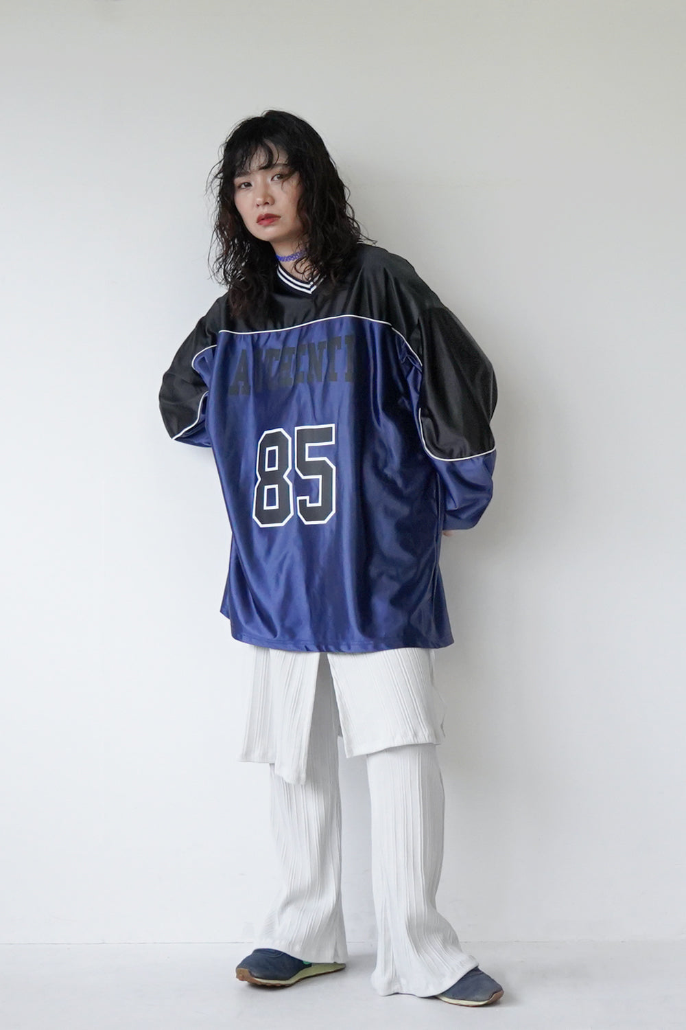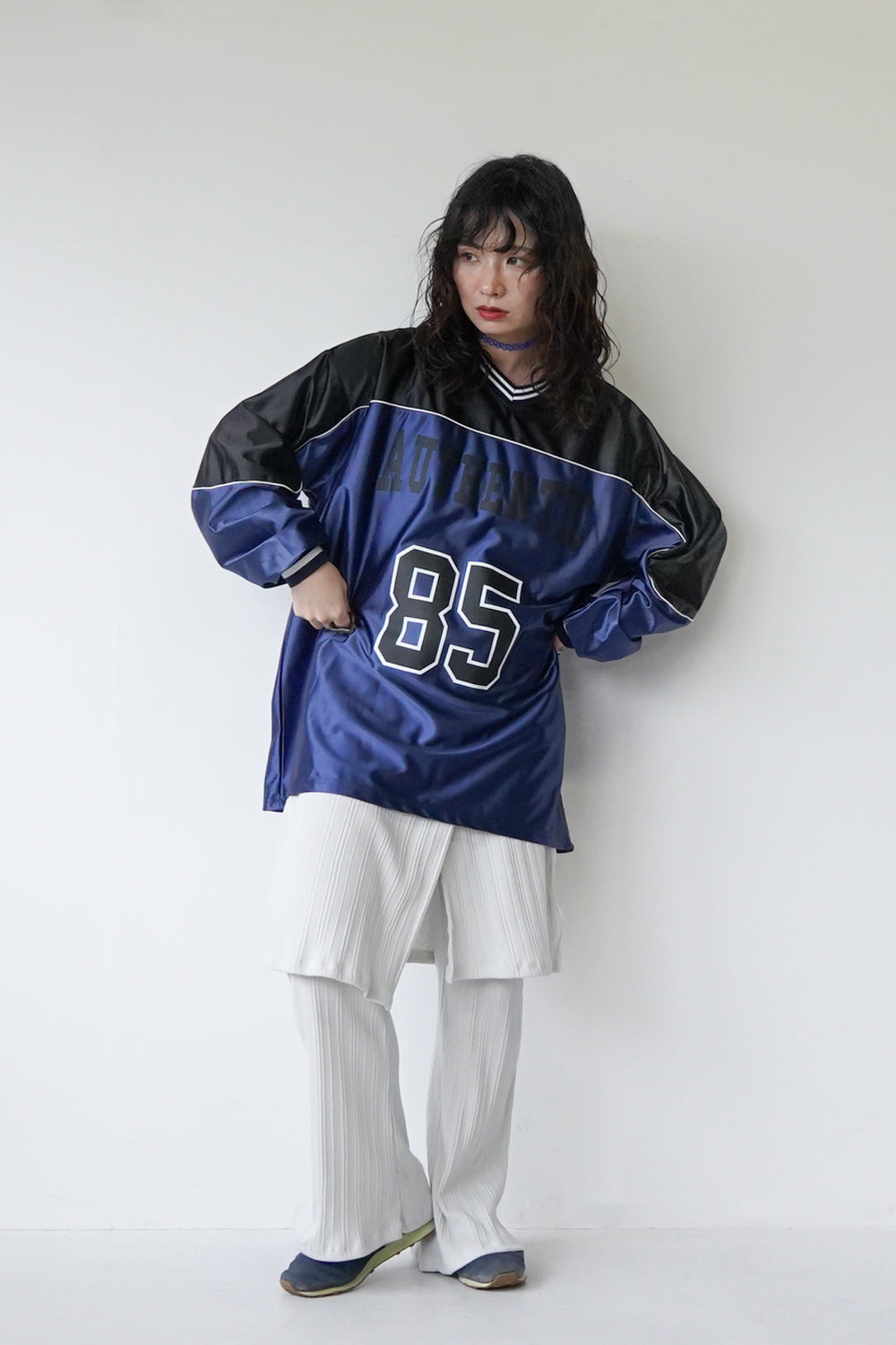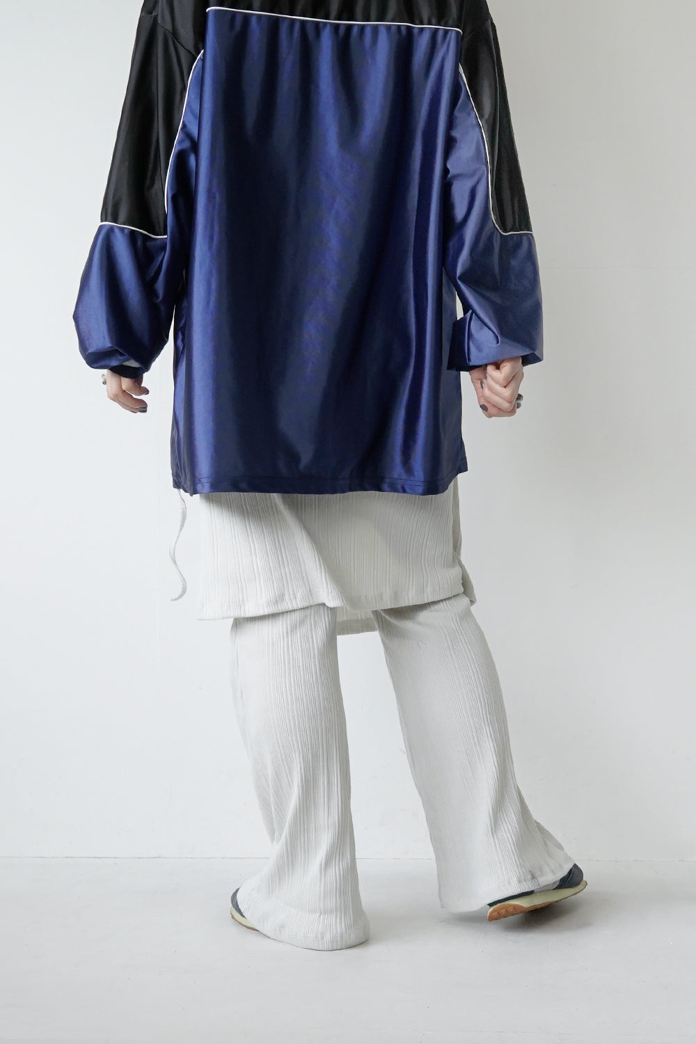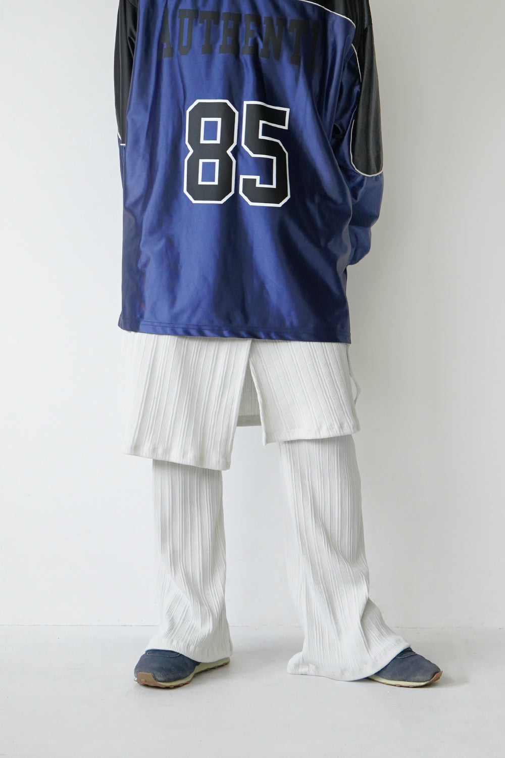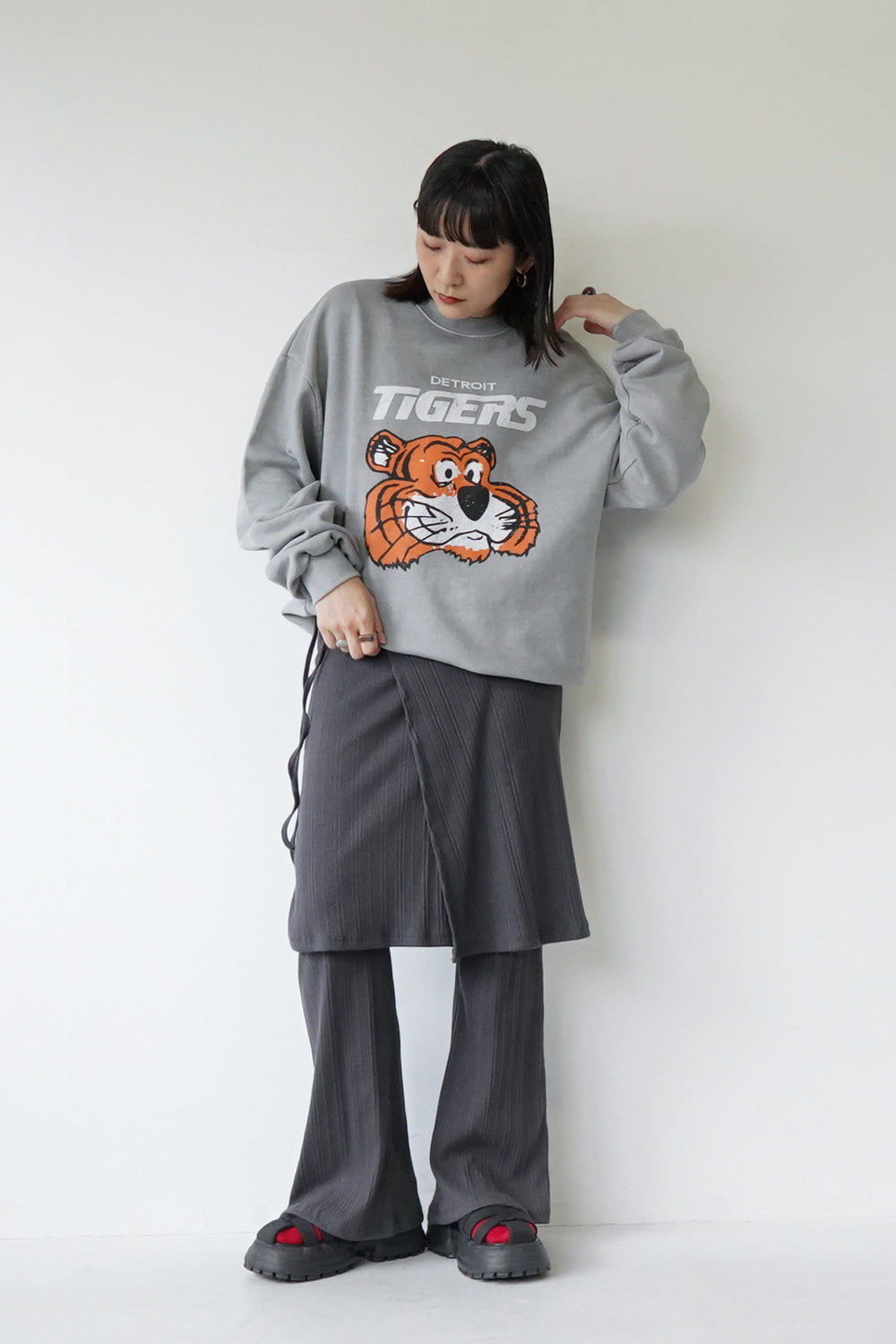 スカートがレイヤードされているリブパンツ。前後のラップスカートが右腰部分にくっついていてぐるりと一周まわして紐で結ぶスタイル。リラックス感のある伸縮素材でウエストはゴム仕様。オーバートップスとの相性が◎細見えする縦ラインと裾にかけたフレアシルエットは女性らしさも兼ね備えたアイテムです。