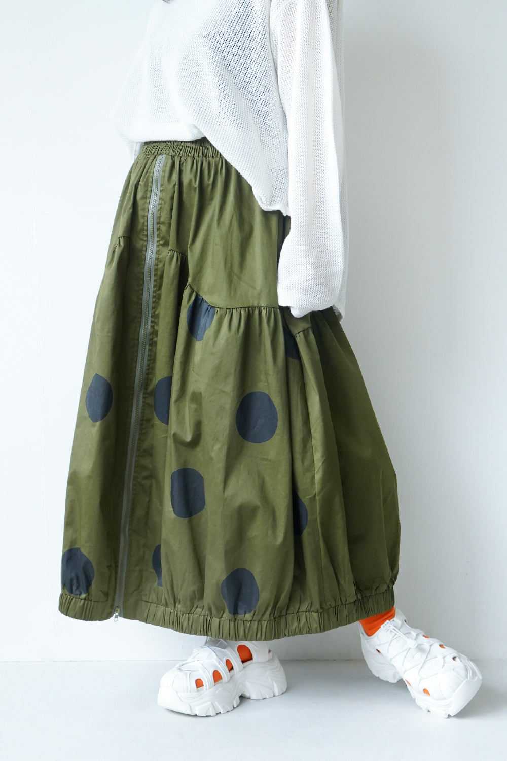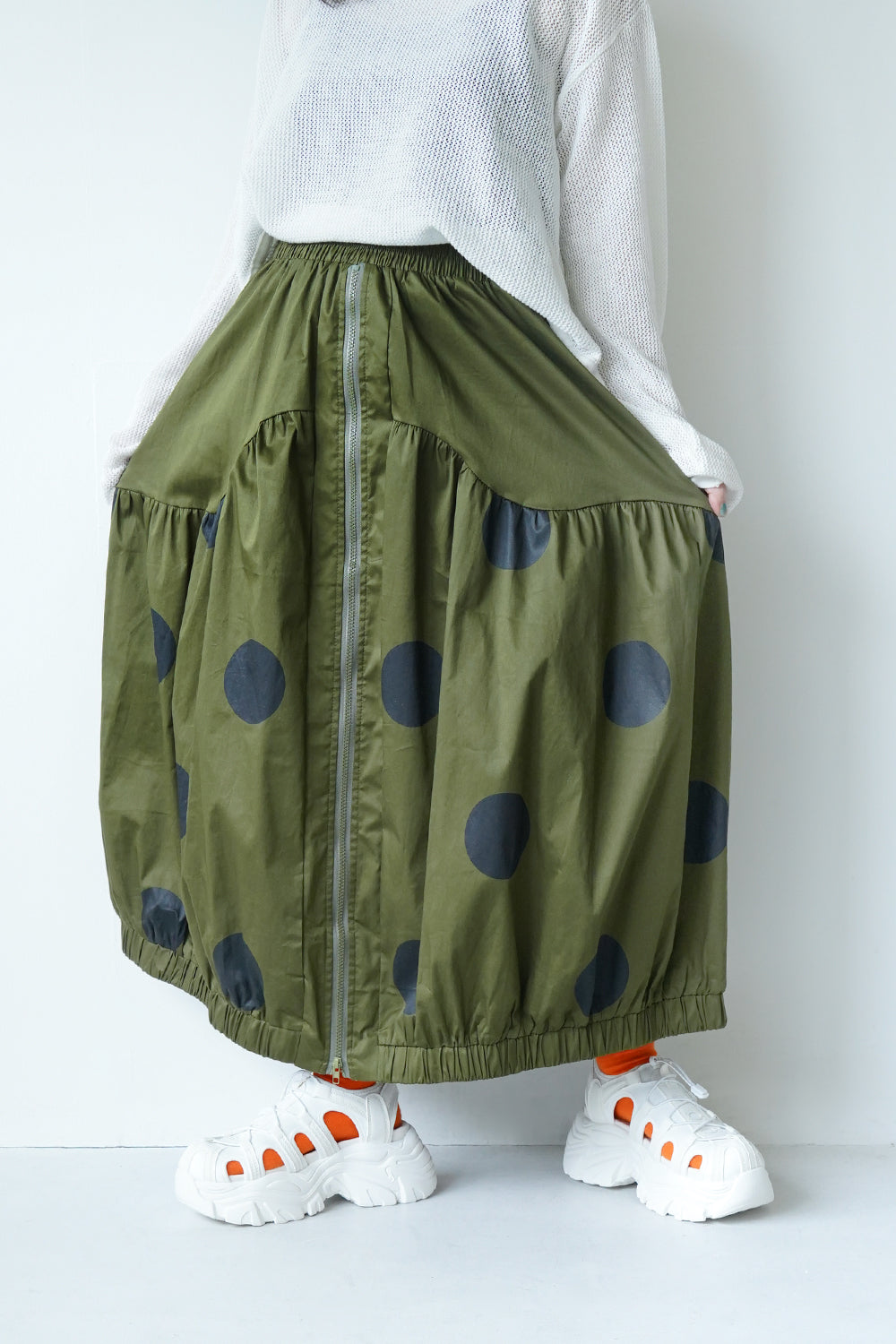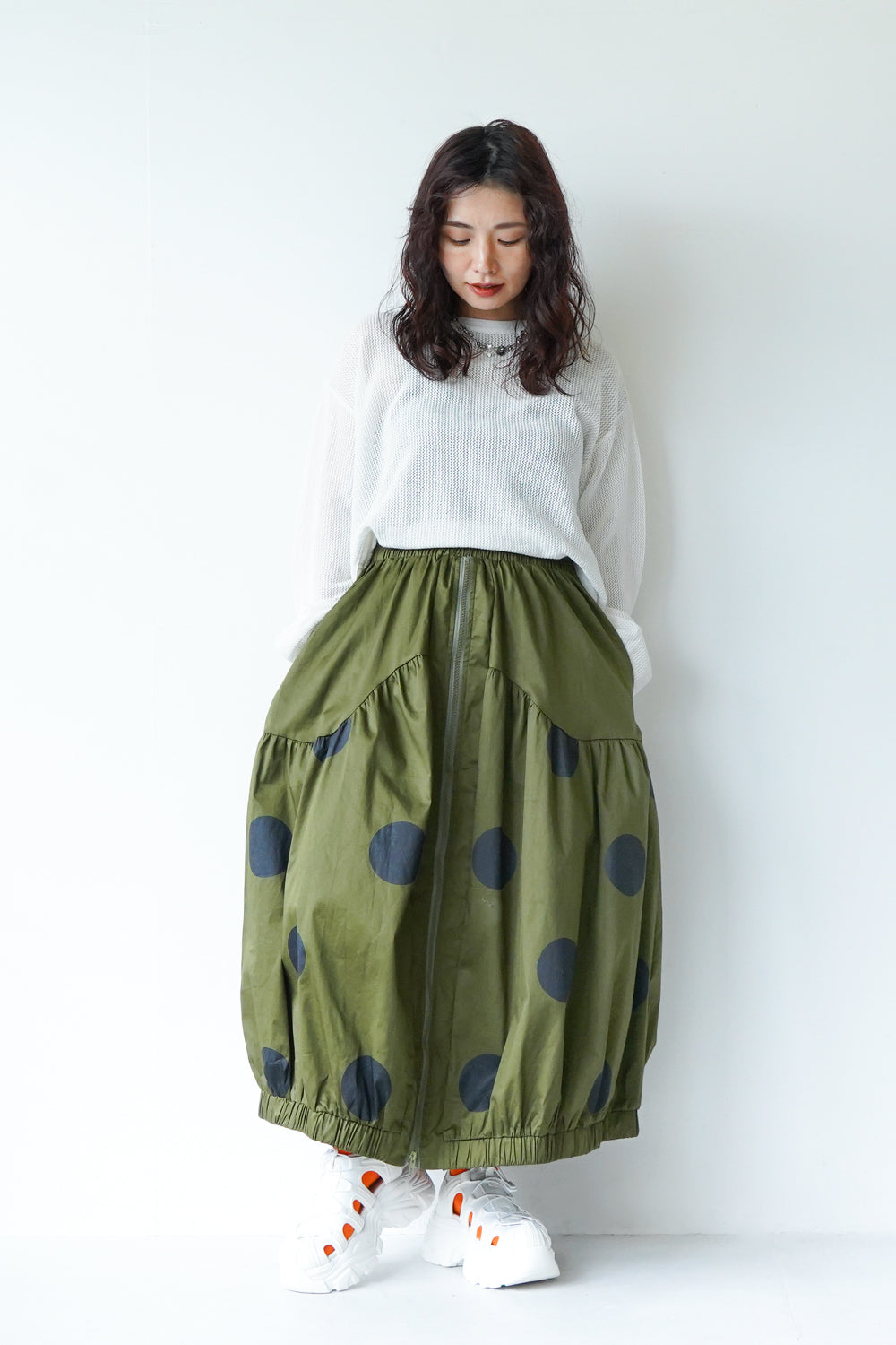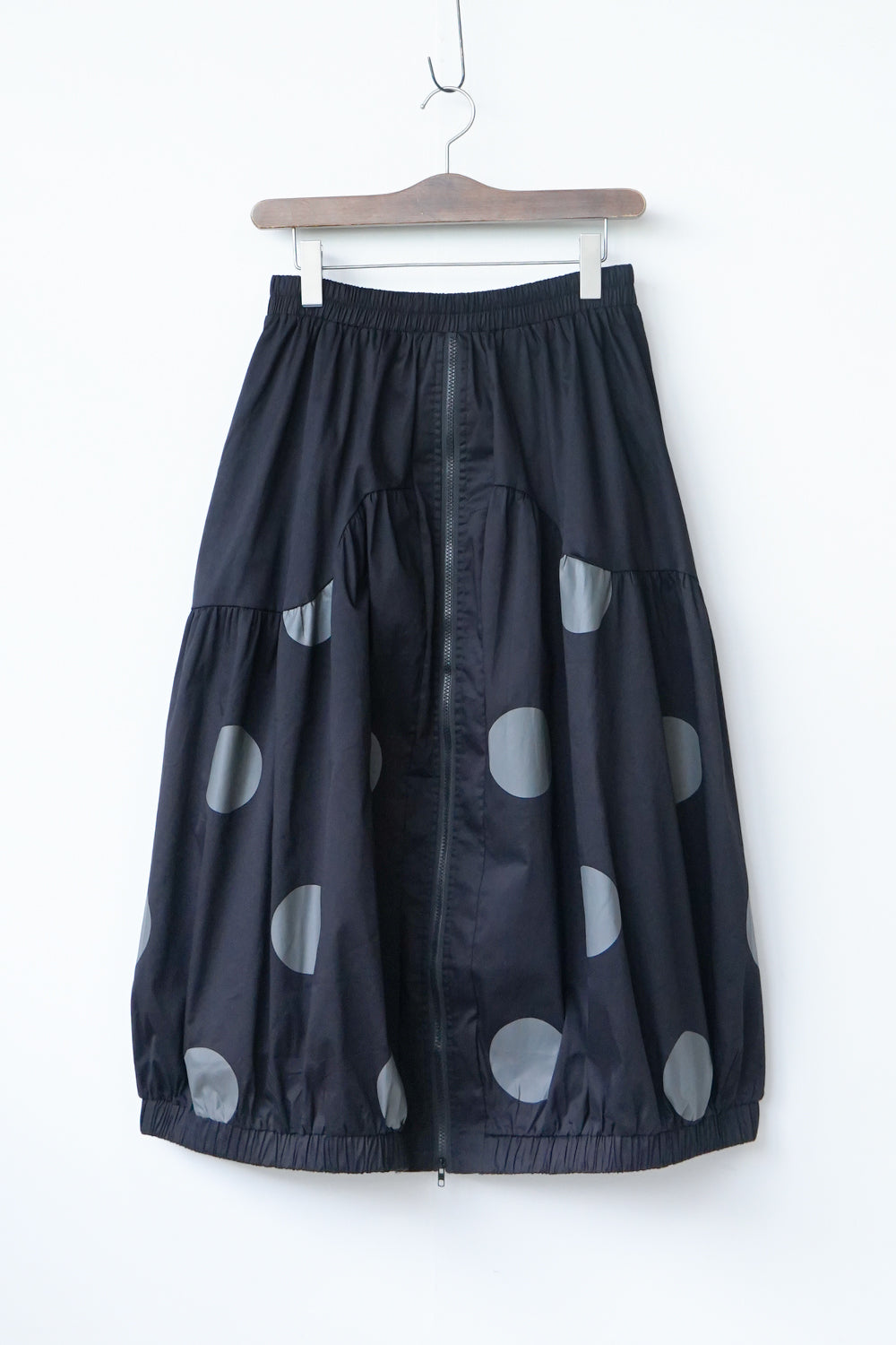 モードな印象のビッグドットスカート。フロントのジップデザインも特徴的。やや厚みのあるハリのある生地感なので丸みのあるシルエットが保たれます。カラーソックスコーデや、秋冬はブーツとの相性も抜群◎