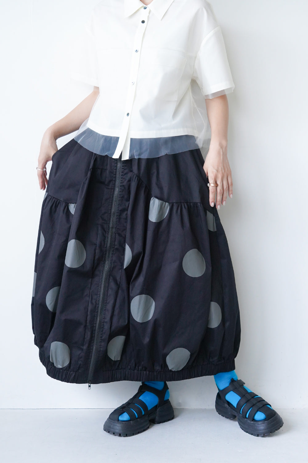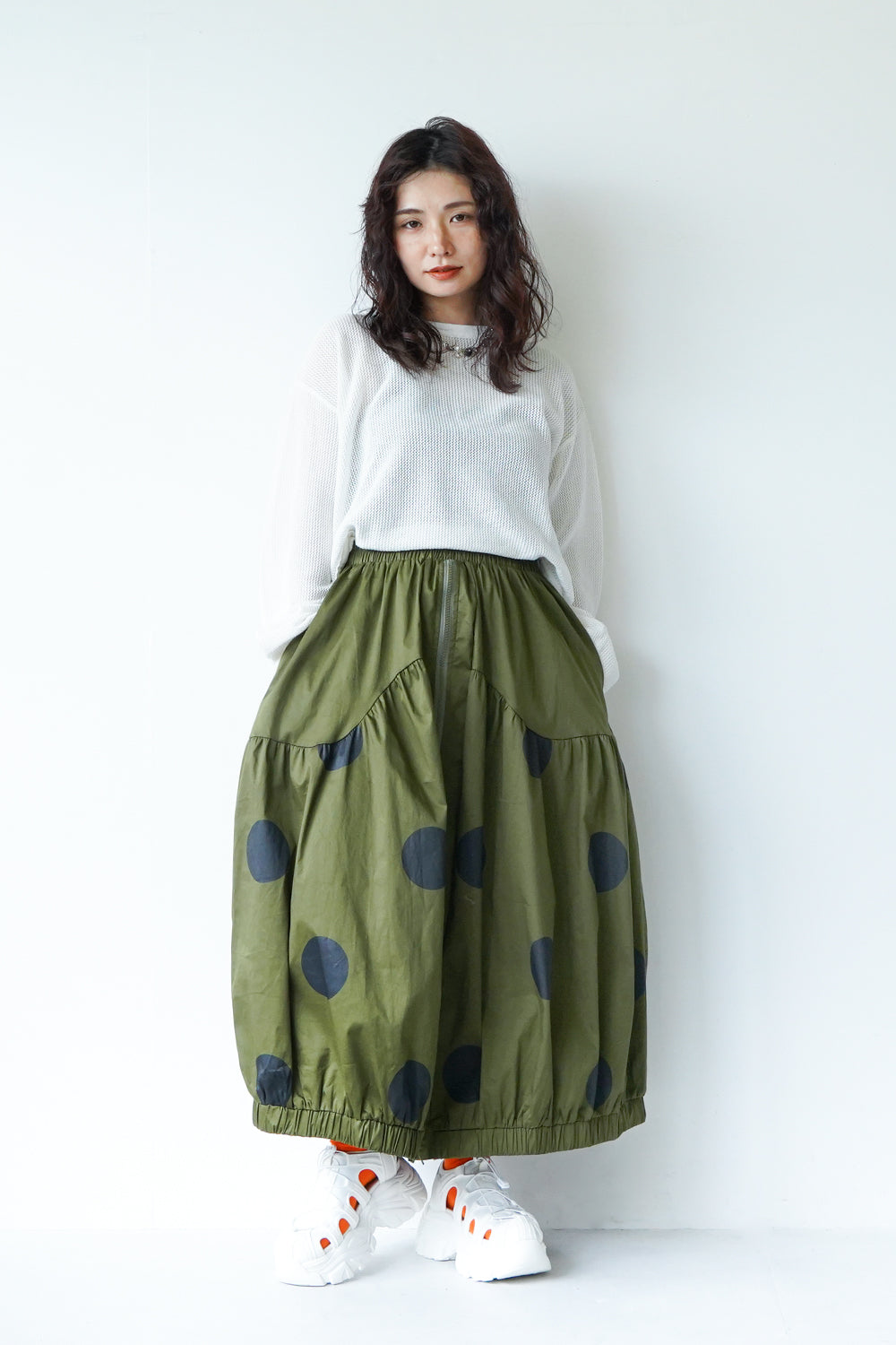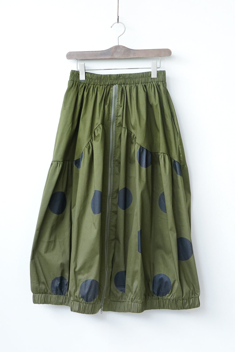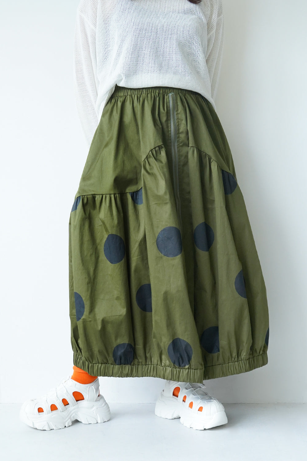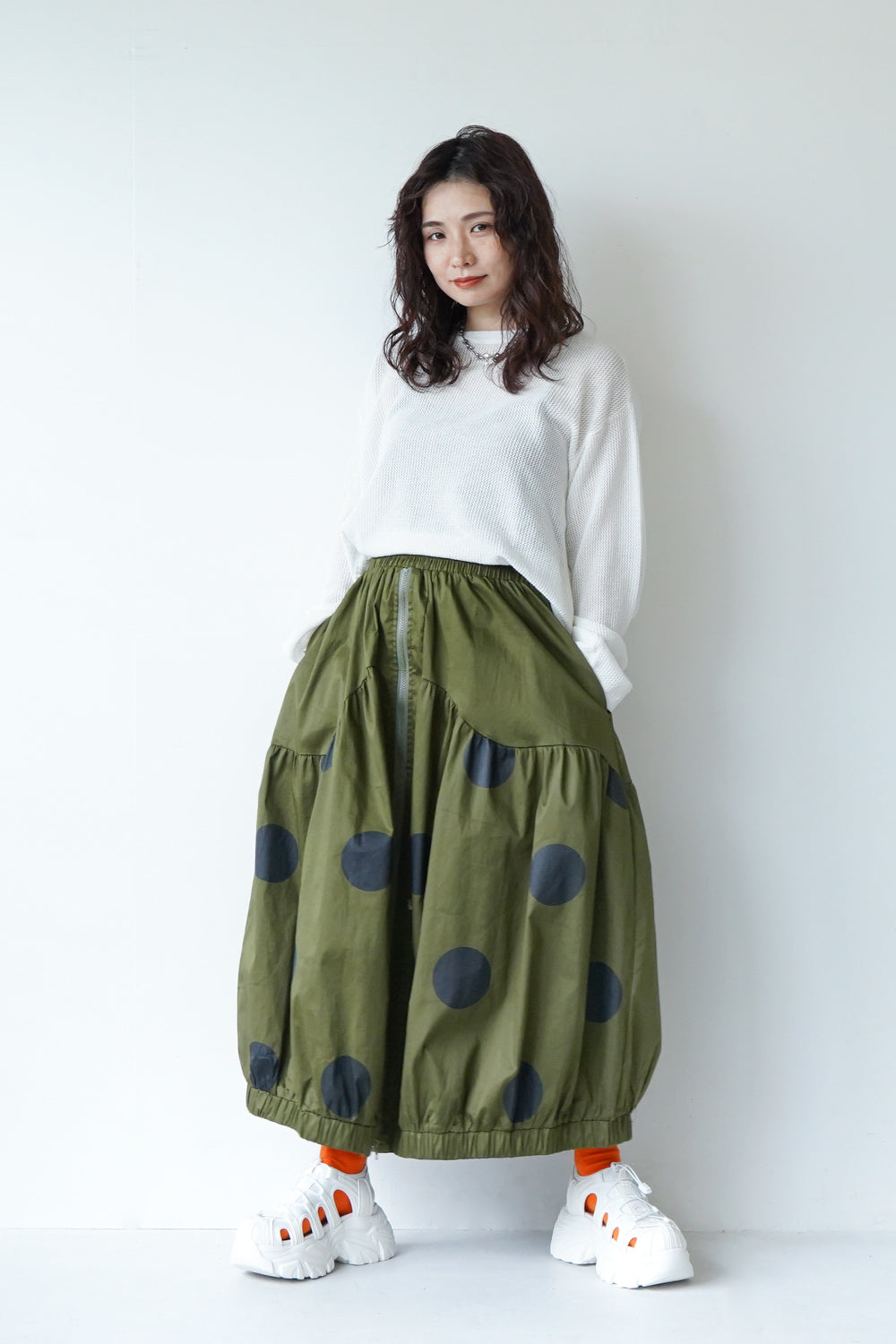 モードな印象のビッグドットスカート。フロントのジップデザインも特徴的。やや厚みのあるハリのある生地感なので丸みのあるシルエットが保たれます。カラーソックスコーデや、秋冬はブーツとの相性も抜群◎