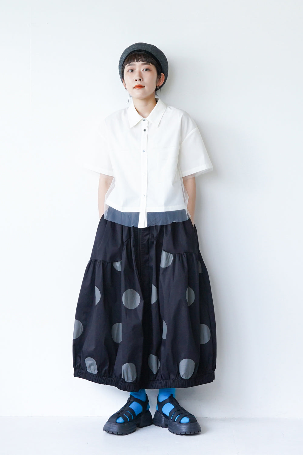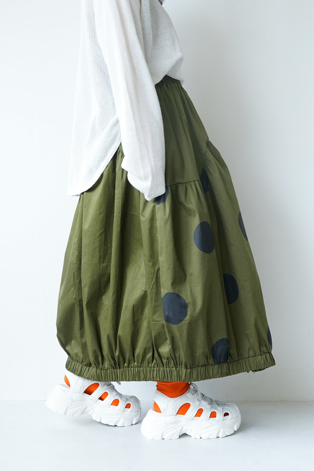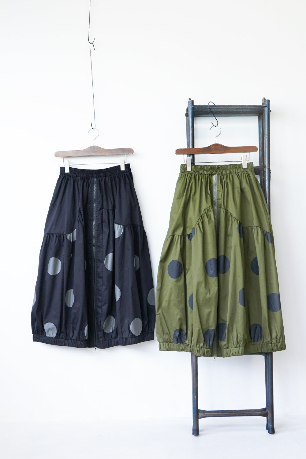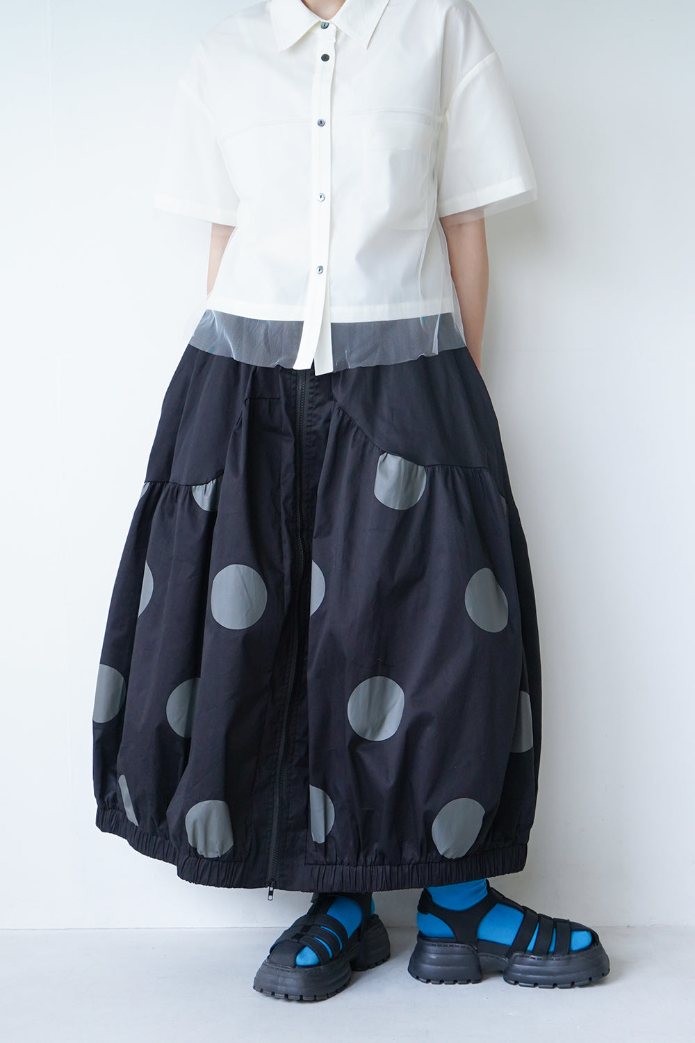 モードな印象のビッグドットスカート。フロントのジップデザインも特徴的。やや厚みのあるハリのある生地感なので丸みのあるシルエットが保たれます。カラーソックスコーデや、秋冬はブーツとの相性も抜群◎