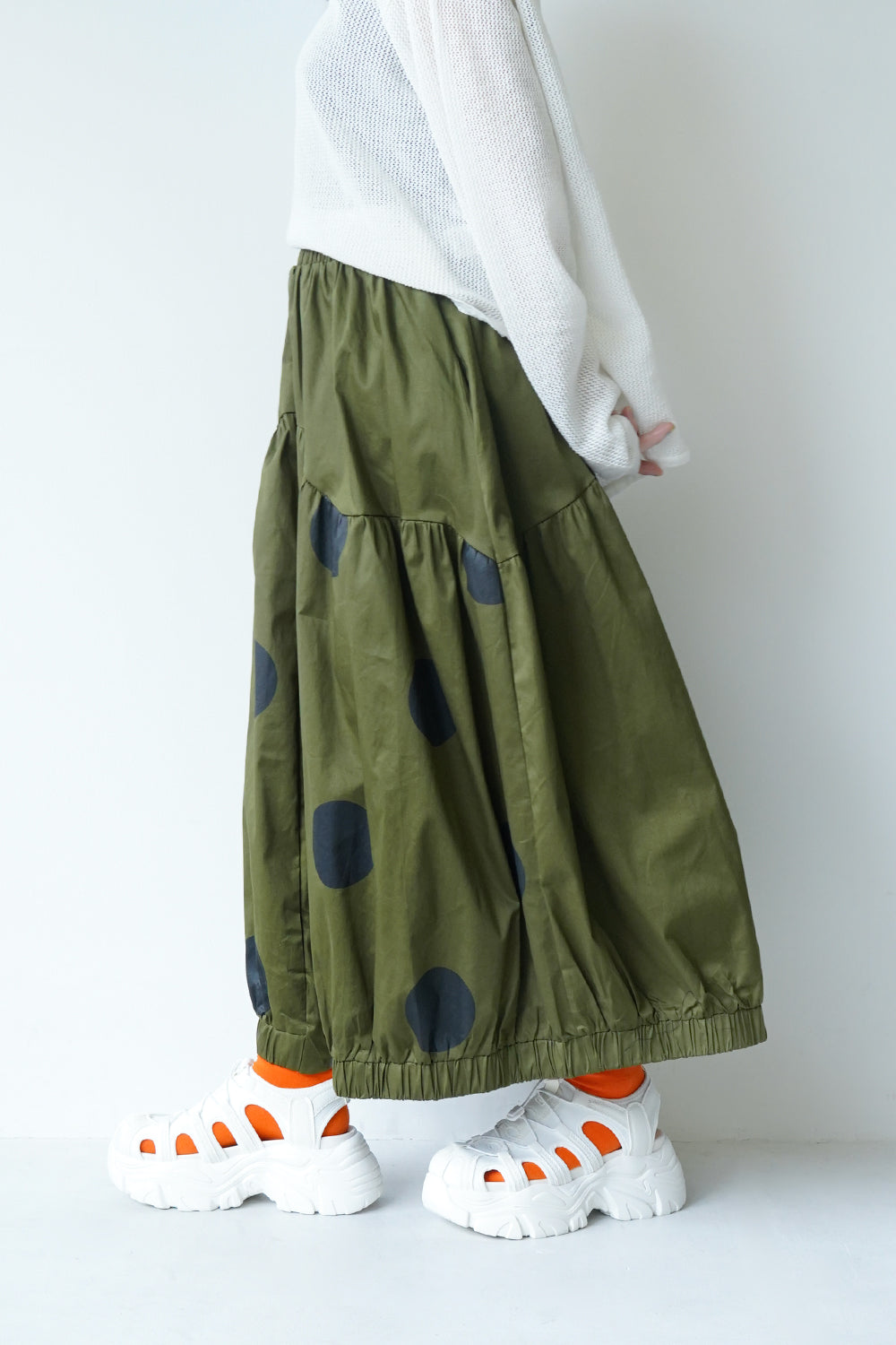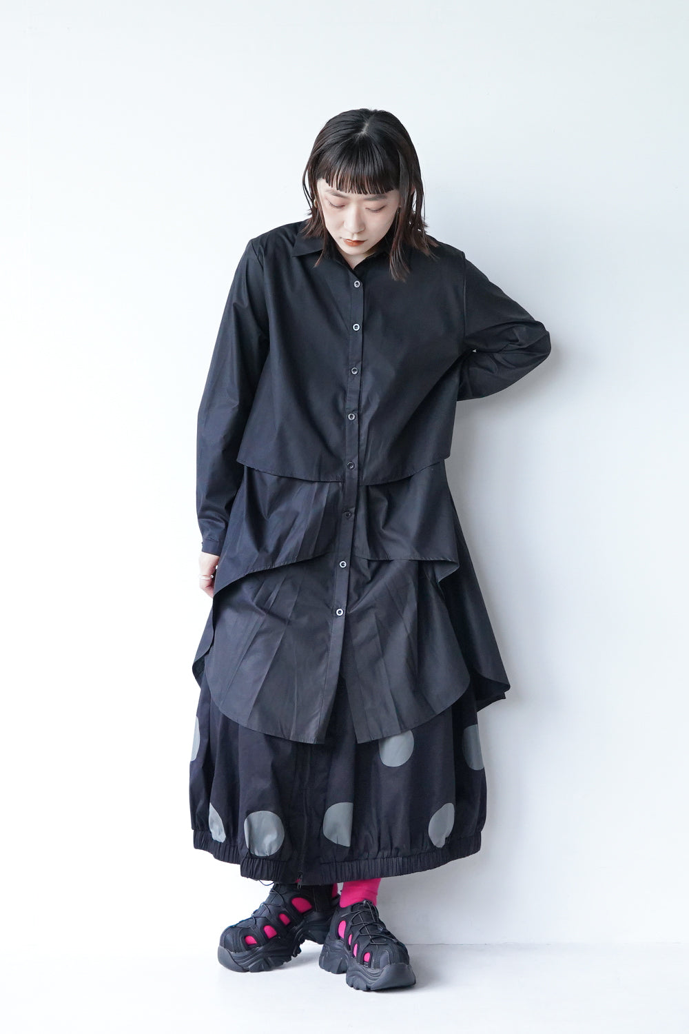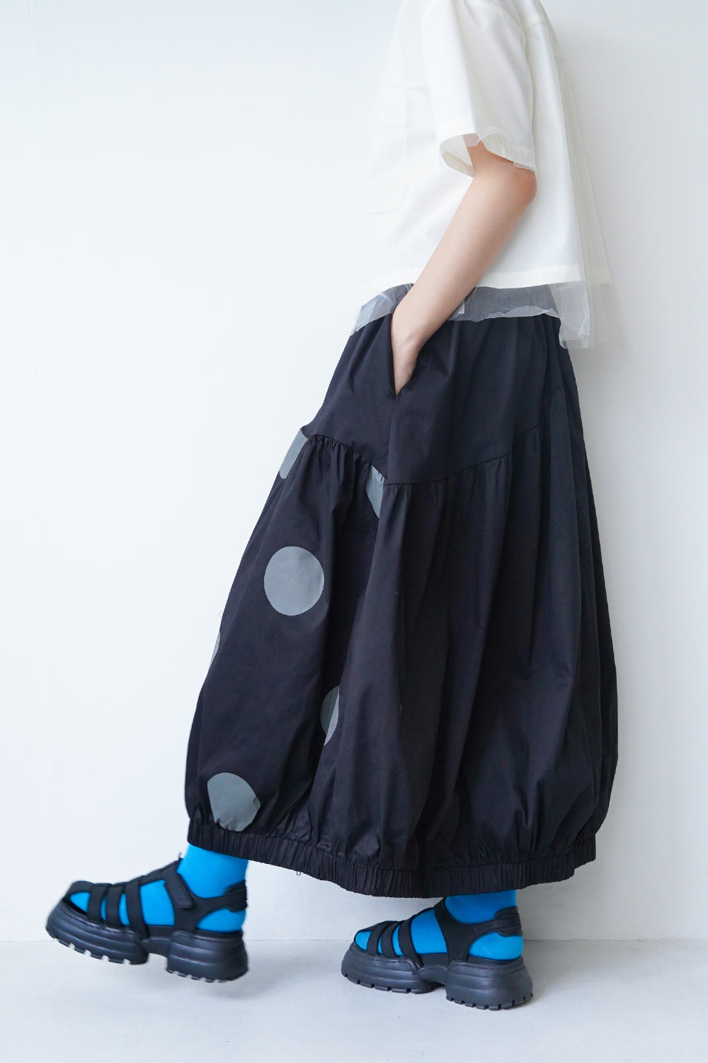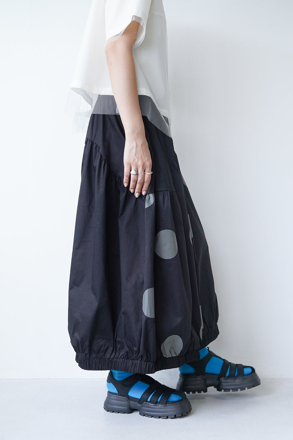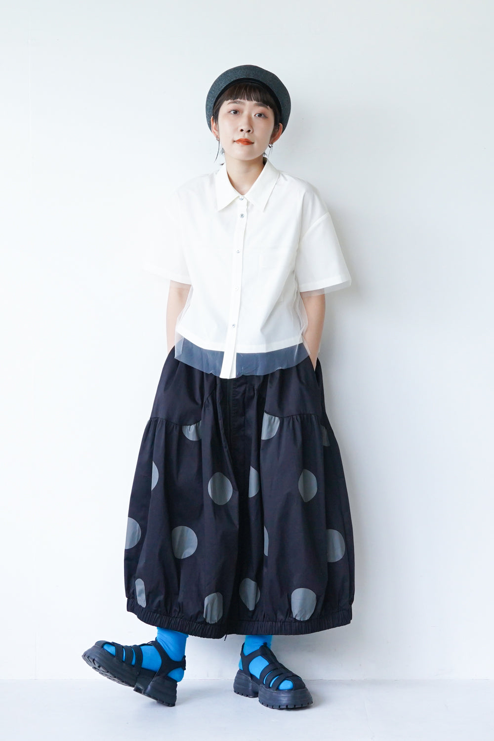 モードな印象のビッグドットスカート。フロントのジップデザインも特徴的。やや厚みのあるハリのある生地感なので丸みのあるシルエットが保たれます。カラーソックスコーデや、秋冬はブーツとの相性も抜群◎