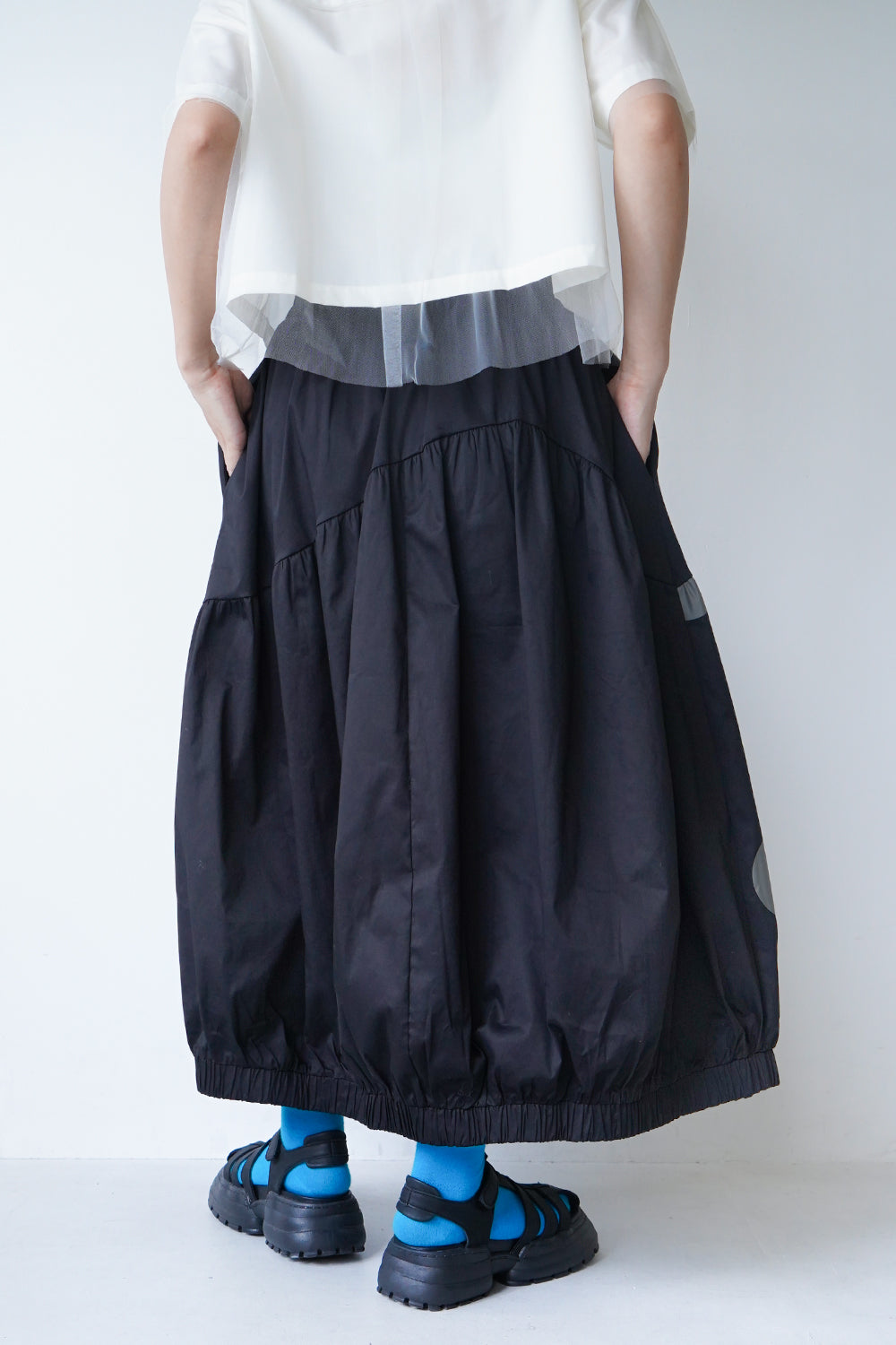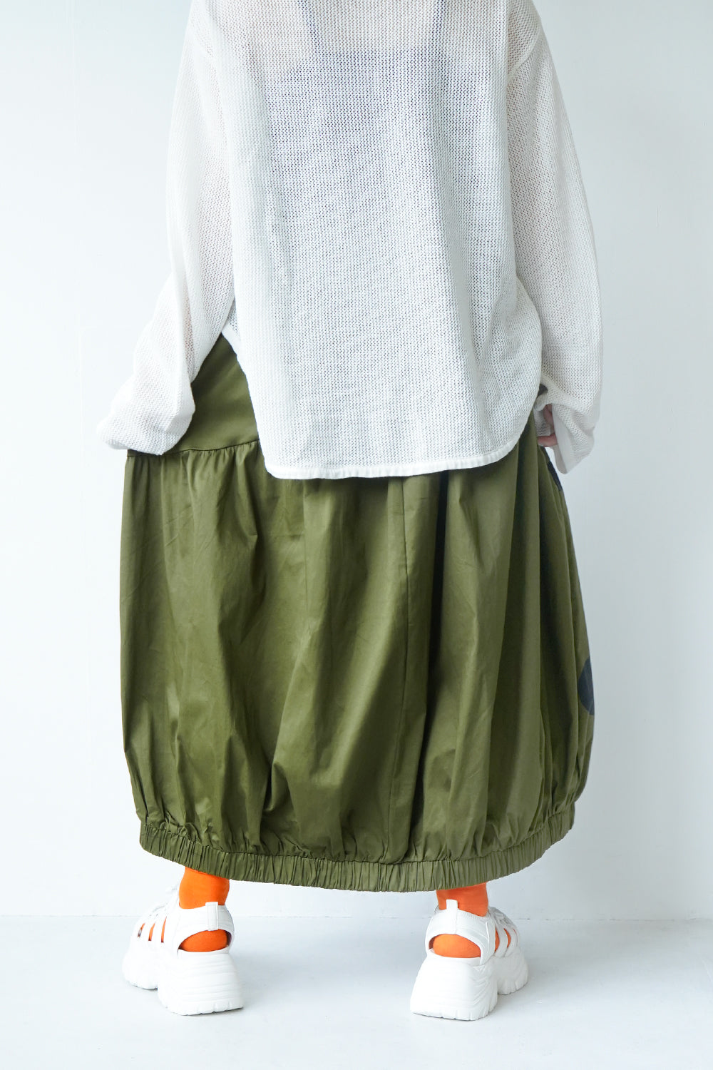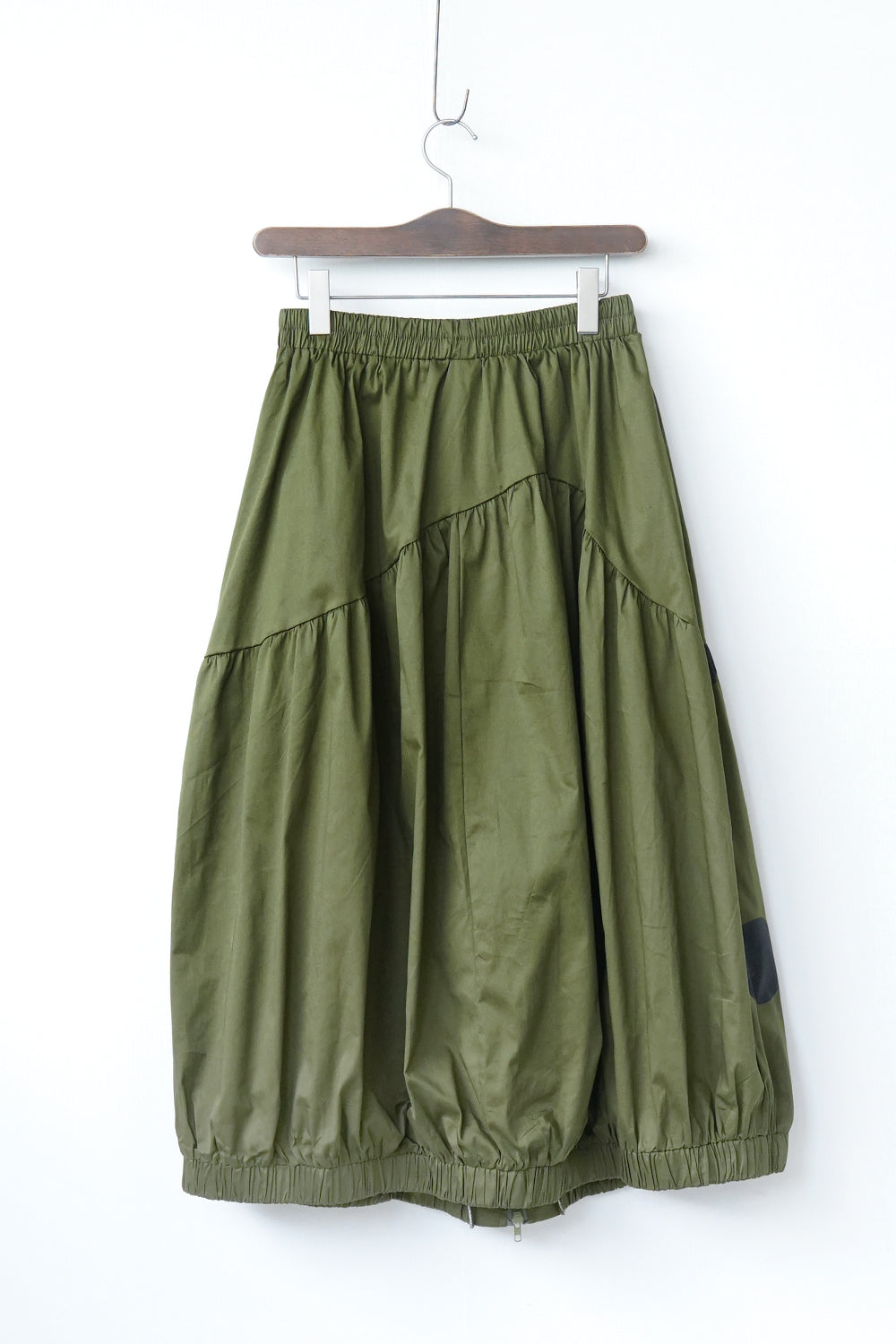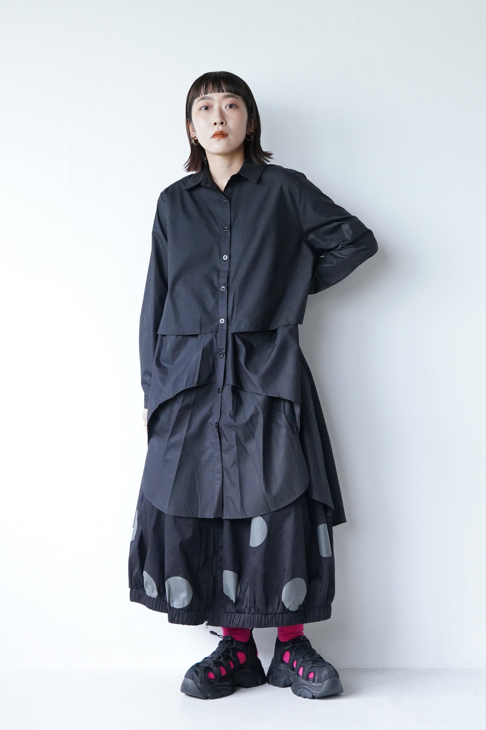 モードな印象のビッグドットスカート。フロントのジップデザインも特徴的。やや厚みのあるハリのある生地感なので丸みのあるシルエットが保たれます。カラーソックスコーデや、秋冬はブーツとの相性も抜群◎