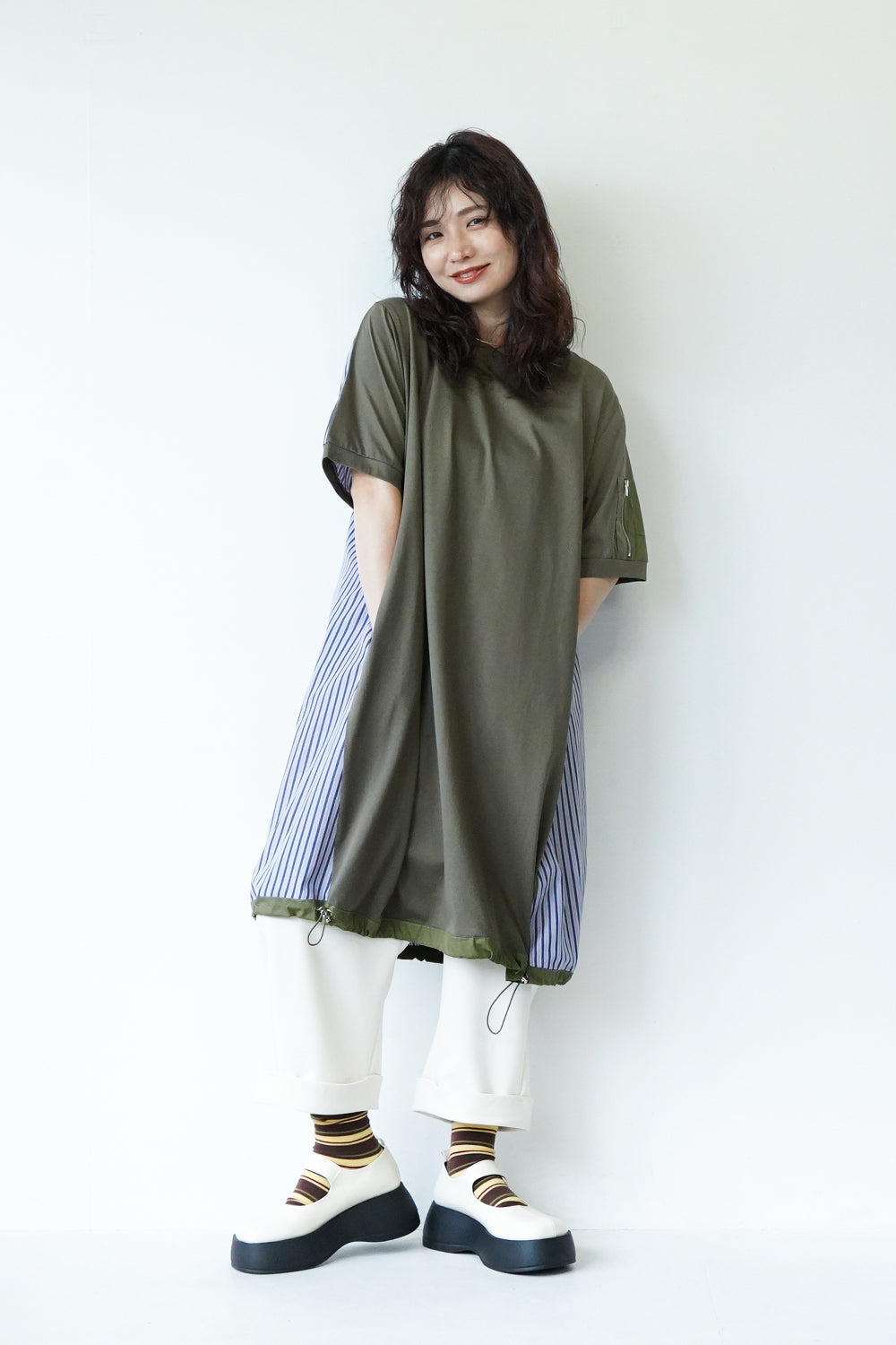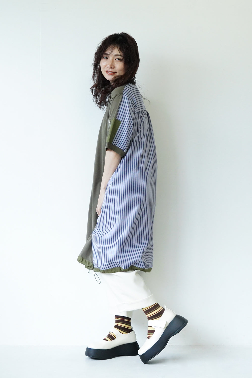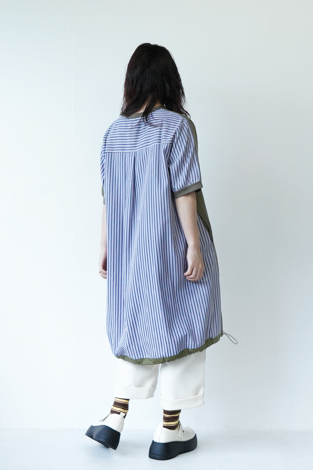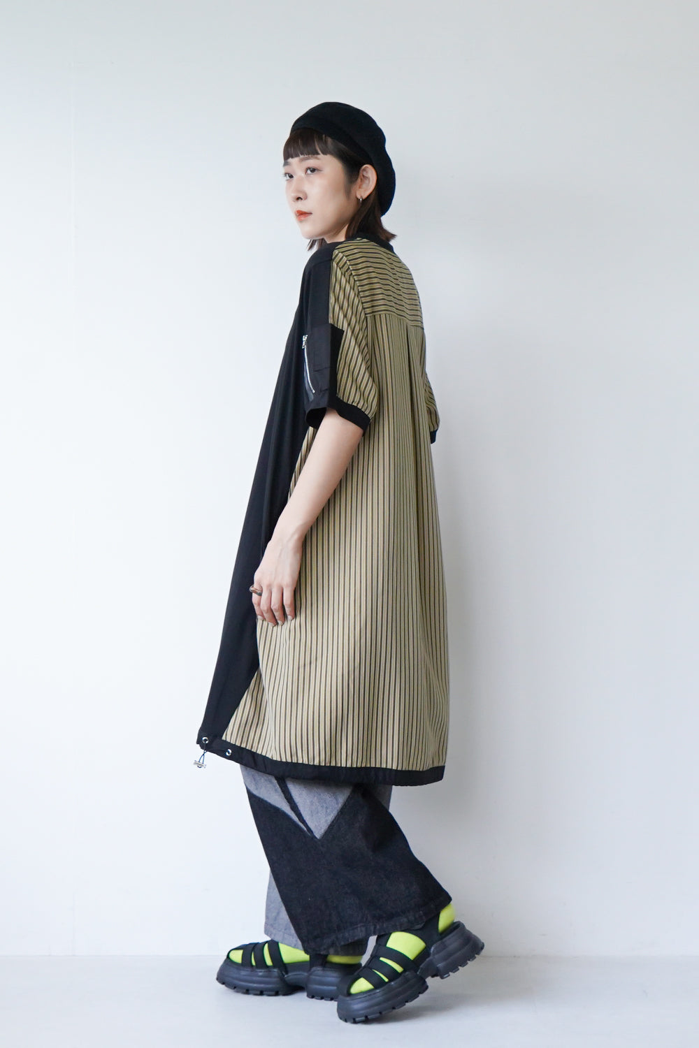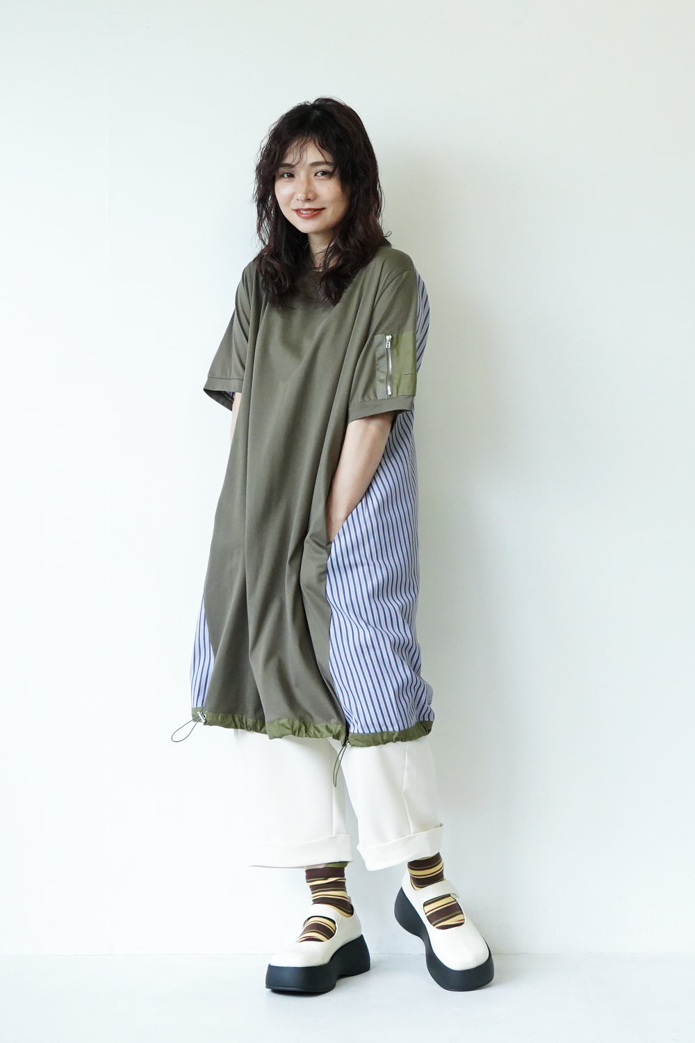 【MICALLE MICALLE】前後で異なるデザインのチュニックワンピース。バックデザインは大胆に入ったストライプのテキスタイル。ミリタリー要素のある袖口のポケットや裾のドロスト仕様がポイントに◎小柄な方は1枚で、長身の方はボトムスを合わせたスタイリングがおすすめです。
