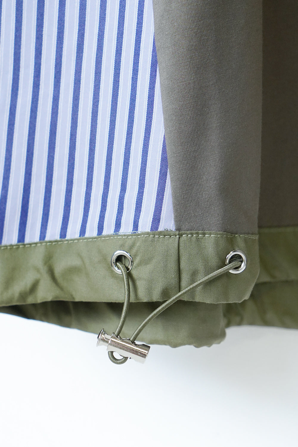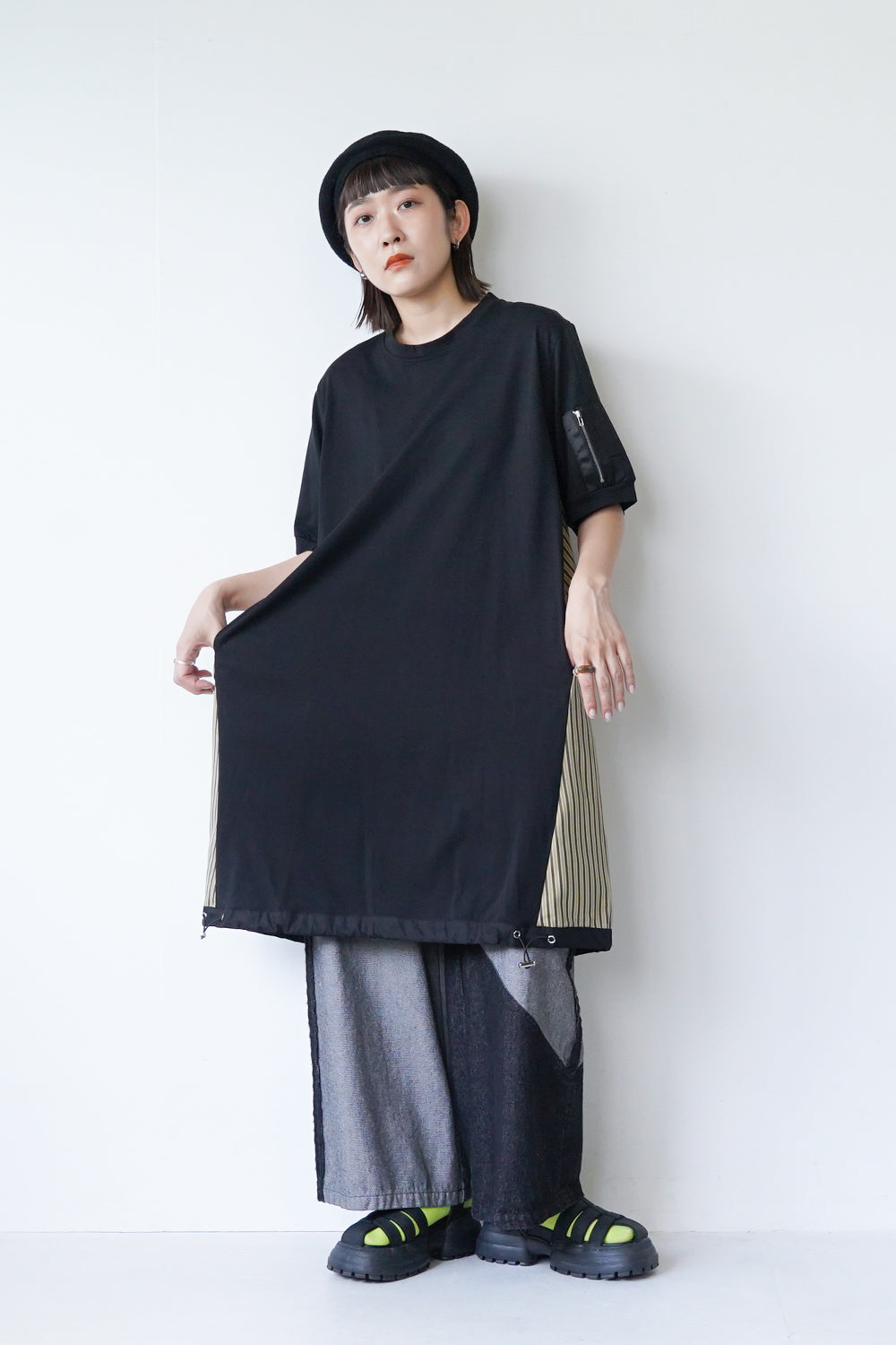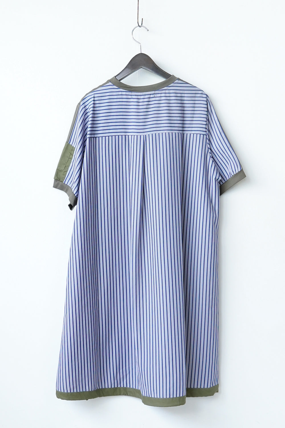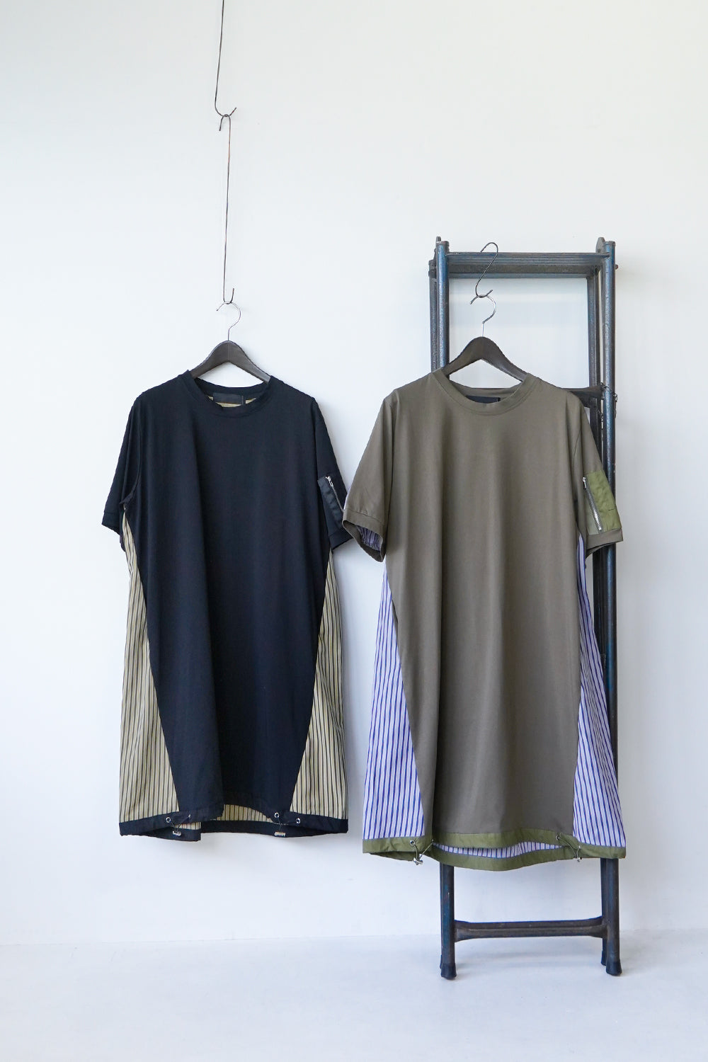【MICALLE MICALLE】前後で異なるデザインのチュニックワンピース。バックデザインは大胆に入ったストライプのテキスタイル。ミリタリー要素のある袖口のポケットや裾のドロスト仕様がポイントに◎小柄な方は1枚で、長身の方はボトムスを合わせたスタイリングがおすすめです。