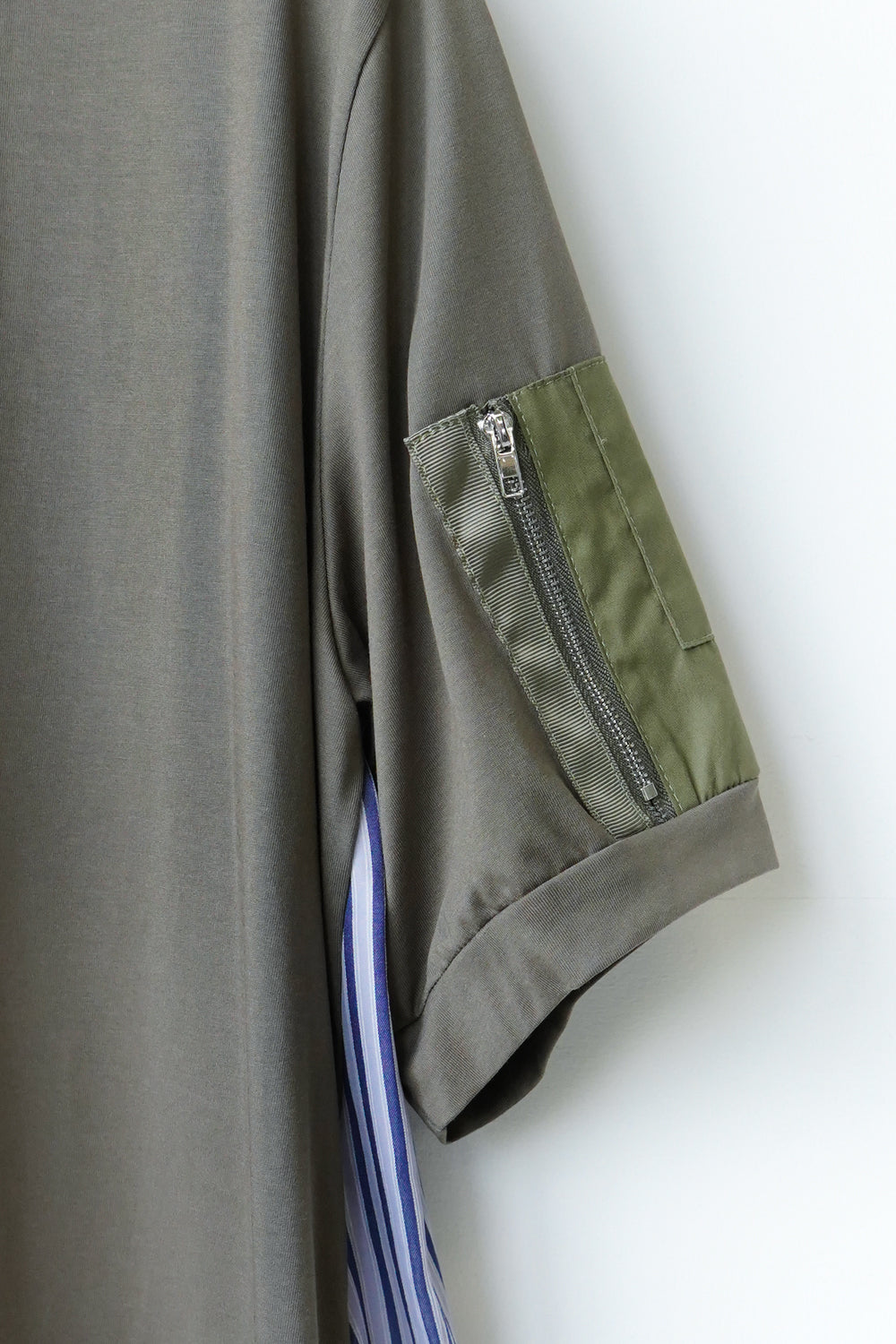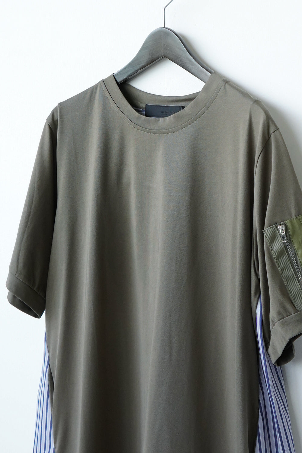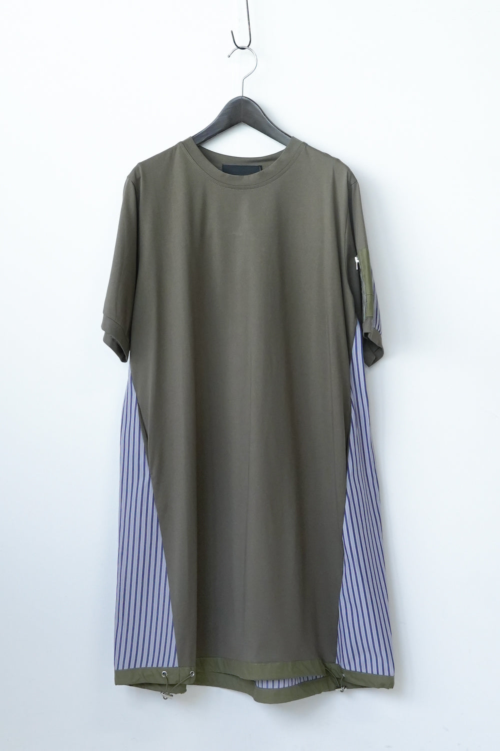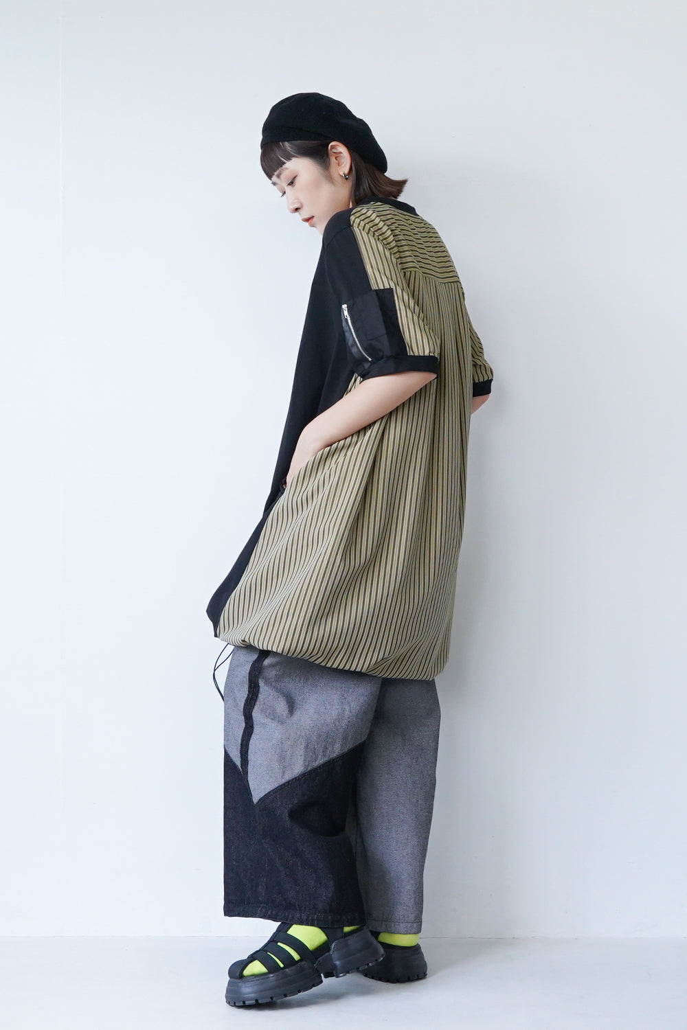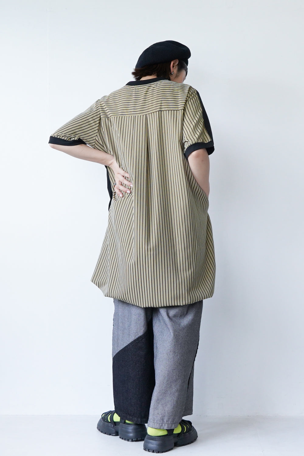 【MICALLE MICALLE】前後で異なるデザインのチュニックワンピース。バックデザインは大胆に入ったストライプのテキスタイル。ミリタリー要素のある袖口のポケットや裾のドロスト仕様がポイントに◎小柄な方は1枚で、長身の方はボトムスを合わせたスタイリングがおすすめです。