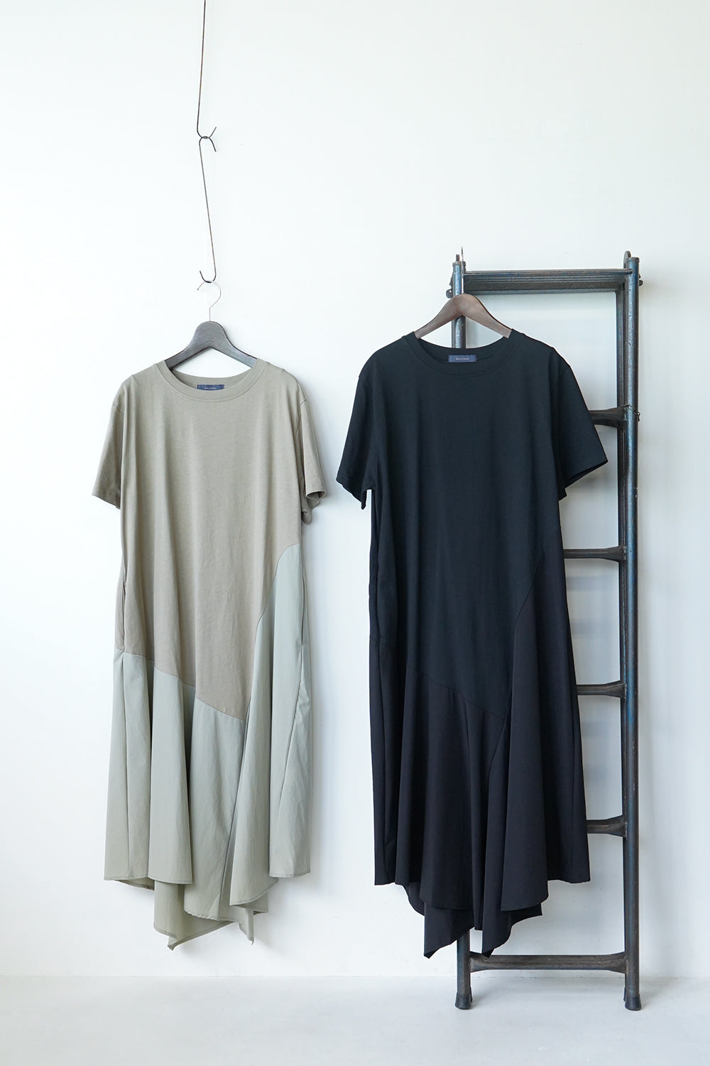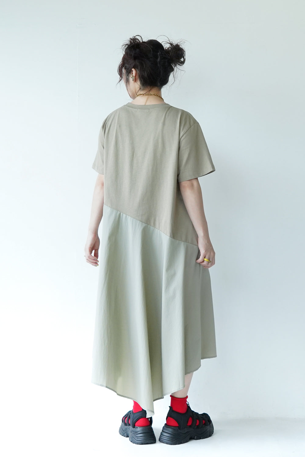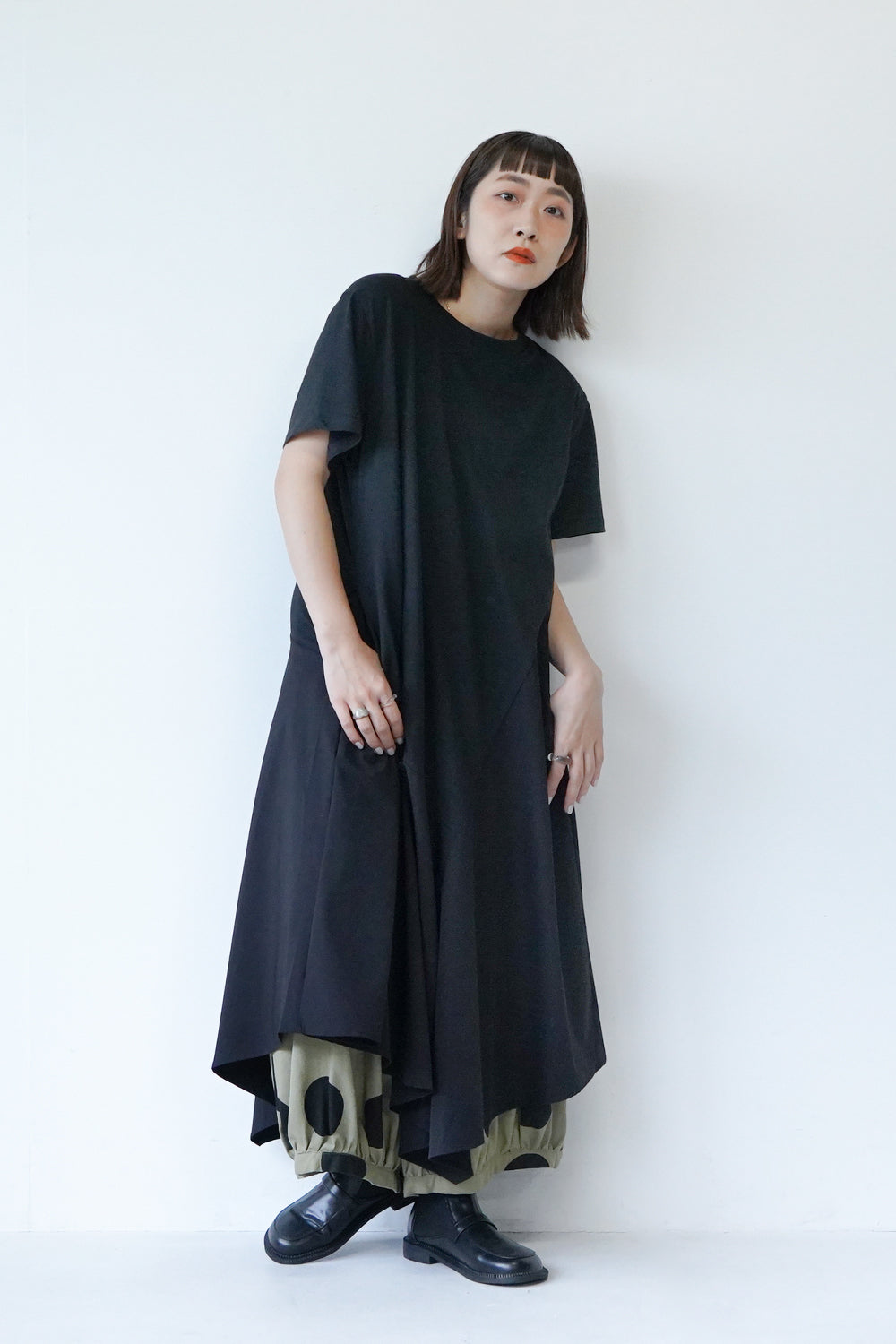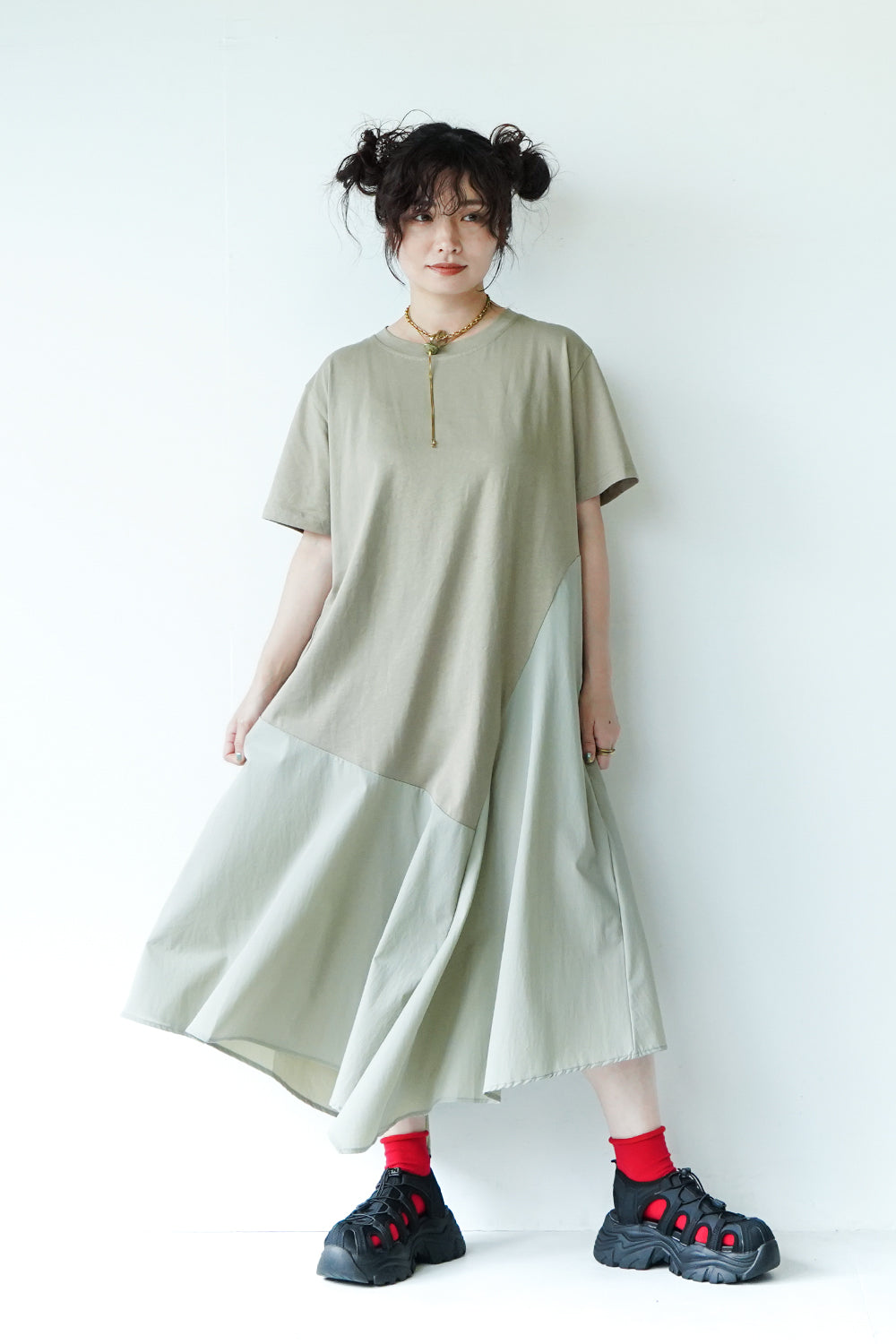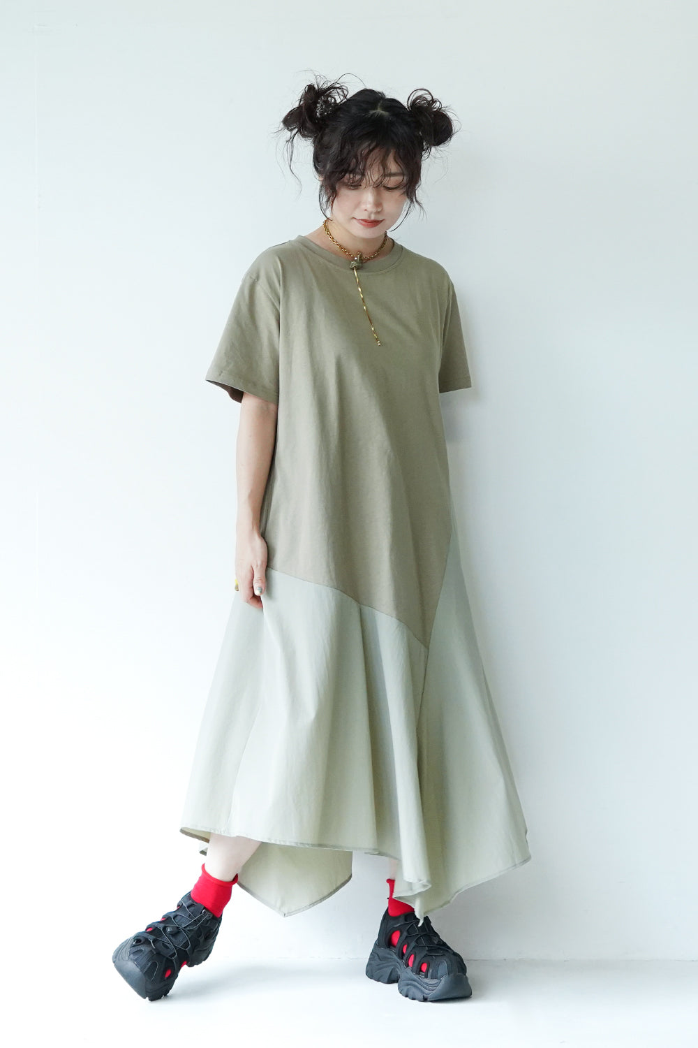 切替デザインが個性的なアシメワンピース。身頃部分は伸縮性のあるカットソー素材で着心地◎ボトムス部分にはポリエステル生地がドッキングされ動きの出るデザインに。裾は段違いになっていて1枚で着られる丈感も魅力的。