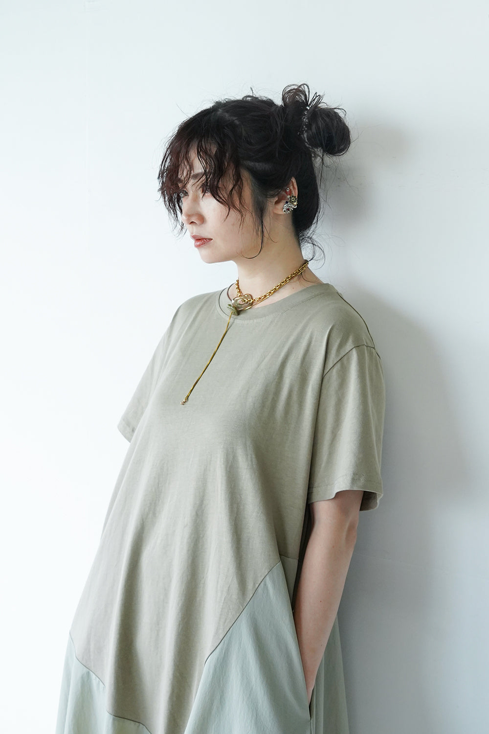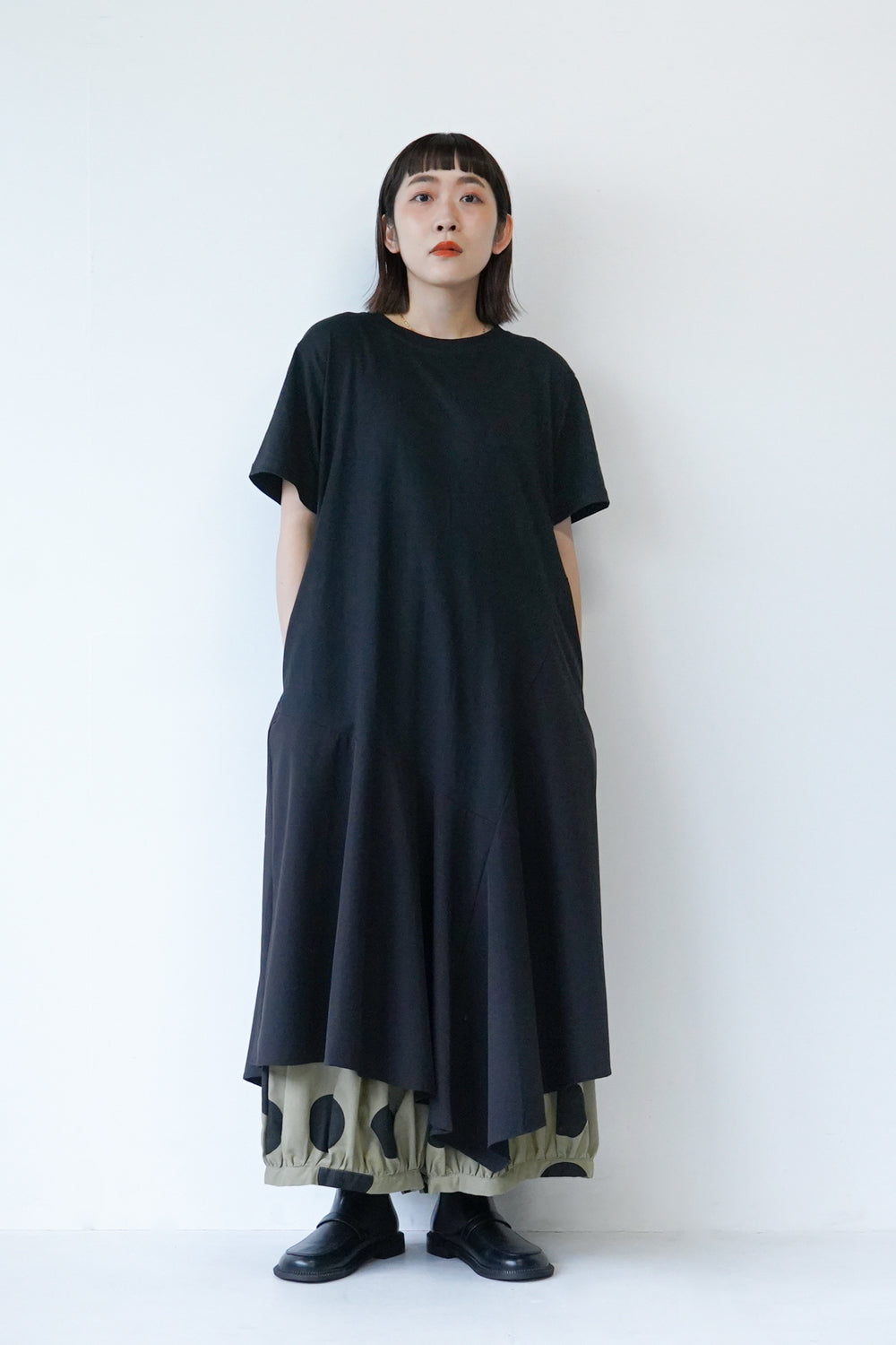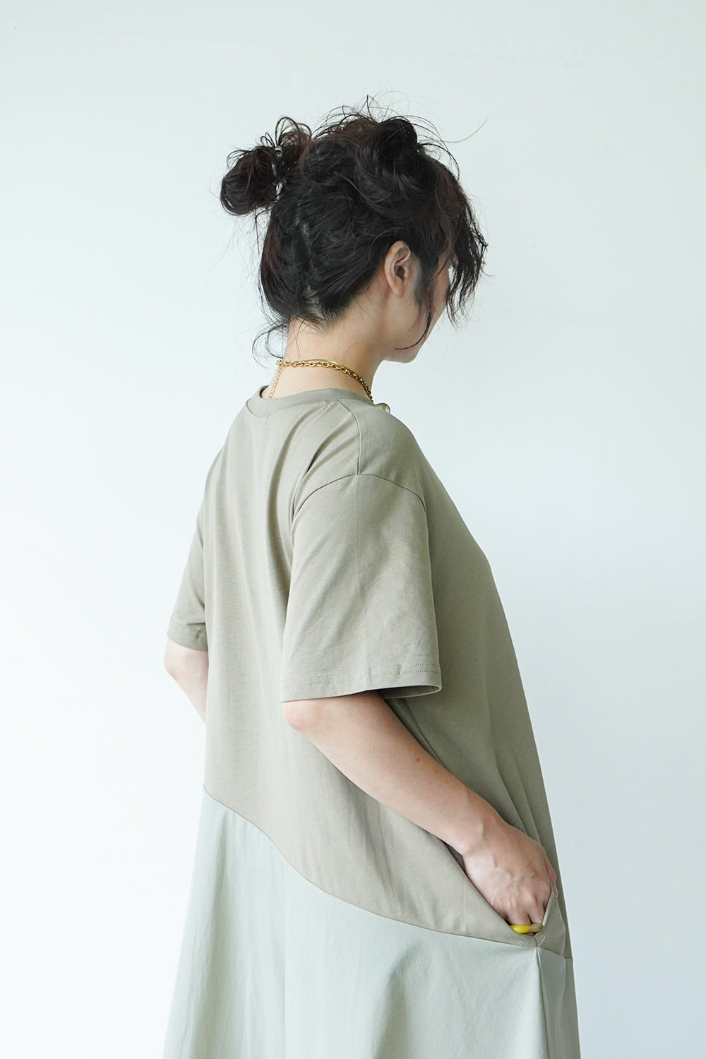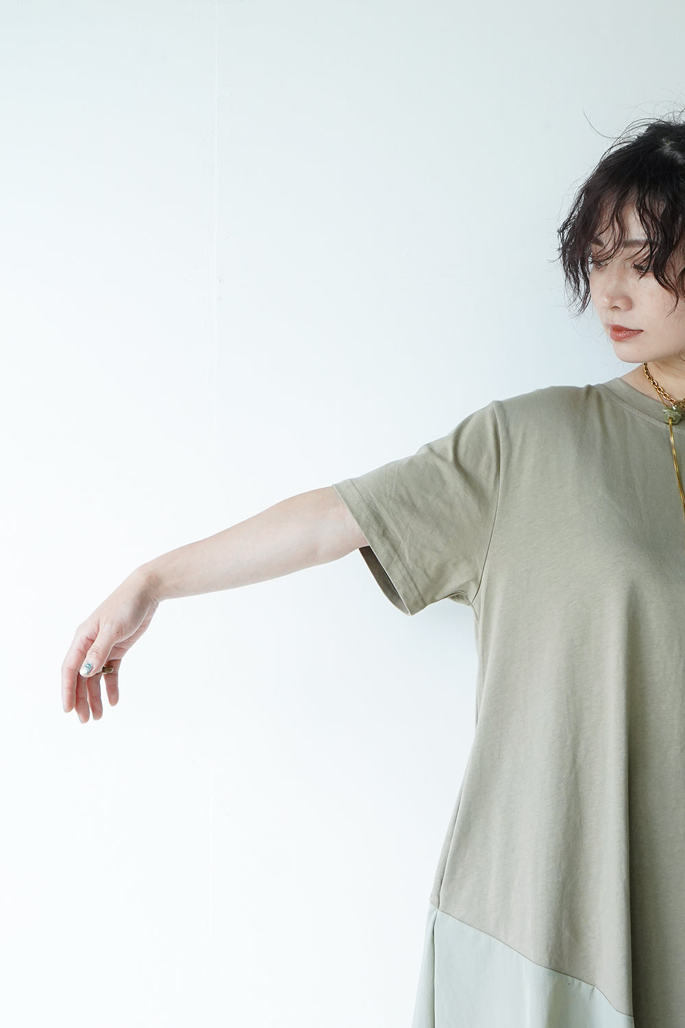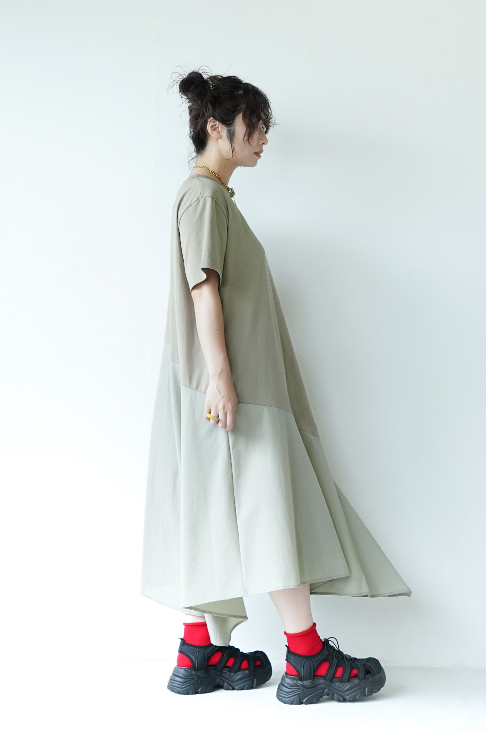 切替デザインが個性的なアシメワンピース。身頃部分は伸縮性のあるカットソー素材で着心地◎ボトムス部分にはポリエステル生地がドッキングされ動きの出るデザインに。裾は段違いになっていて1枚で着られる丈感も魅力的。
