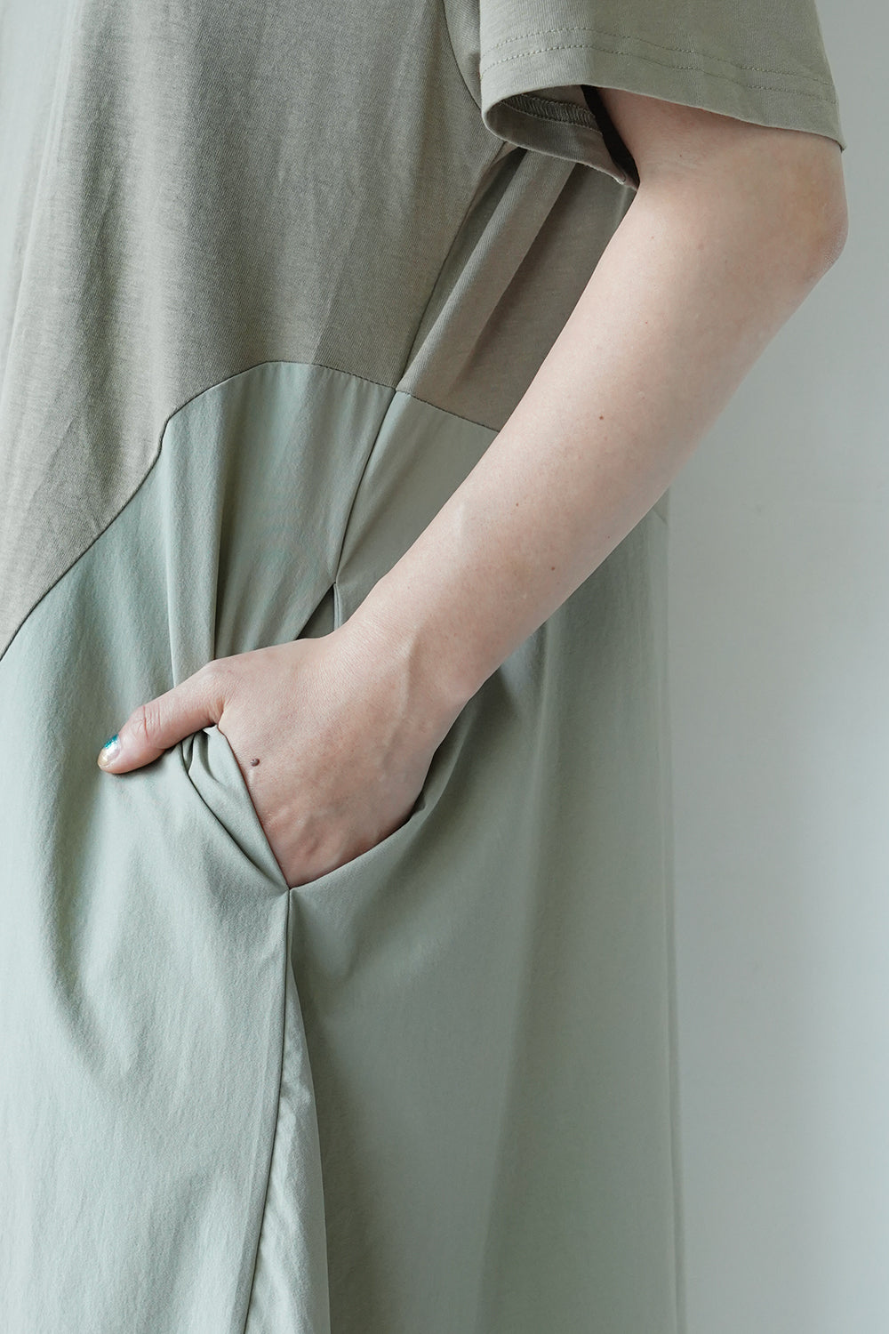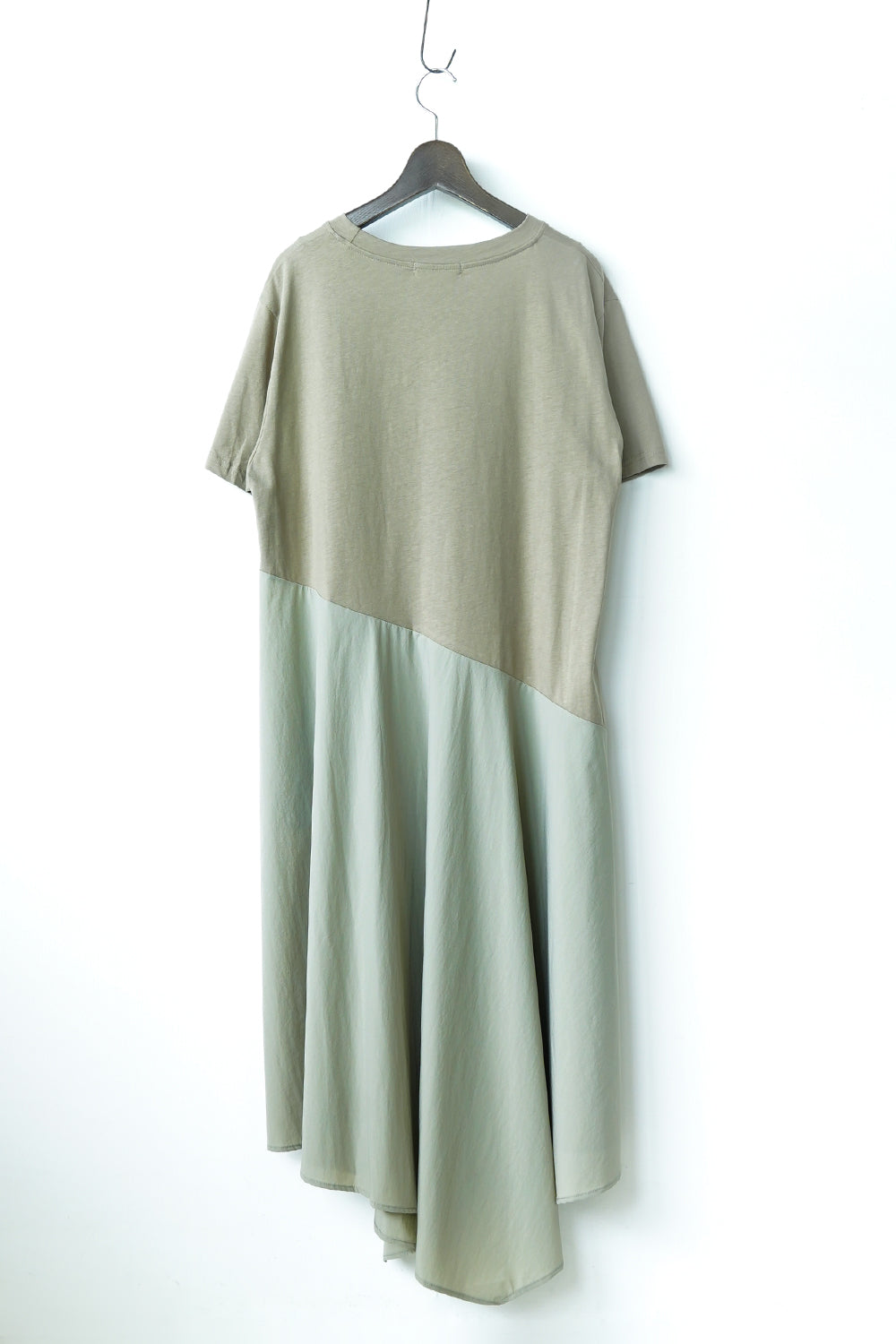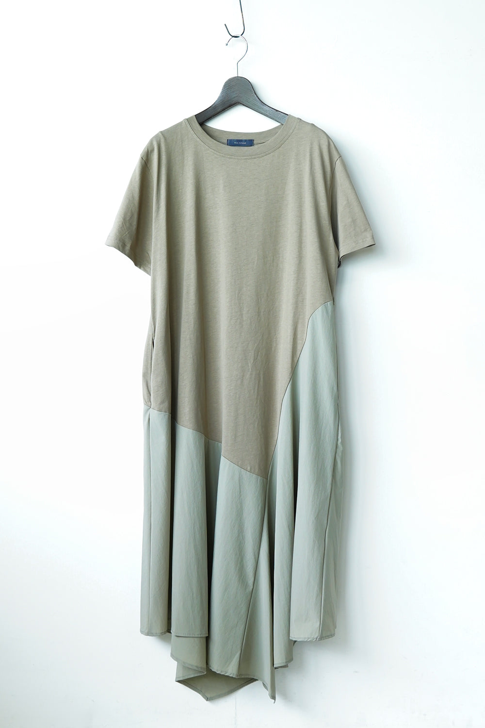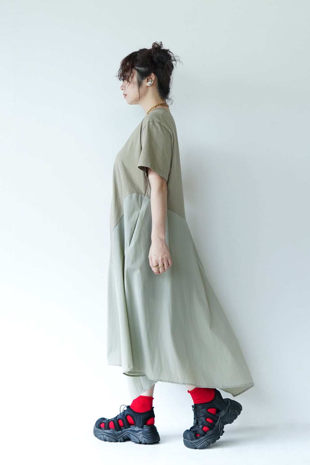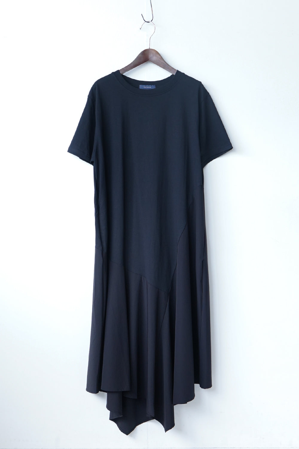 切替デザインが個性的なアシメワンピース。身頃部分は伸縮性のあるカットソー素材で着心地◎ボトムス部分にはポリエステル生地がドッキングされ動きの出るデザインに。裾は段違いになっていて1枚で着られる丈感も魅力的。