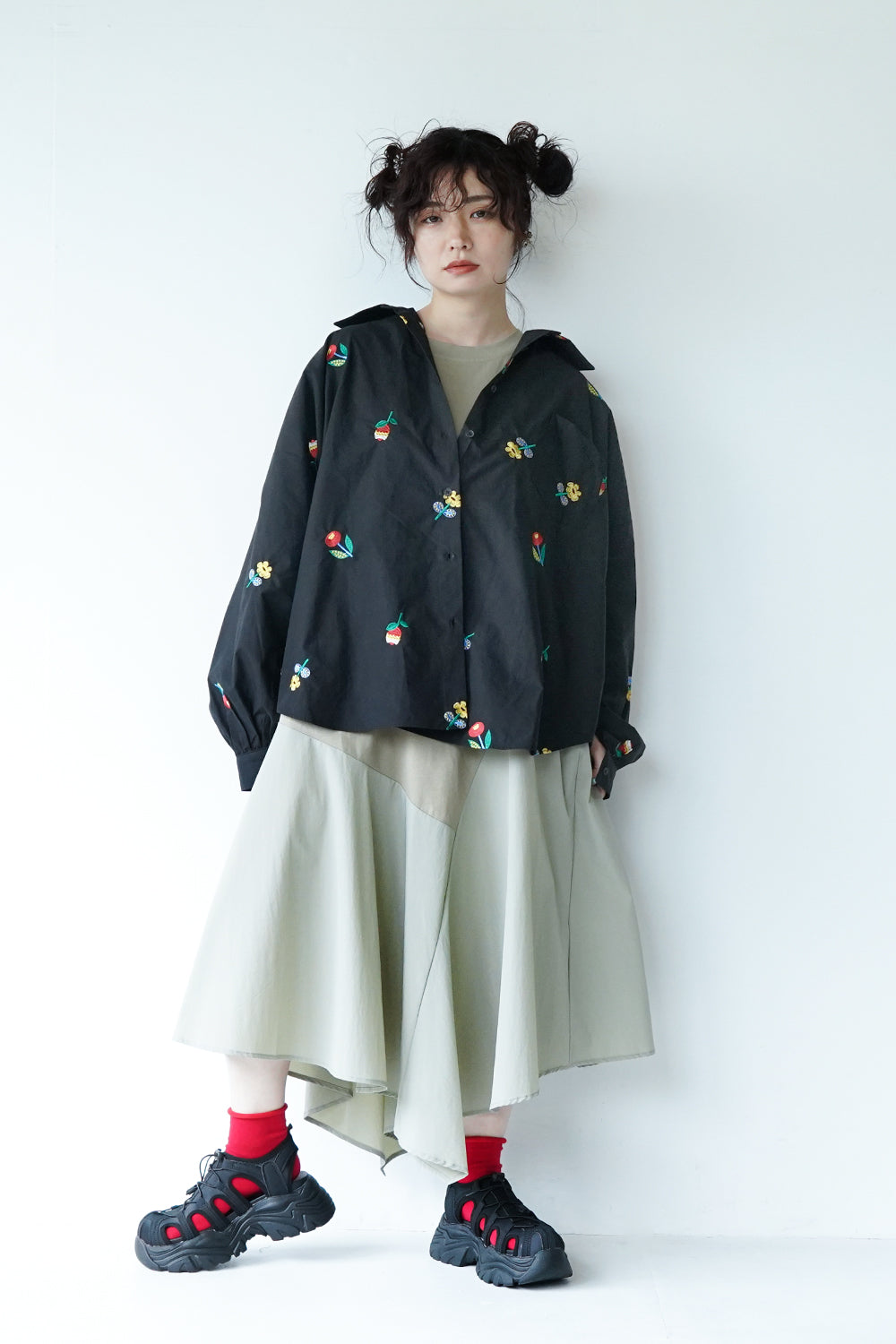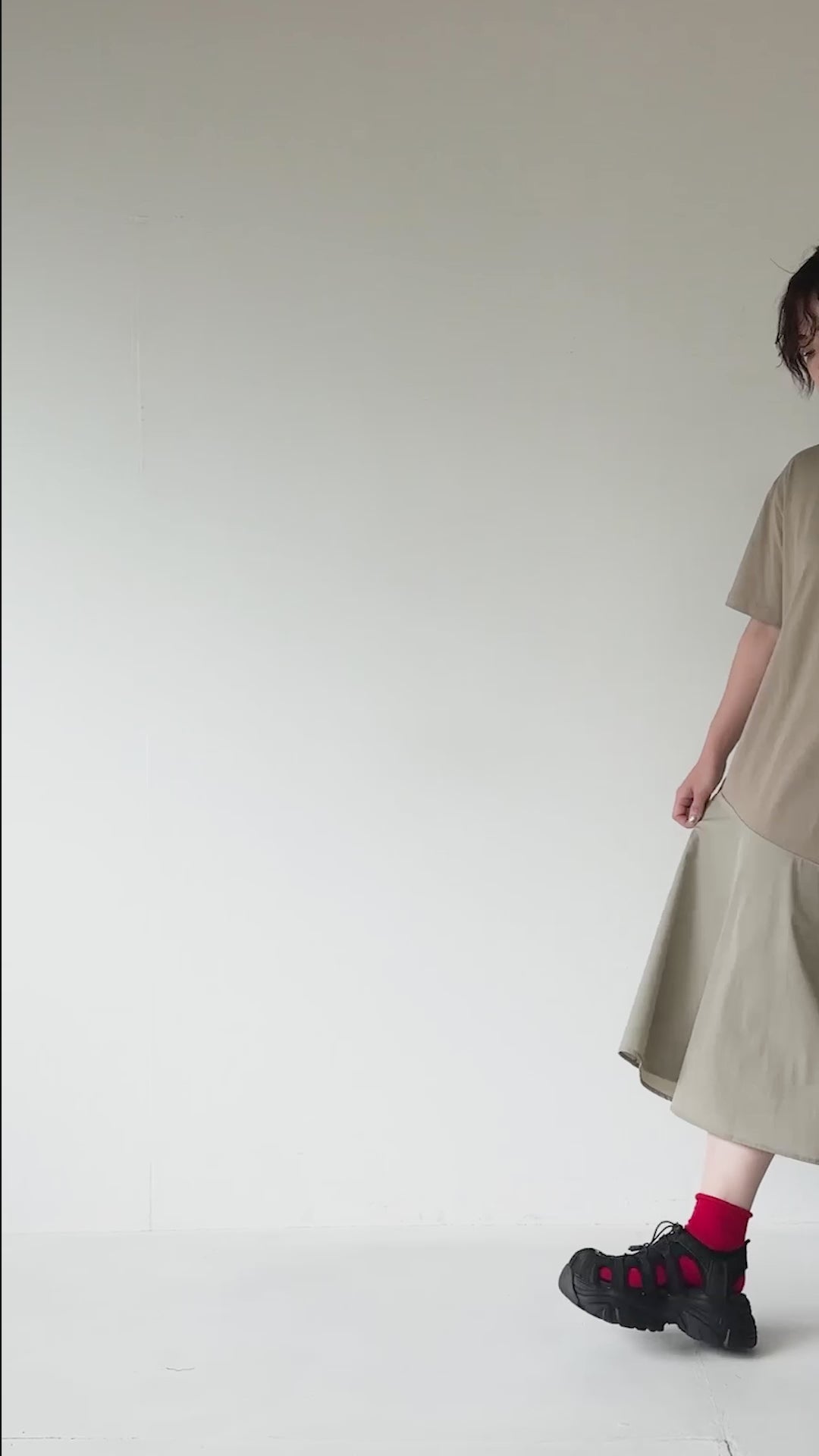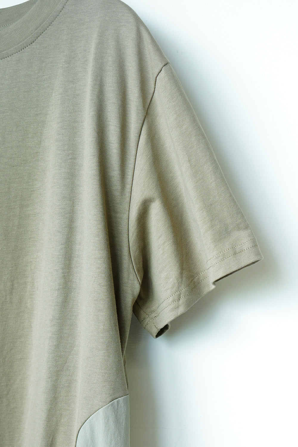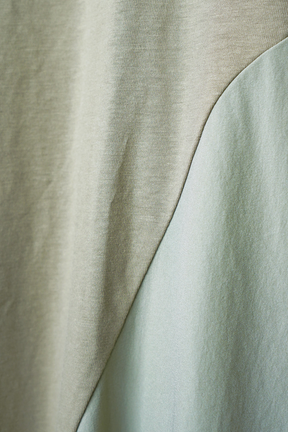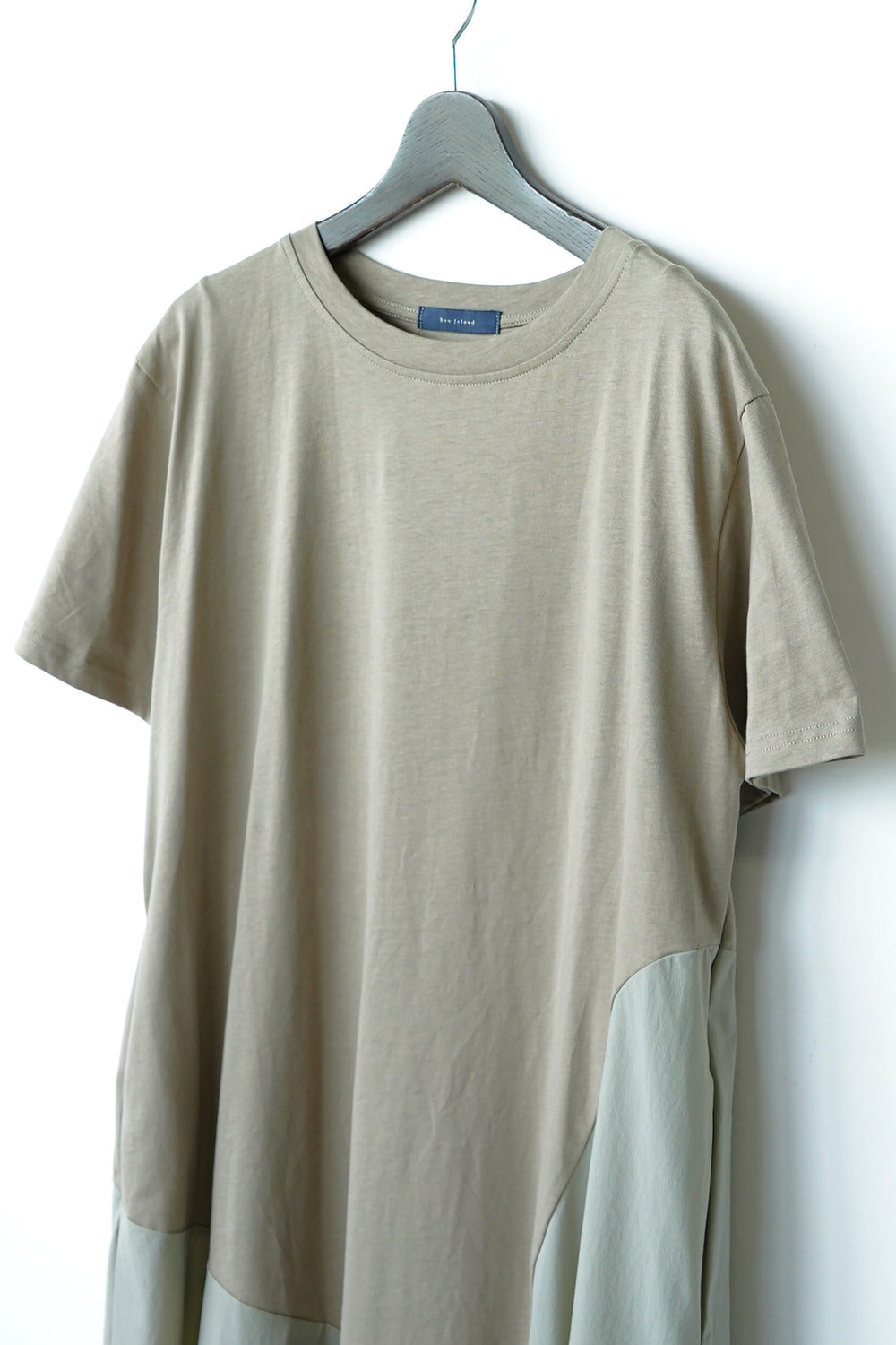 切替デザインが個性的なアシメワンピース。身頃部分は伸縮性のあるカットソー素材で着心地◎ボトムス部分にはポリエステル生地がドッキングされ動きの出るデザインに。裾は段違いになっていて1枚で着られる丈感も魅力的。