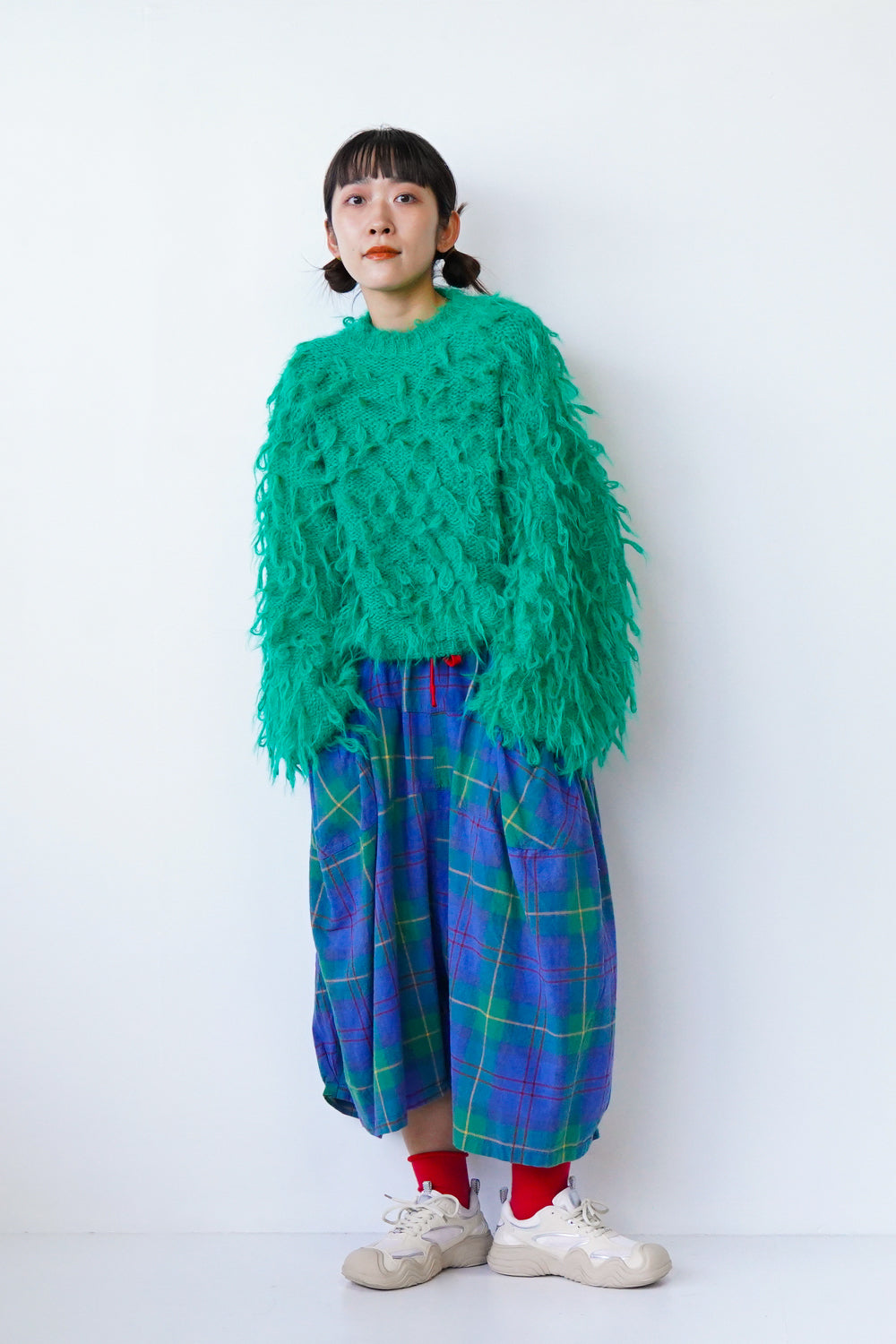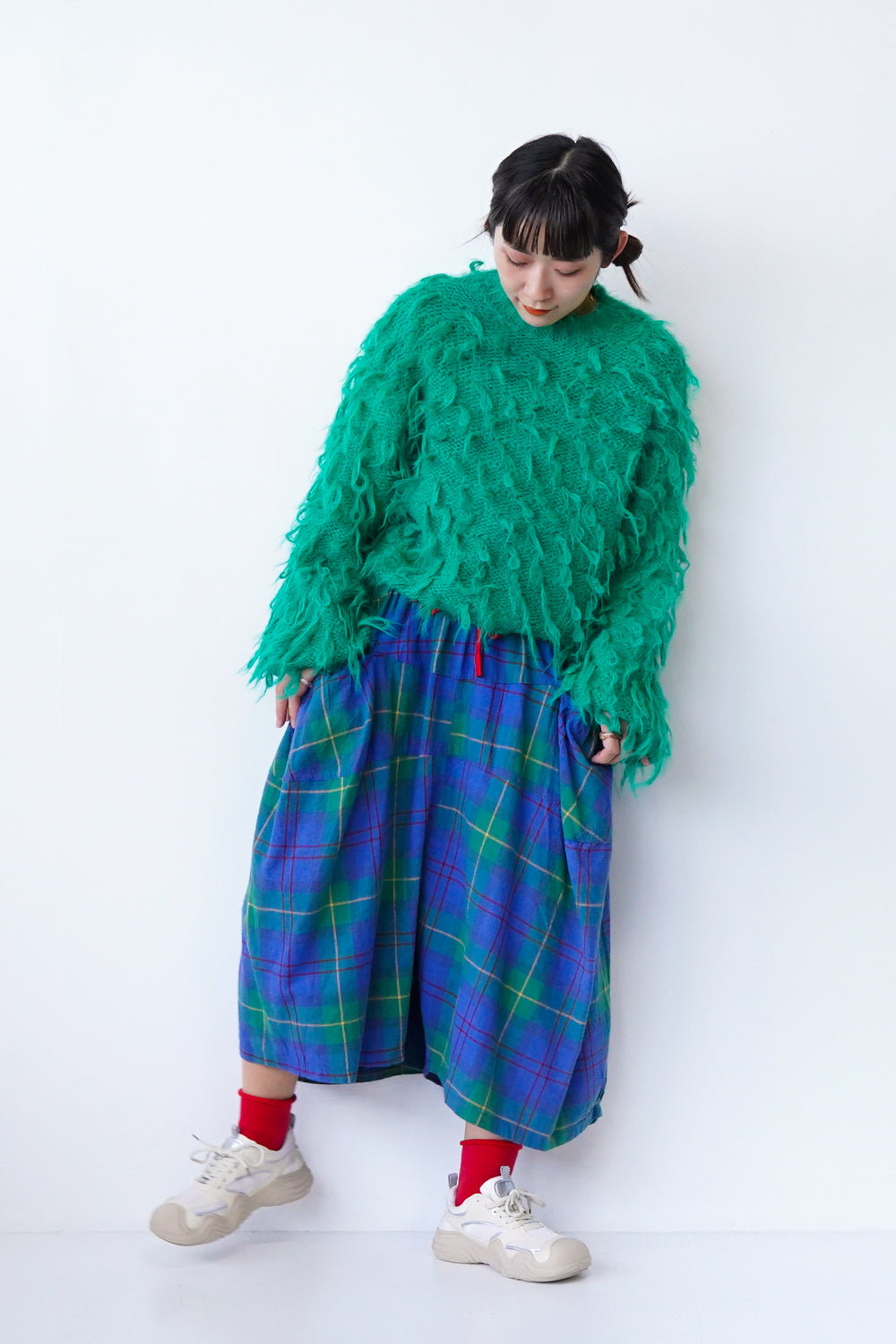 パキっとグリーンが可愛いループニットは下もあえて色物合わせで!チェックのグリーンとさりげなくリンクさせてまとめました!