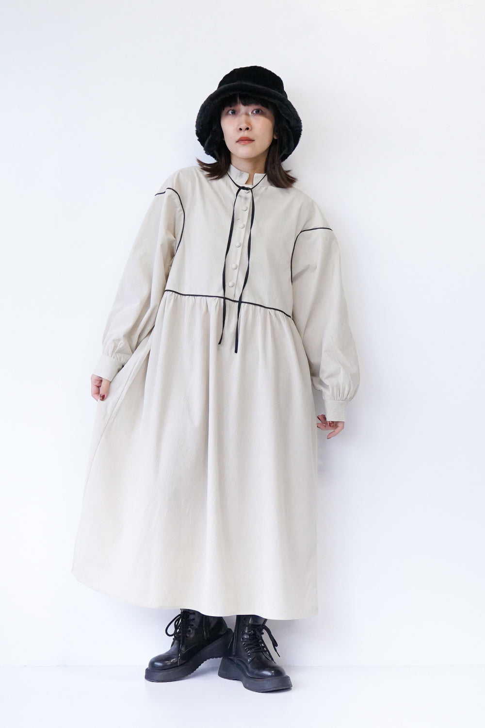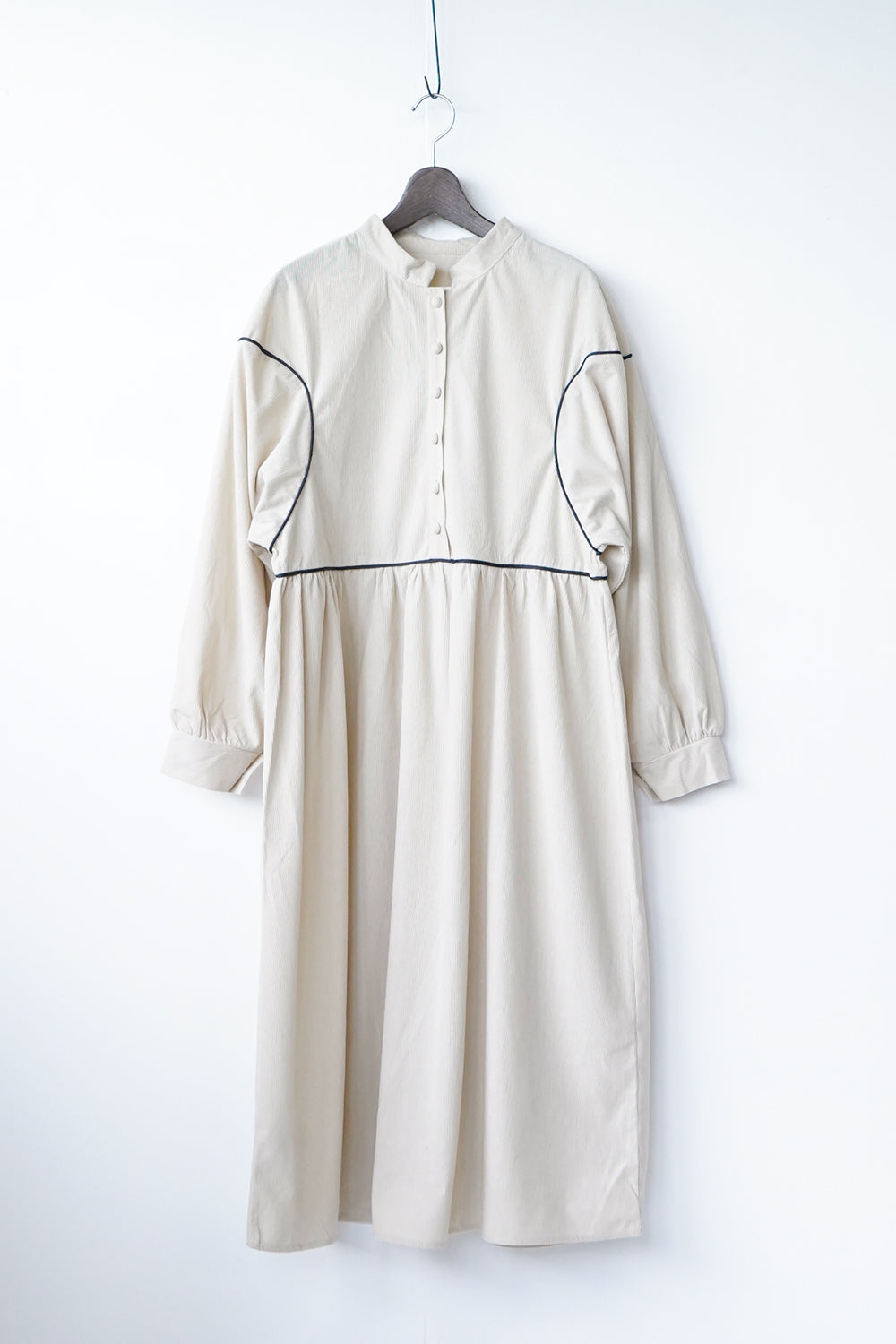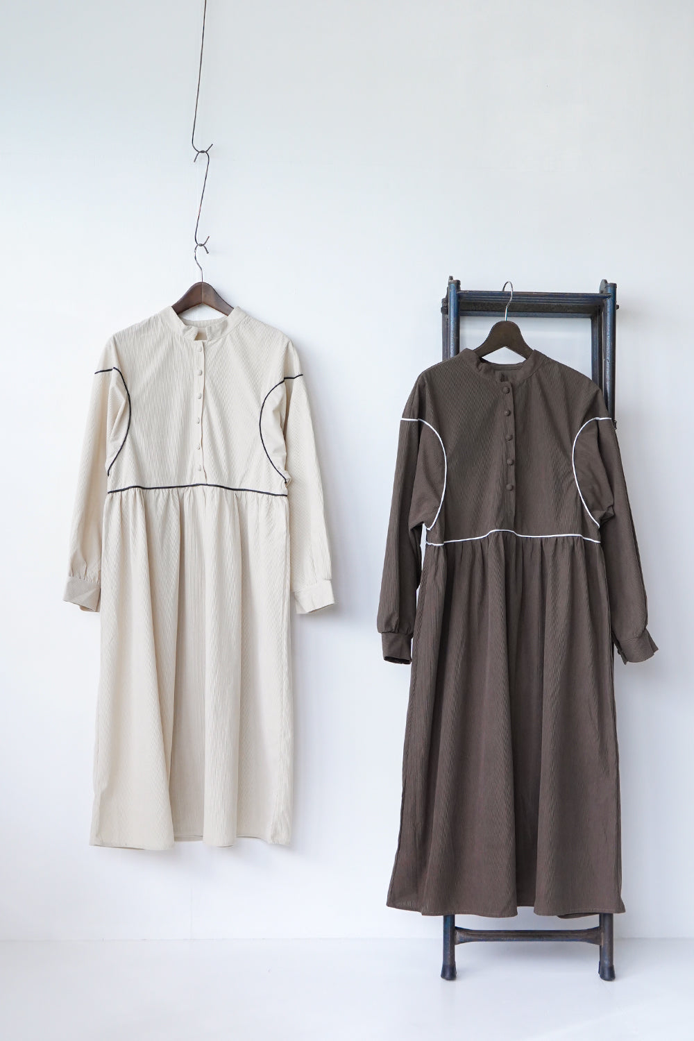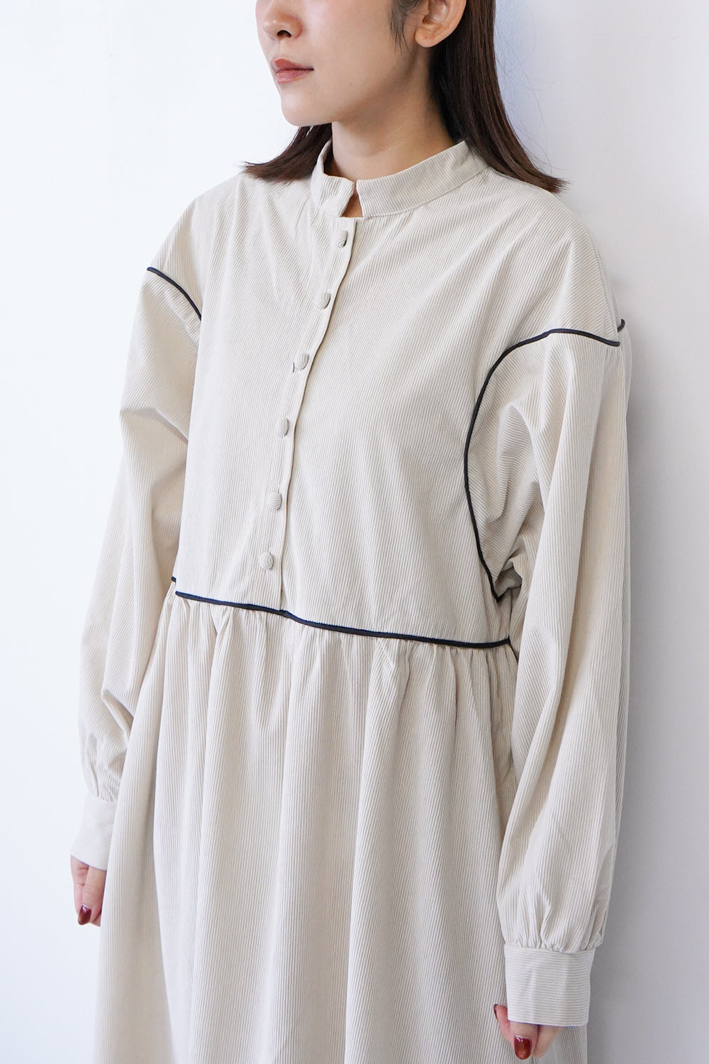 パイピングラインが特徴的なロングワンピース。細畝のコーデュロイ素材がシーズンムードを高めてくれます。袖ぐりがゆったりでストレスフリーな着心地。スタンドネックのきちんと感とくるみボタンのかわいらしさが合わさった女性らしい1枚。