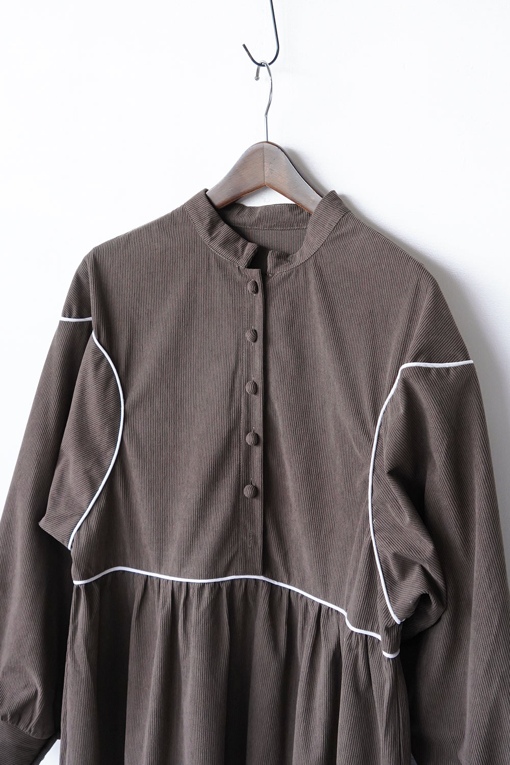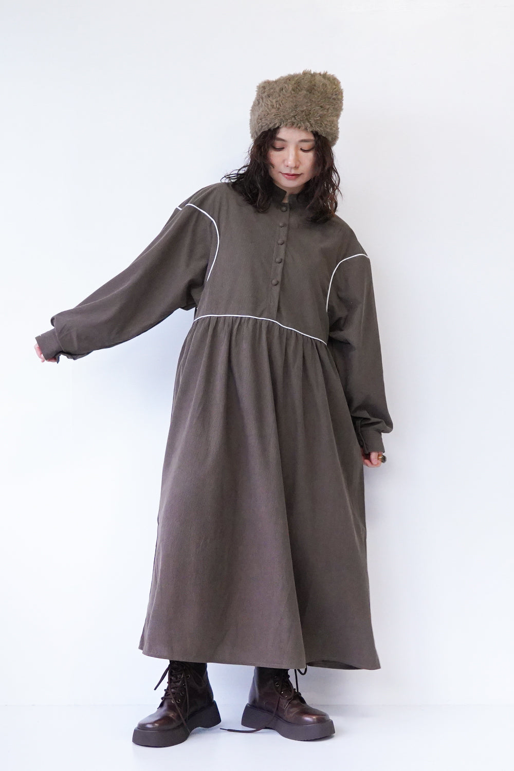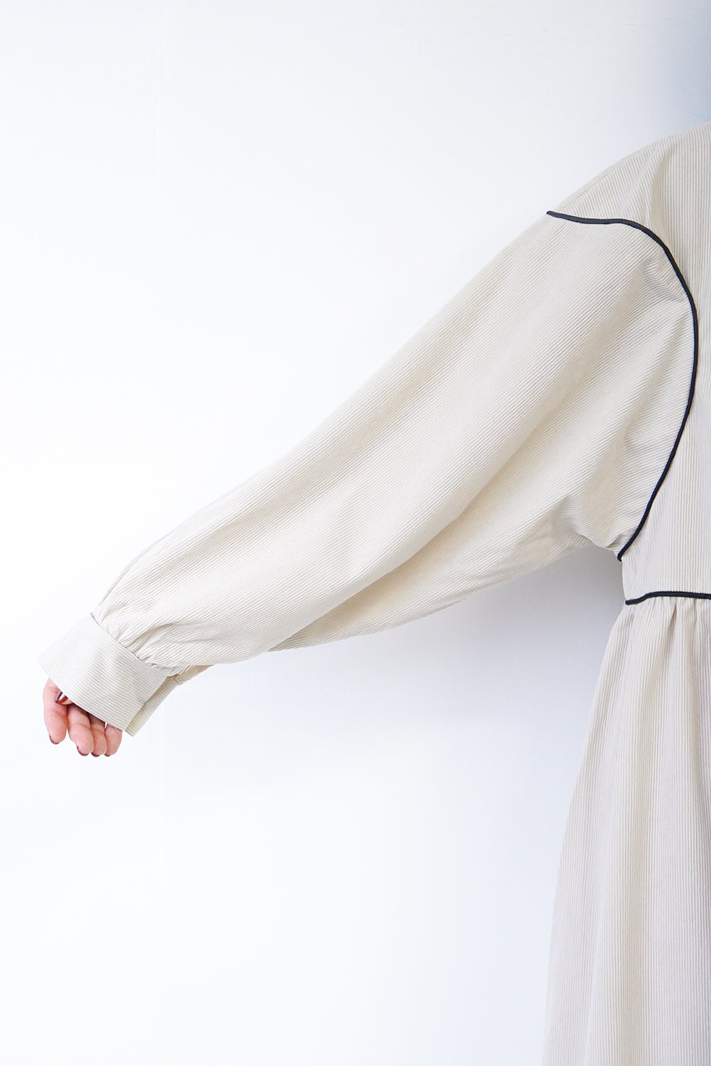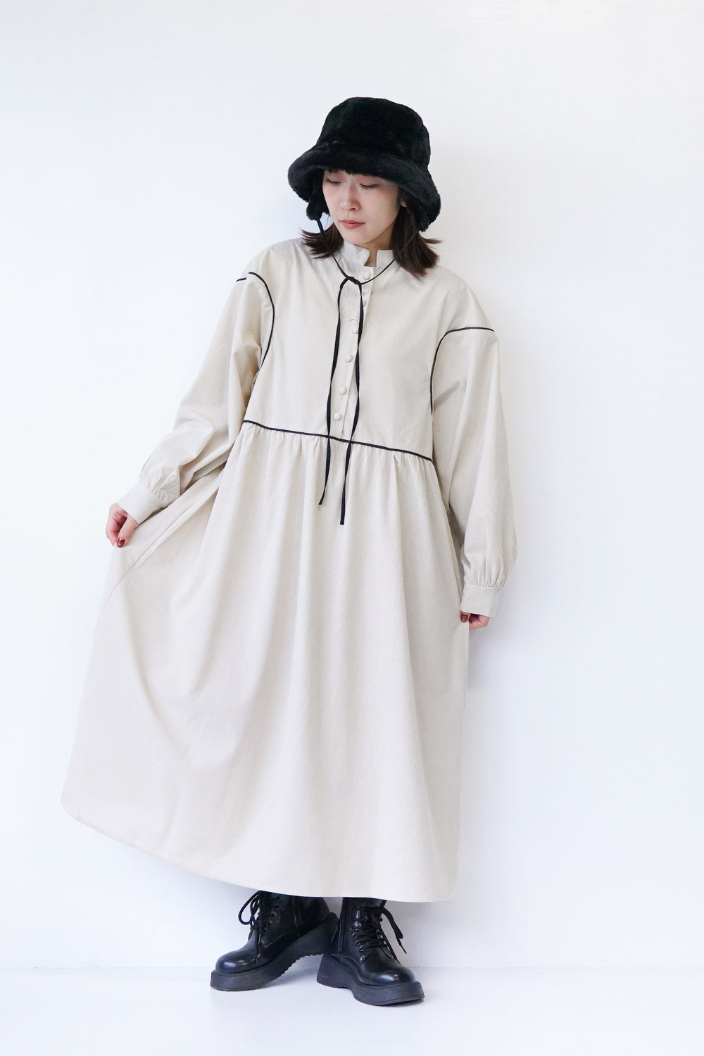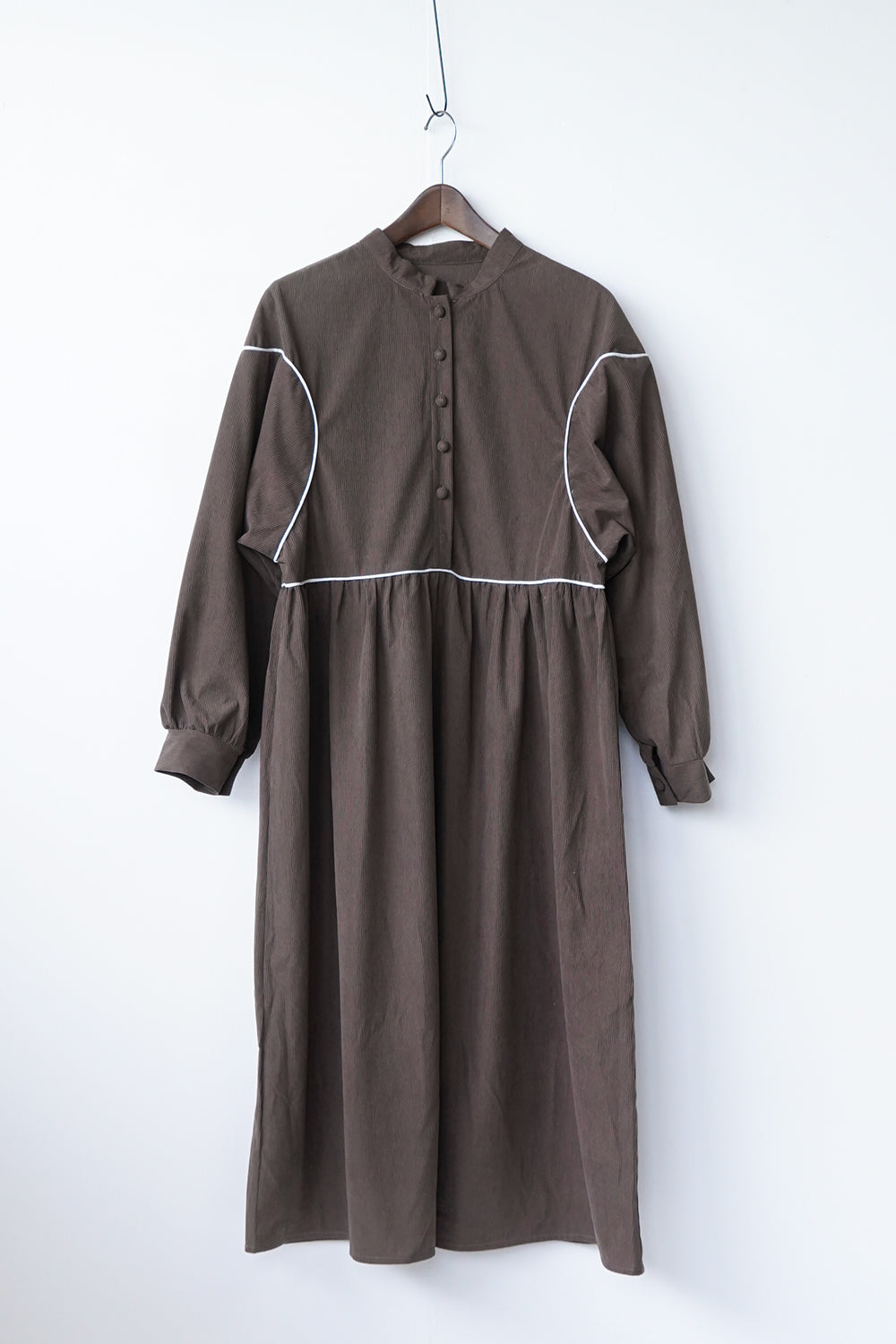 パイピングラインが特徴的なロングワンピース。細畝のコーデュロイ素材がシーズンムードを高めてくれます。袖ぐりがゆったりでストレスフリーな着心地。スタンドネックのきちんと感とくるみボタンのかわいらしさが合わさった女性らしい1枚。