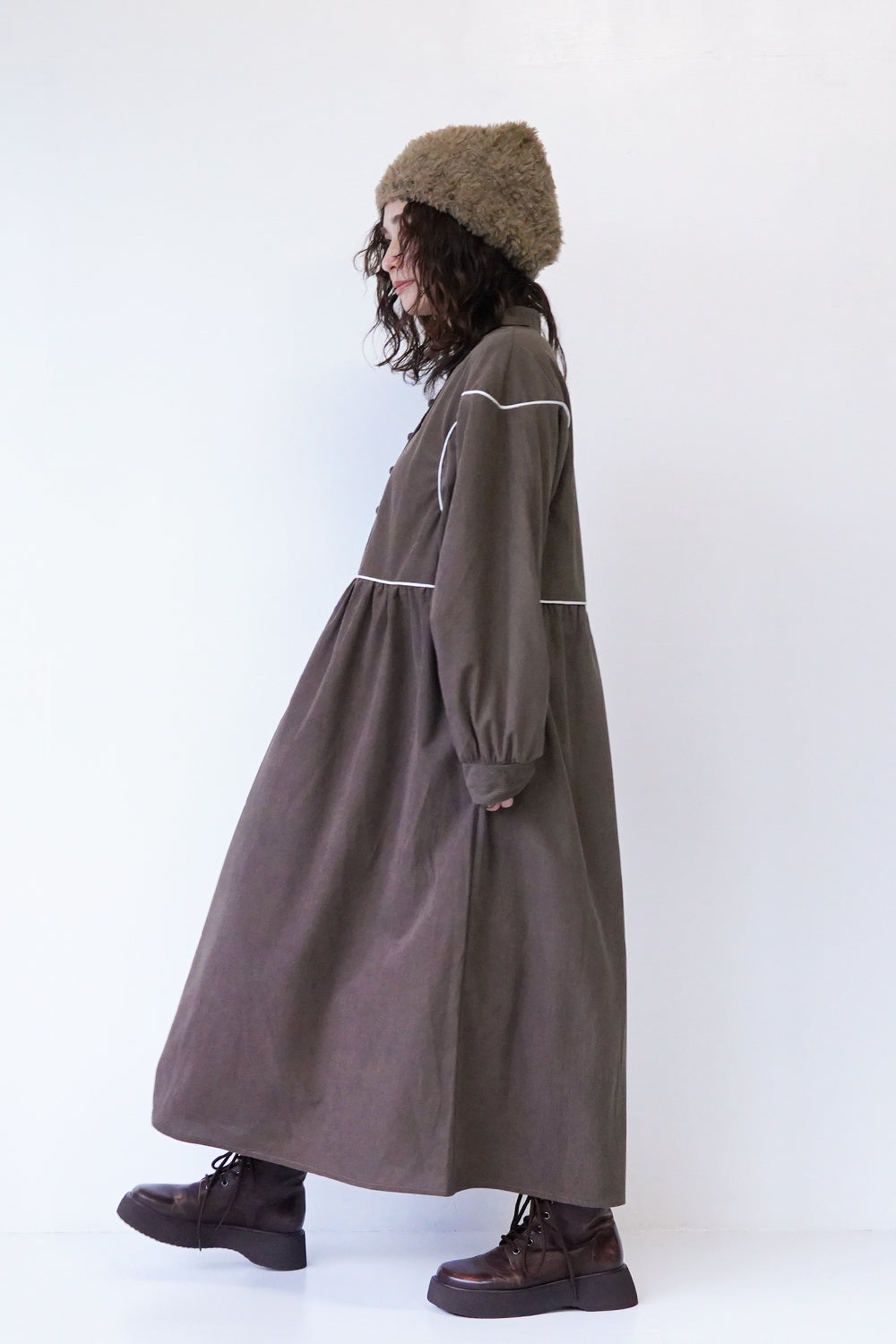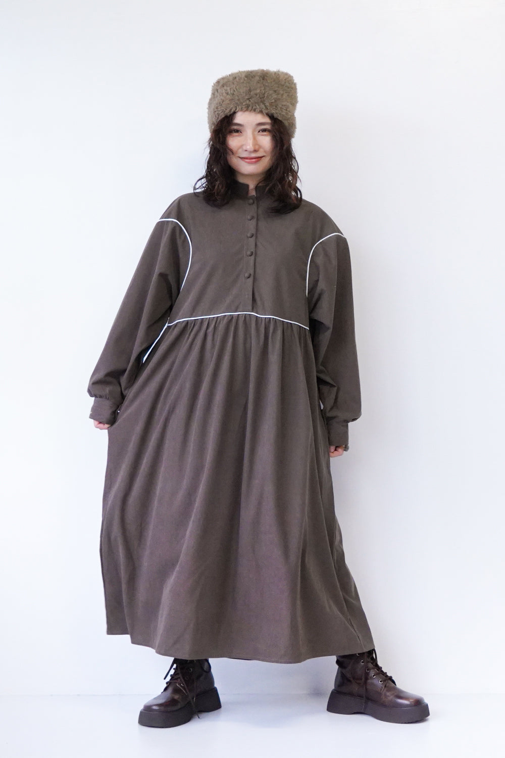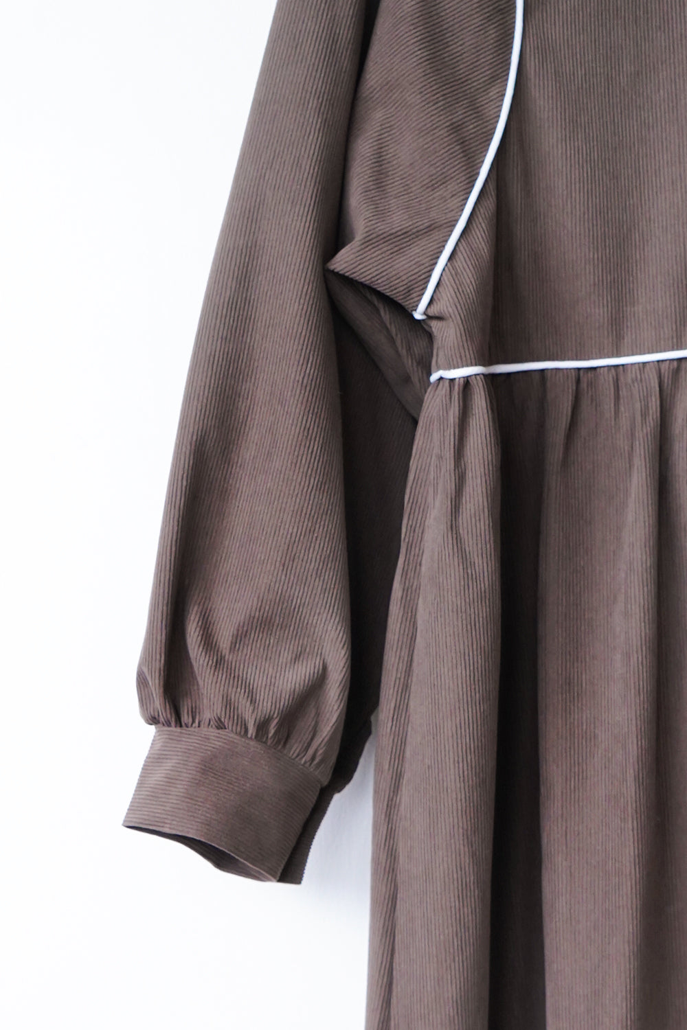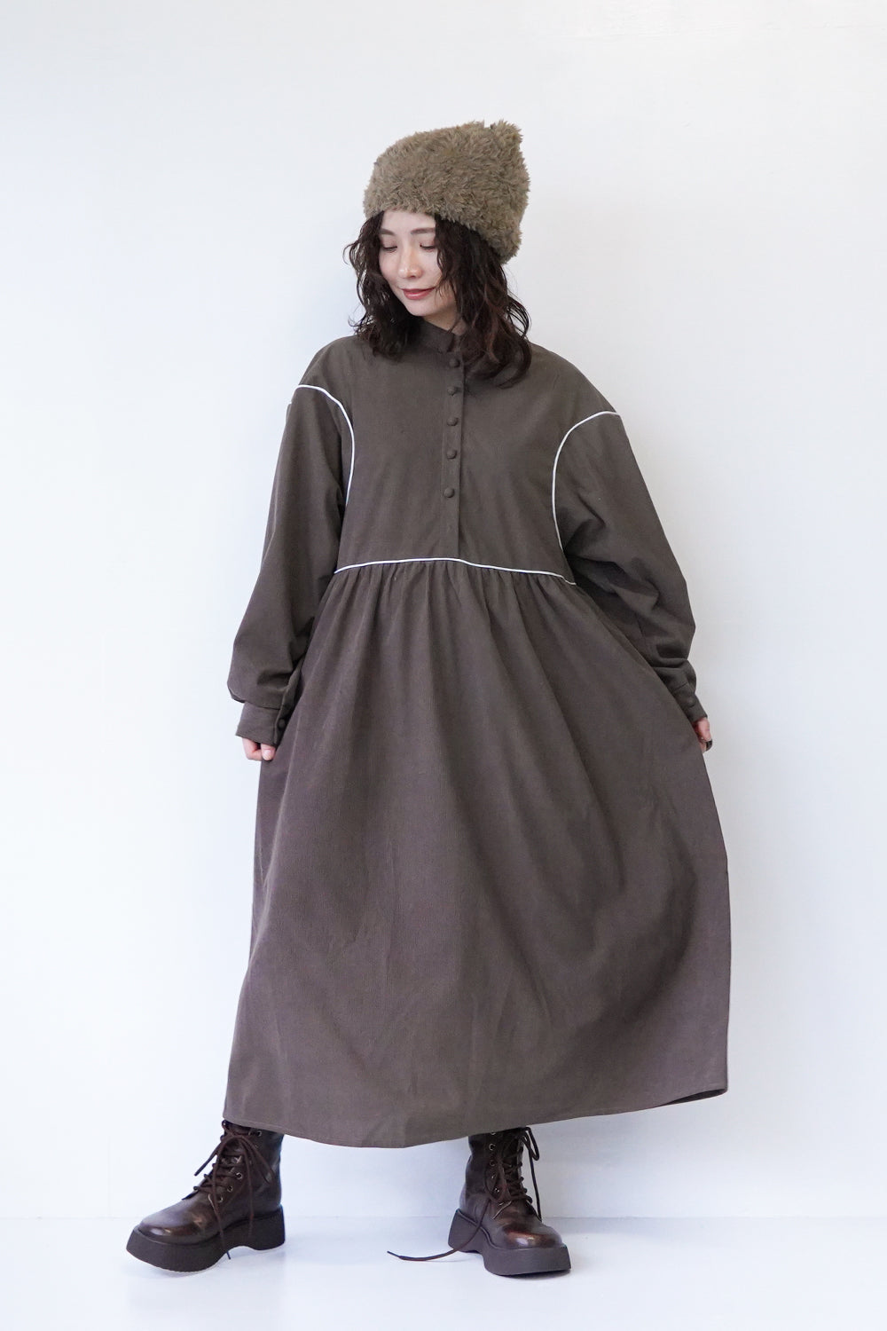 パイピングラインが特徴的なロングワンピース。細畝のコーデュロイ素材がシーズンムードを高めてくれます。袖ぐりがゆったりでストレスフリーな着心地。スタンドネックのきちんと感とくるみボタンのかわいらしさが合わさった女性らしい1枚。
