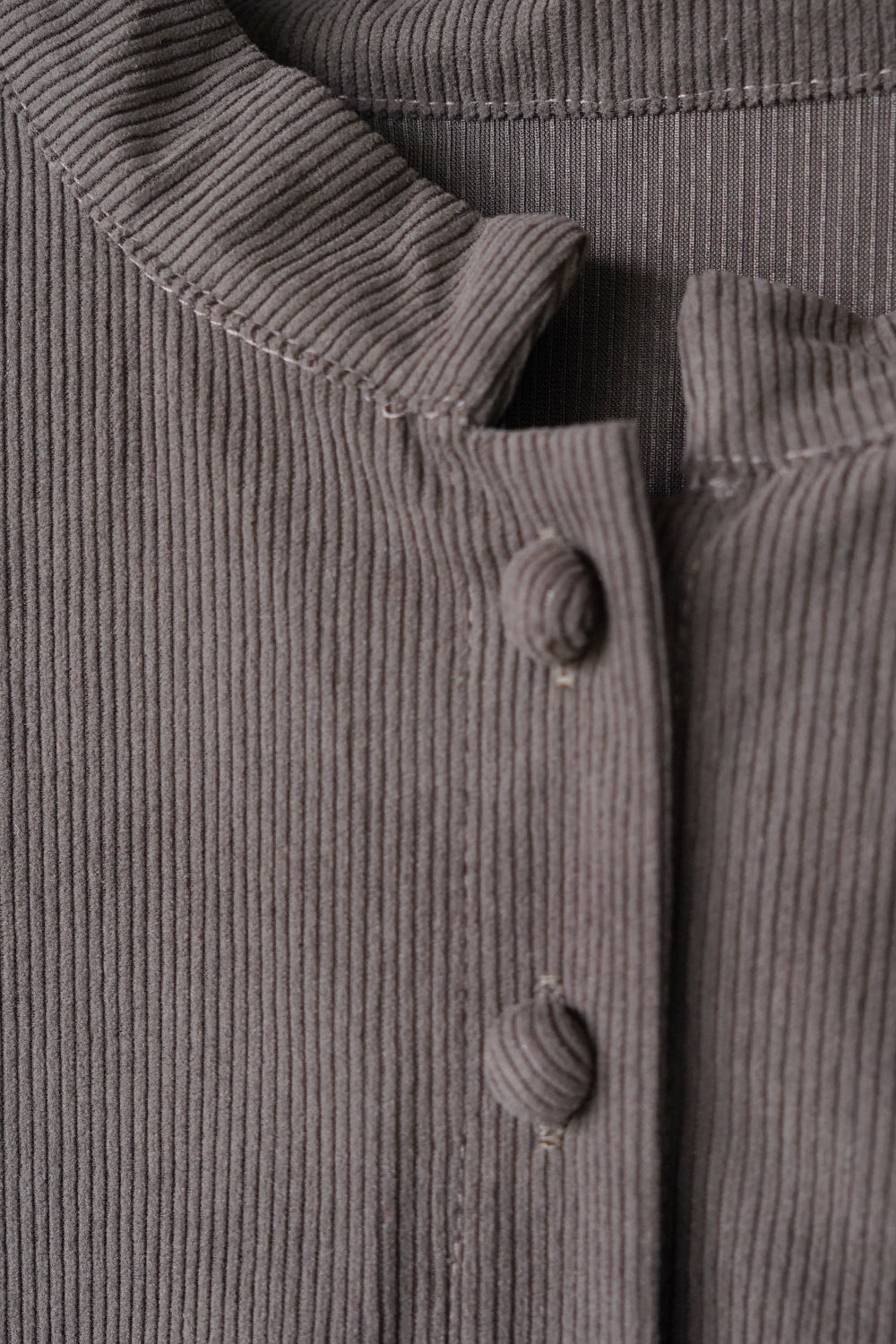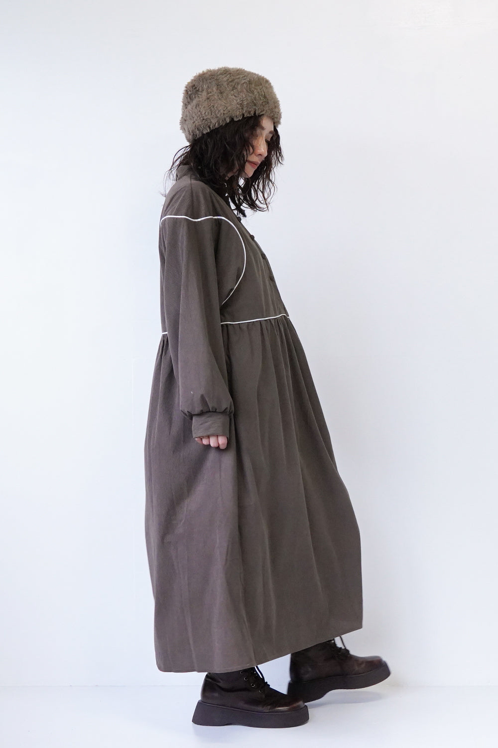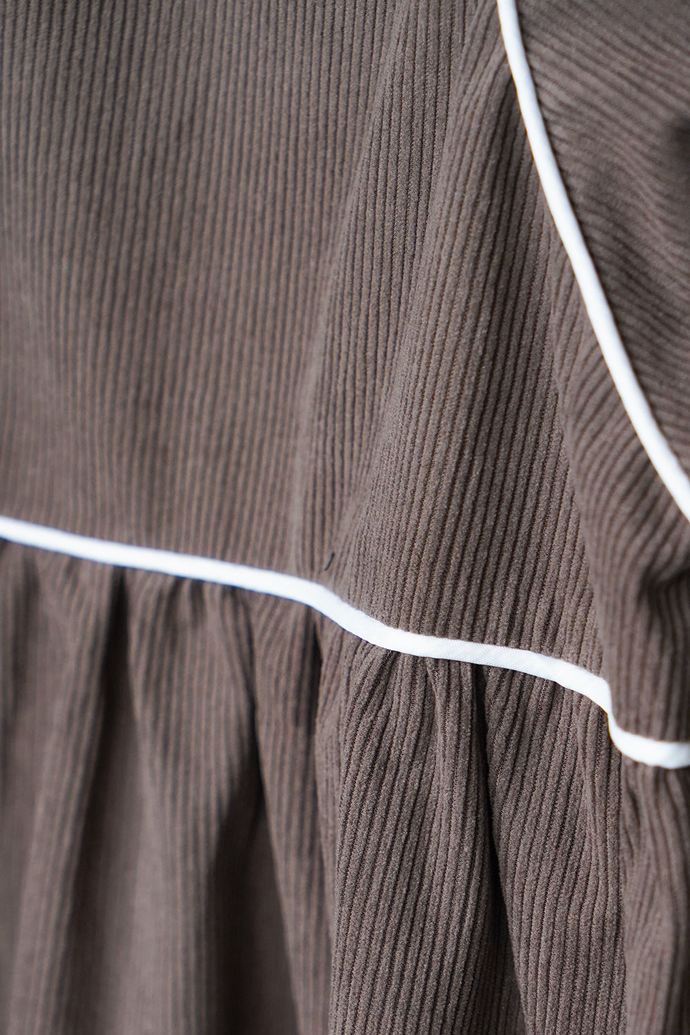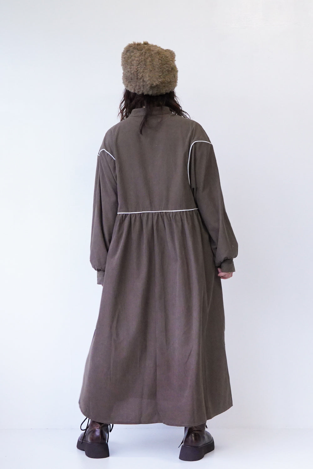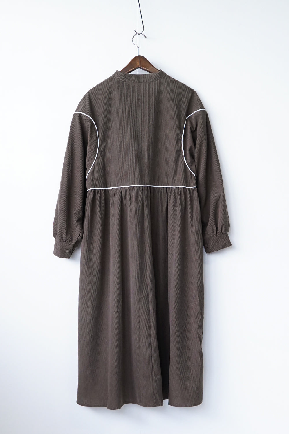 パイピングラインが特徴的なロングワンピース。細畝のコーデュロイ素材がシーズンムードを高めてくれます。袖ぐりがゆったりでストレスフリーな着心地。スタンドネックのきちんと感とくるみボタンのかわいらしさが合わさった女性らしい1枚。