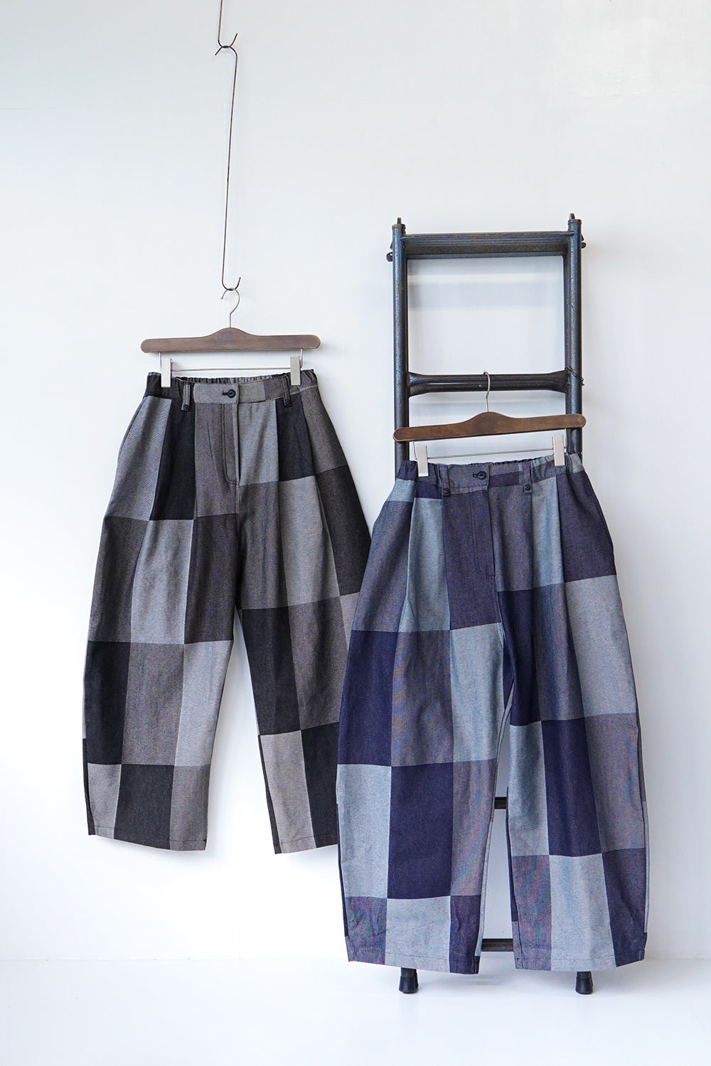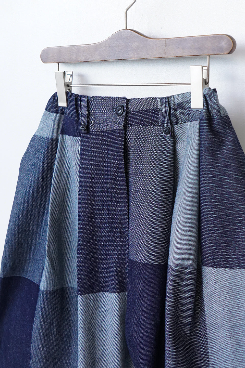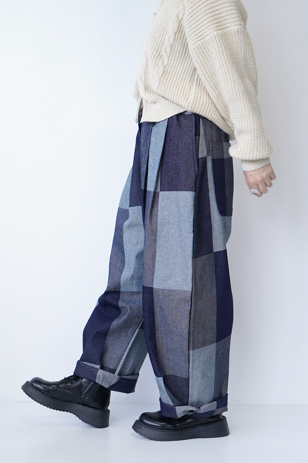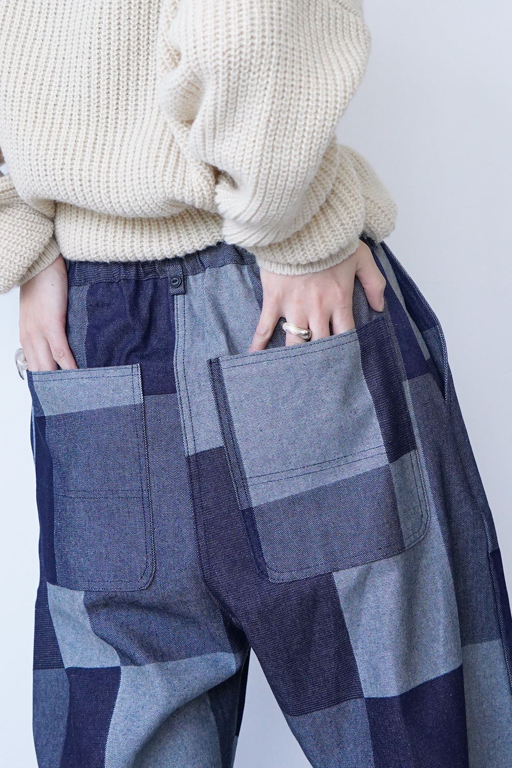 パッチワーク風に施された珍しいテキスタイルのデニムパンツ。デニムの濃淡をボックス型に切り替えた個性的なデザイン。しっかりとハリのあるデニム生地でやや丸みのあるカーブシルエットが特徴的。ウエストはストレスフリーなオールゴム仕様で、ベルトループも付いているので調整も可能。長めの丈なのでロールアップスタイルもおすすめです。