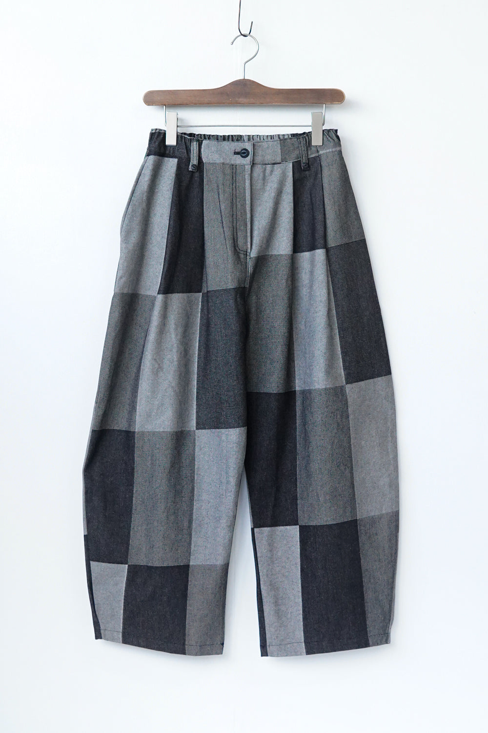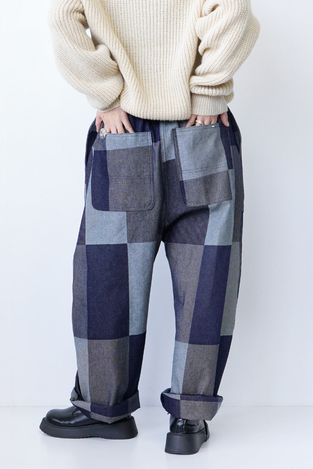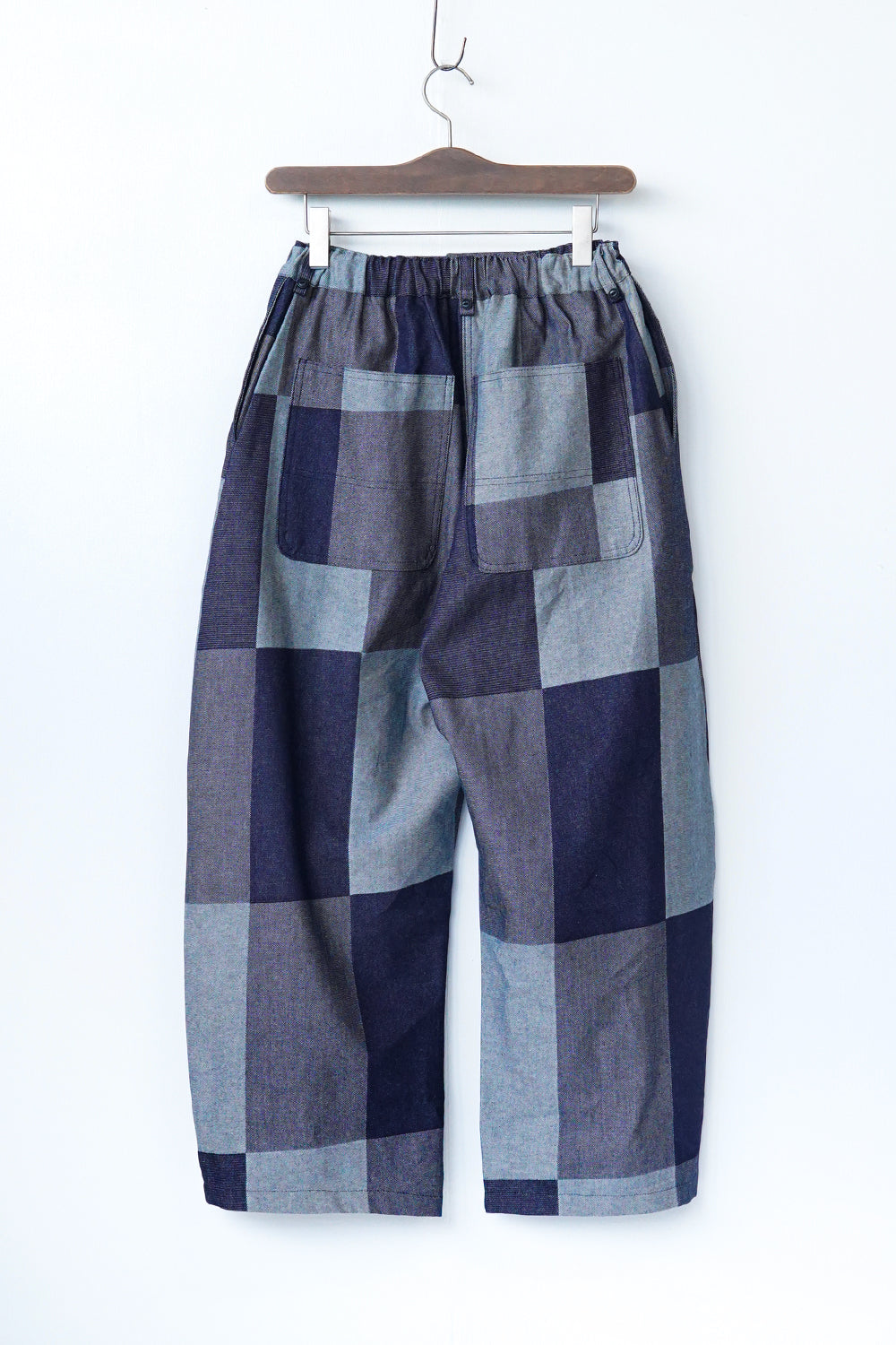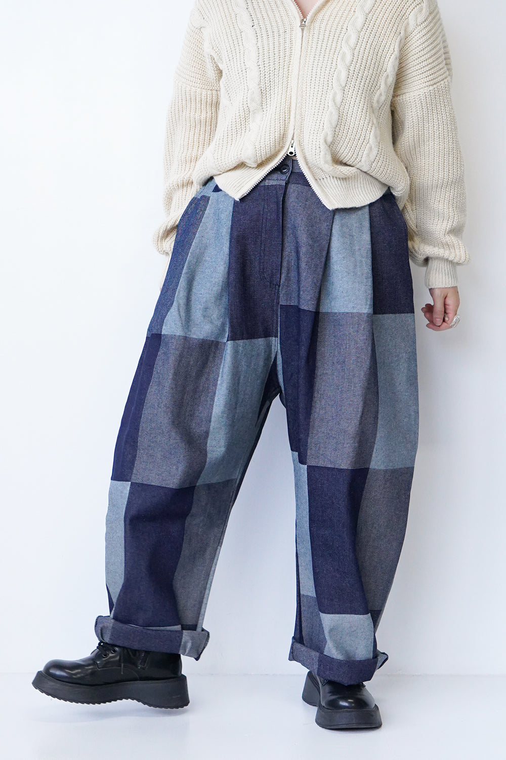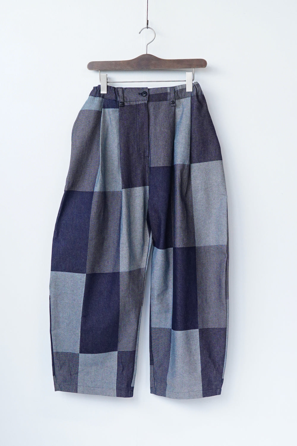 パッチワーク風に施された珍しいテキスタイルのデニムパンツ。デニムの濃淡をボックス型に切り替えた個性的なデザイン。しっかりとハリのあるデニム生地でやや丸みのあるカーブシルエットが特徴的。ウエストはストレスフリーなオールゴム仕様で、ベルトループも付いているので調整も可能。長めの丈なのでロールアップスタイルもおすすめです。