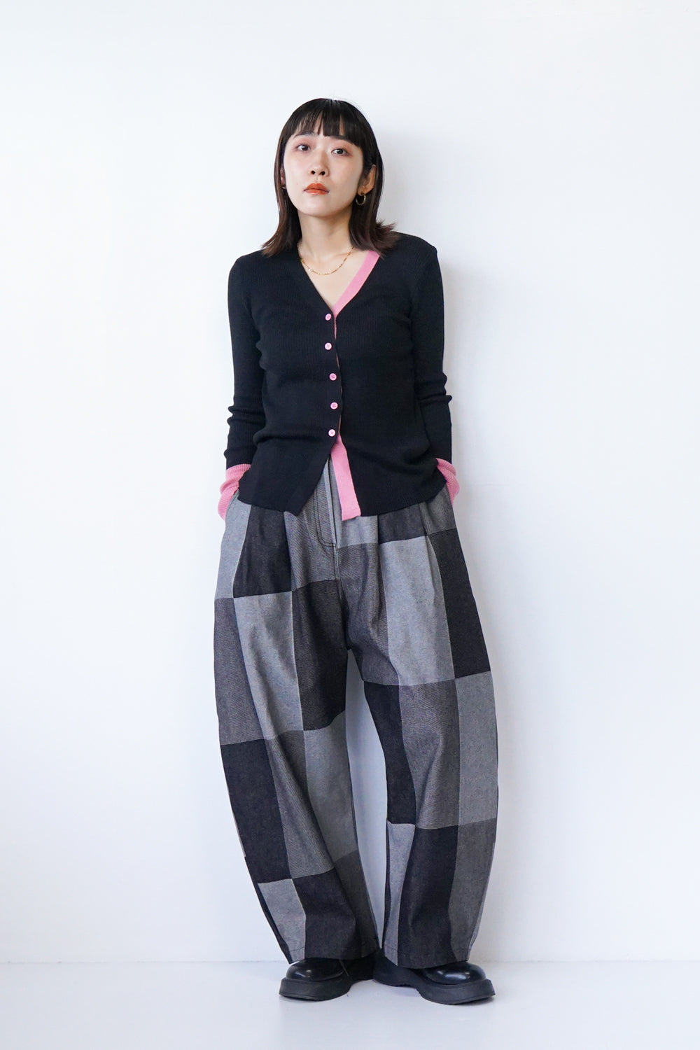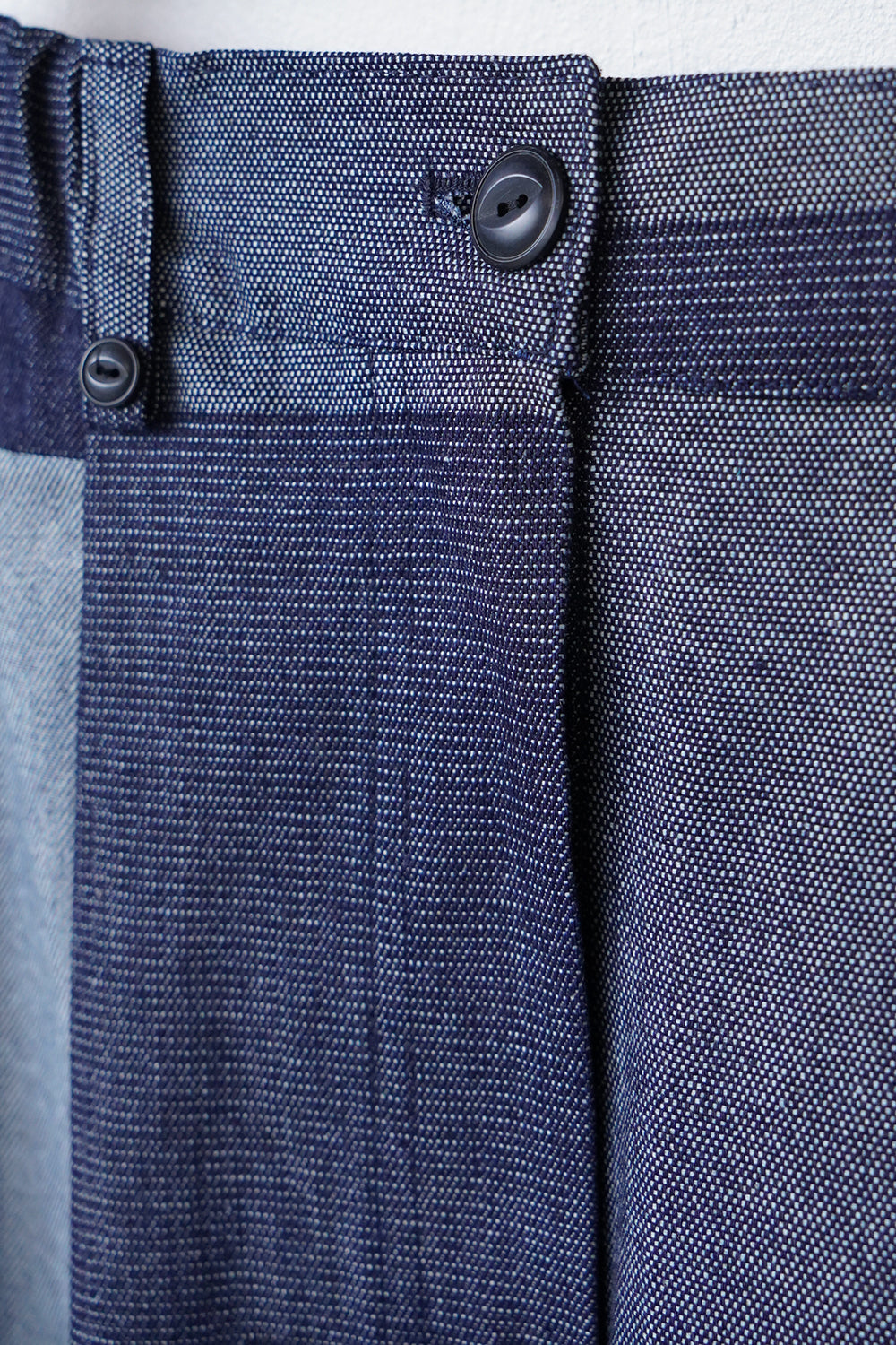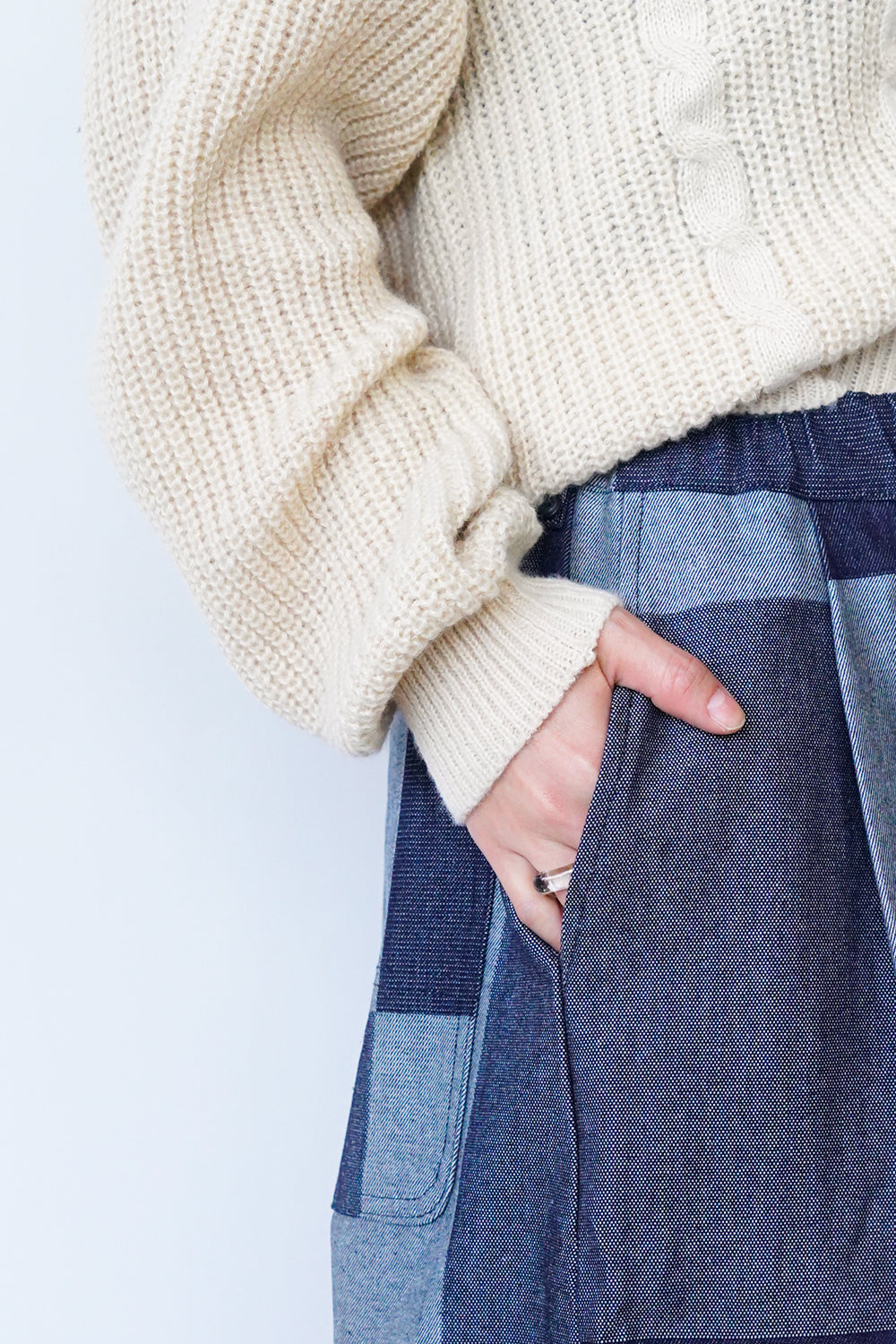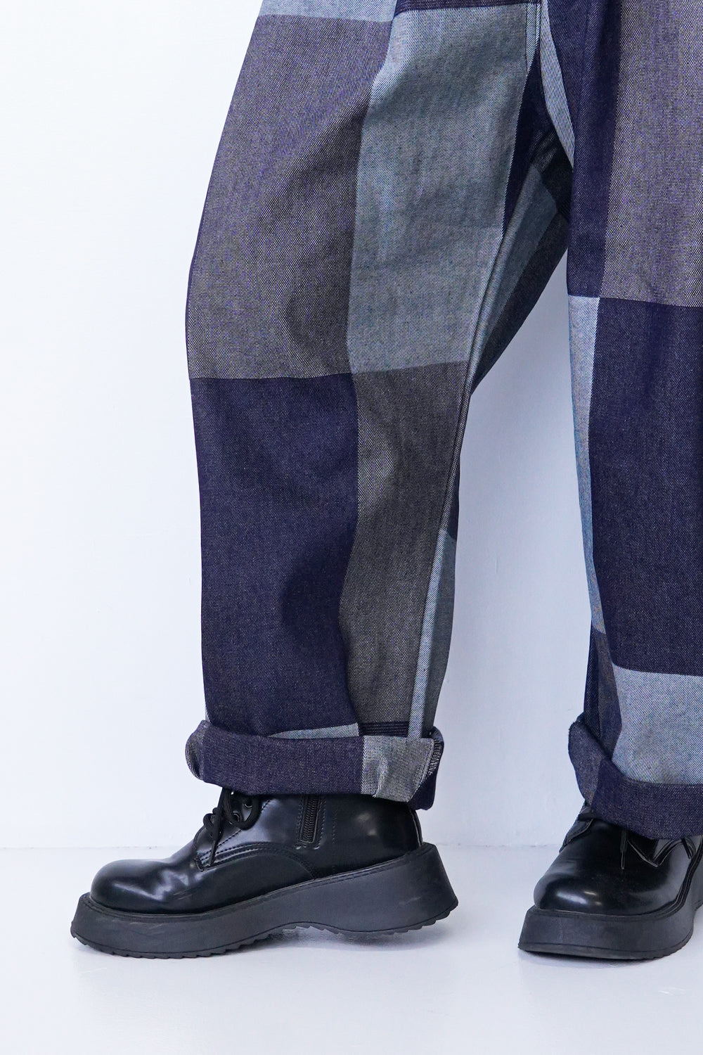 パッチワーク風に施された珍しいテキスタイルのデニムパンツ。デニムの濃淡をボックス型に切り替えた個性的なデザイン。しっかりとハリのあるデニム生地でやや丸みのあるカーブシルエットが特徴的。ウエストはストレスフリーなオールゴム仕様で、ベルトループも付いているので調整も可能。長めの丈なのでロールアップスタイルもおすすめです。