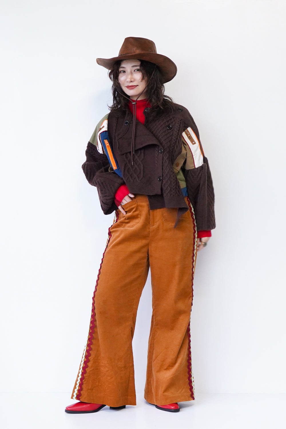 リックラックテープデザインがインパクトのある【LILA n’ citta】オリジナルのコーデュロイパンツ。ポップな配色のなみなみラインが特徴的な1枚。腰回りはすっきりめにし膝から裾にかけてフレアラインが出るようなシルエットにしバランスよく仕立てた1枚。秋らしいこっくりとしたカラー展開にしてセットアップでスタイリングできるように同生地でジャケットも作りました。フロントのポケットもアクセントに◎