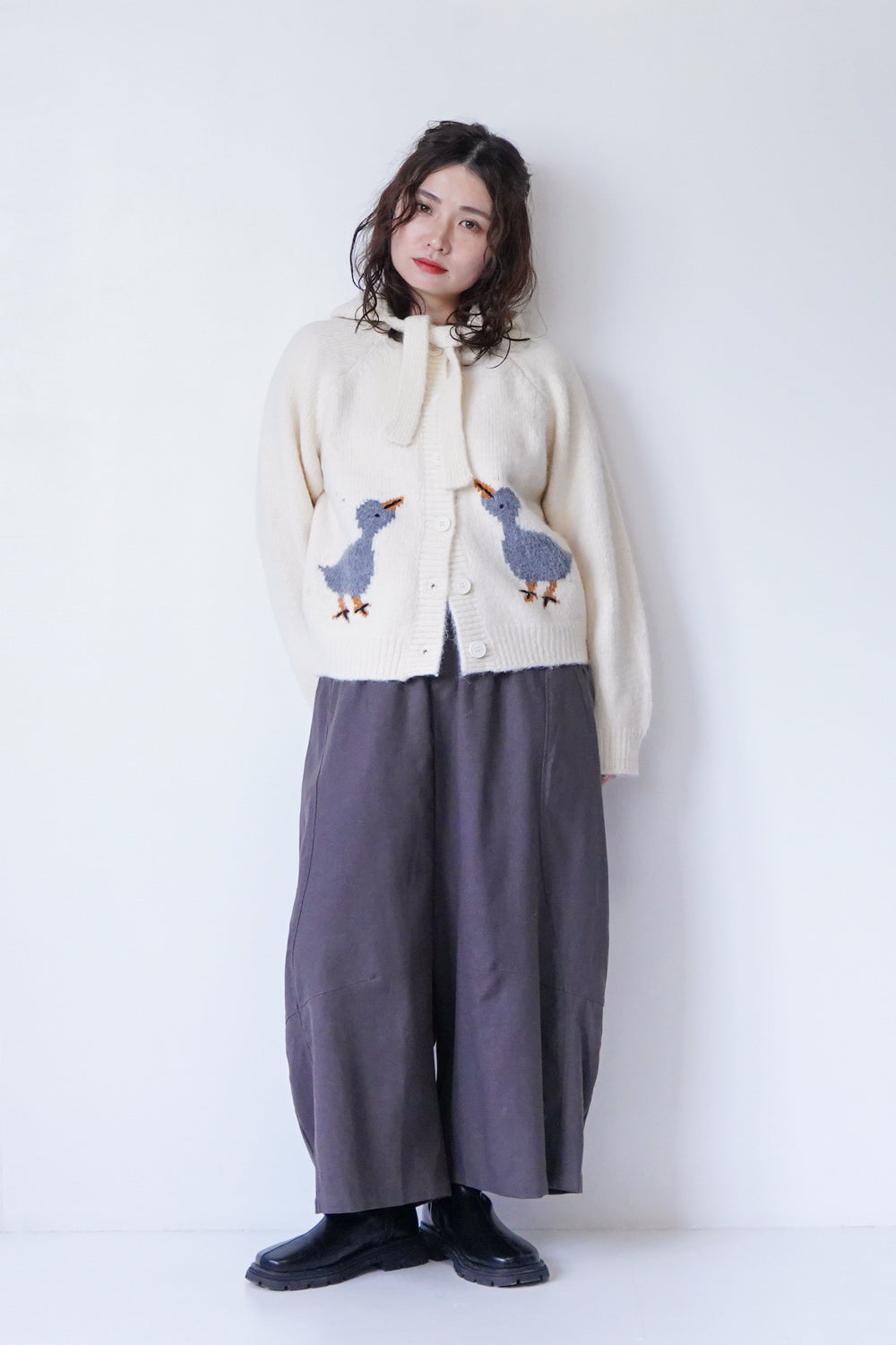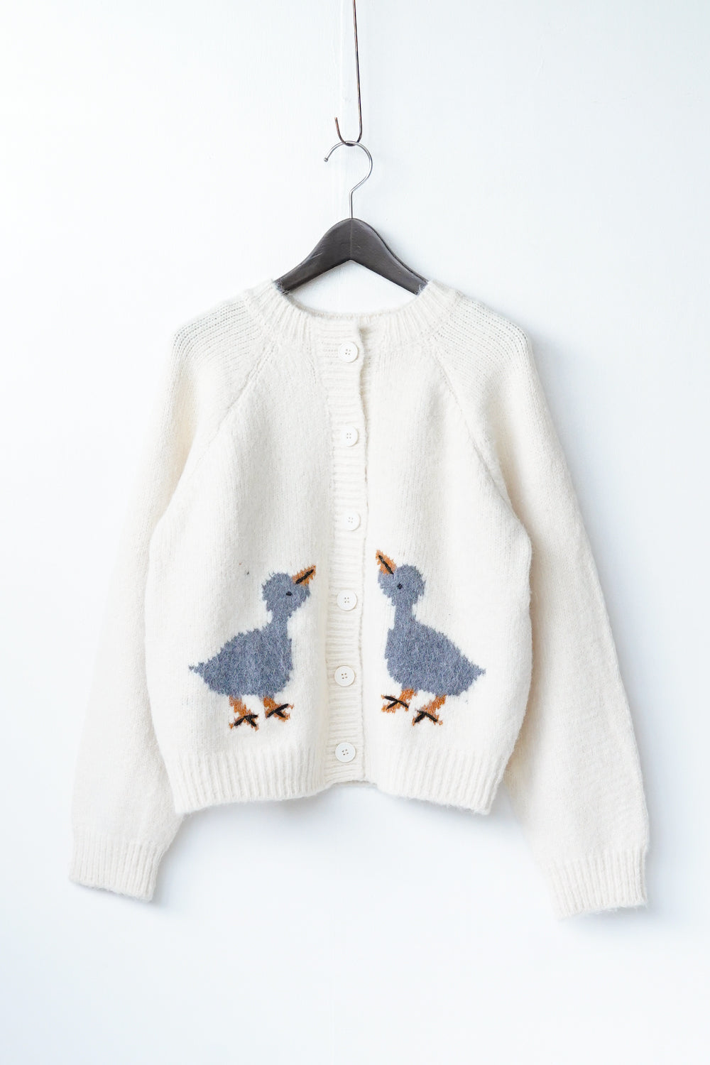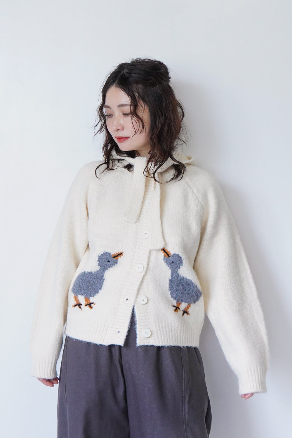 キャッチーな鳥柄がかわいいカーディガンとフードのセットアップ。地厚のニットがほっこり暖かみのあるデザイン。セットはもちろん、単品使いでもコーディネートの主役になるおすすめアイテム。鳥好きさん必見、他にはないデザインのおすすめの1枚です。