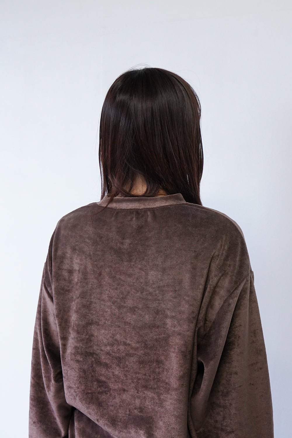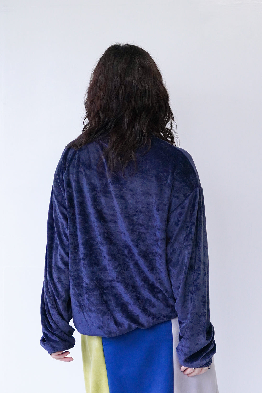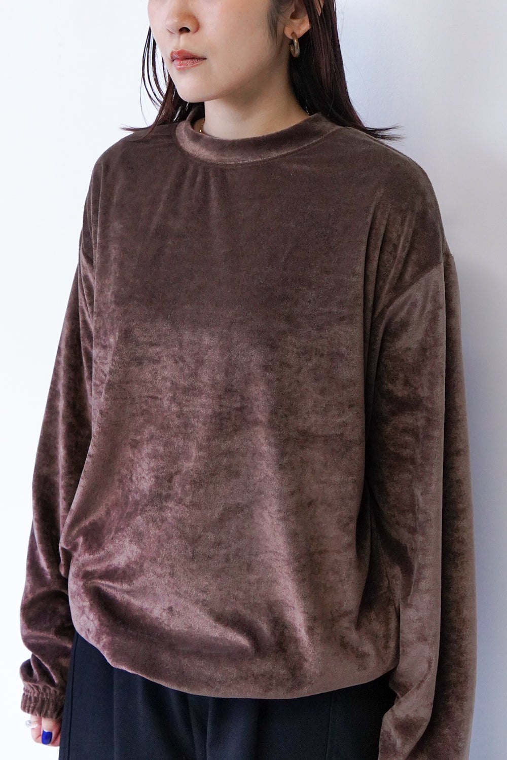高級感のあるベルベット調のプルオーバー。ストレッチ性が高く柔らかく心地いい着心地が◎袖口と裾はゴム仕様。体のラインを拾わないリラックス感のあるサイズ感。