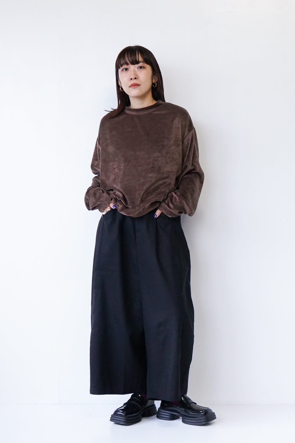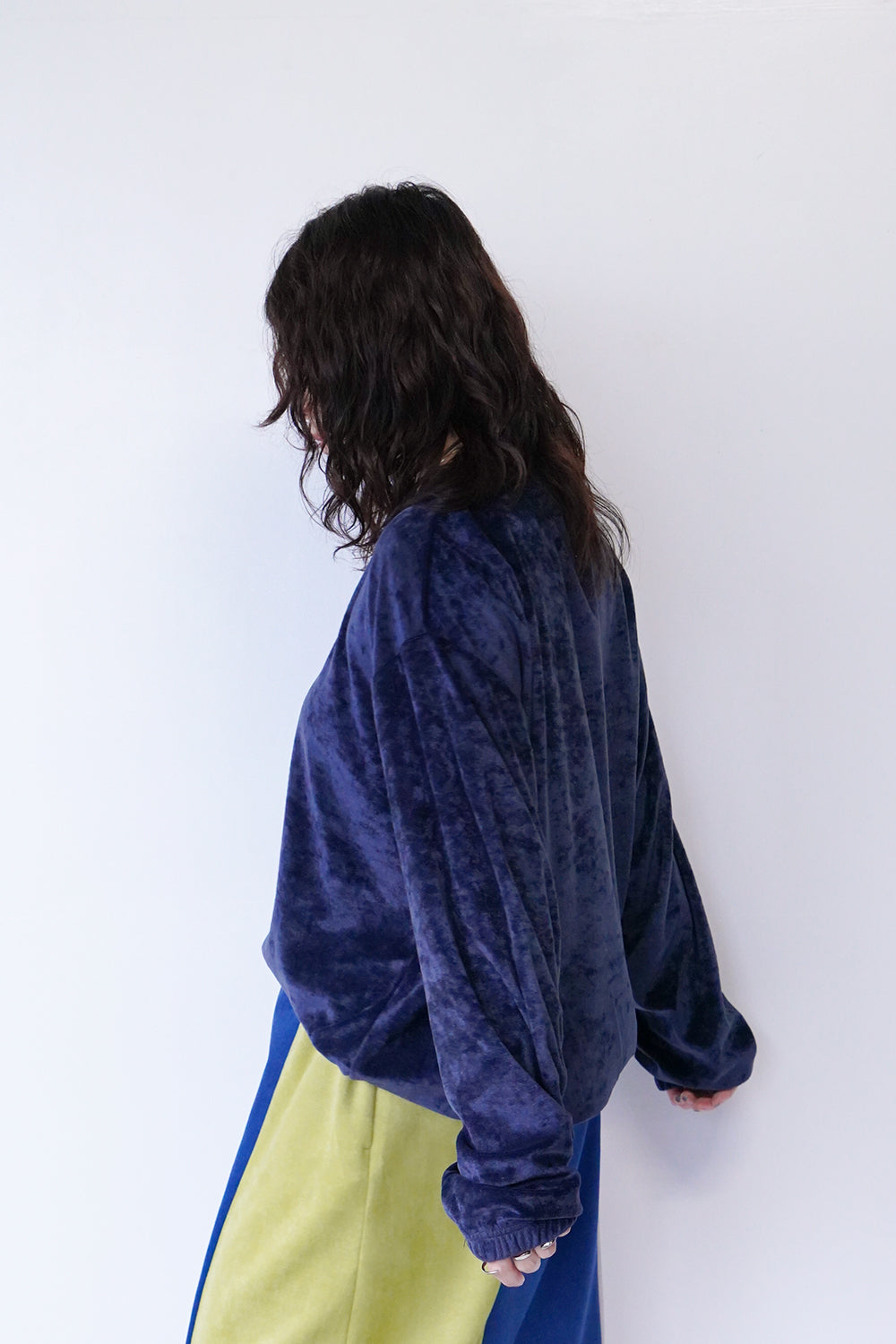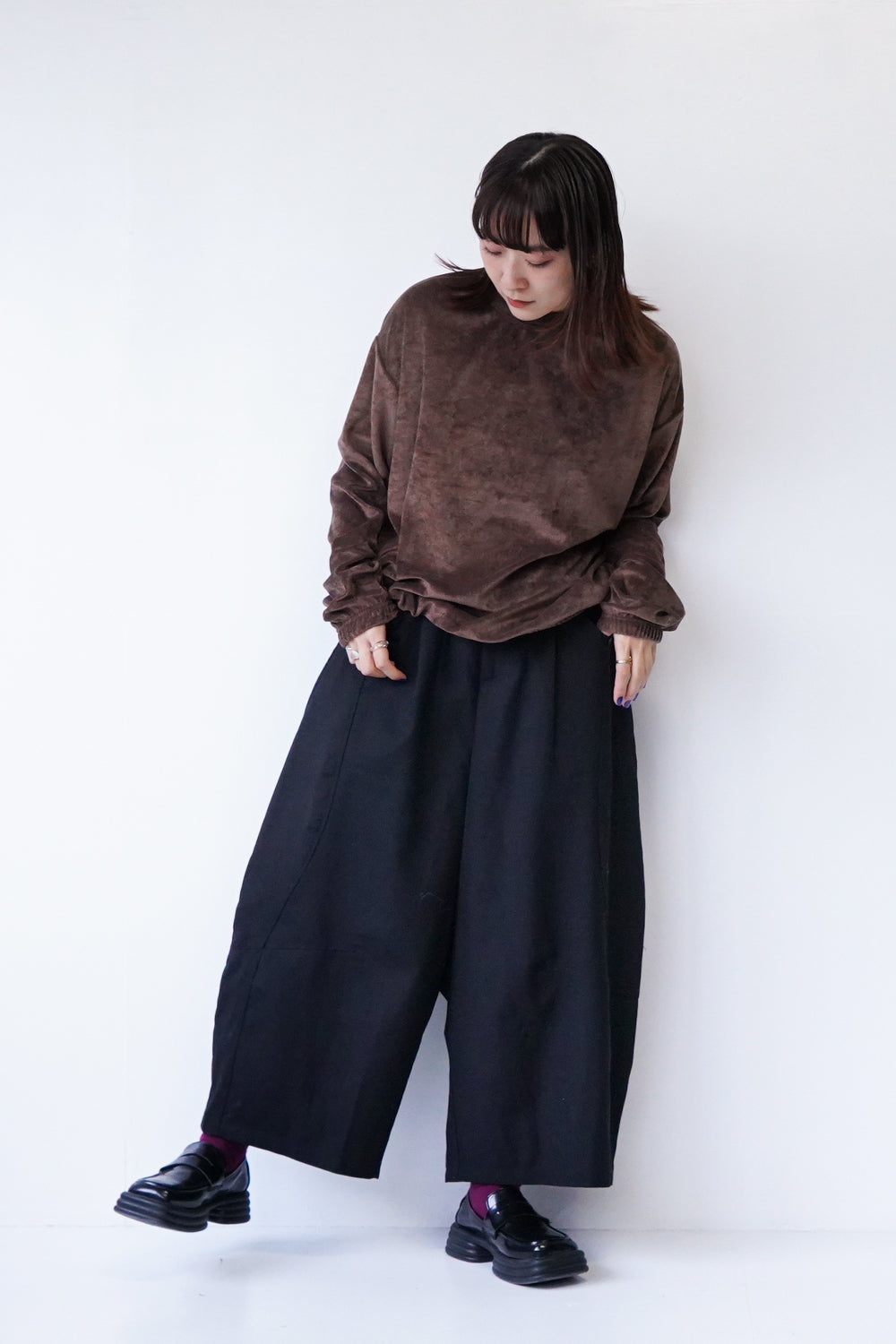 高級感のあるベルベット調のプルオーバー。ストレッチ性が高く柔らかく心地いい着心地が◎袖口と裾はゴム仕様。体のラインを拾わないリラックス感のあるサイズ感。
