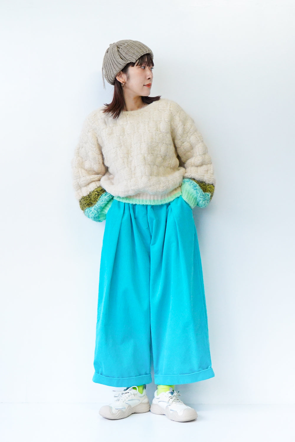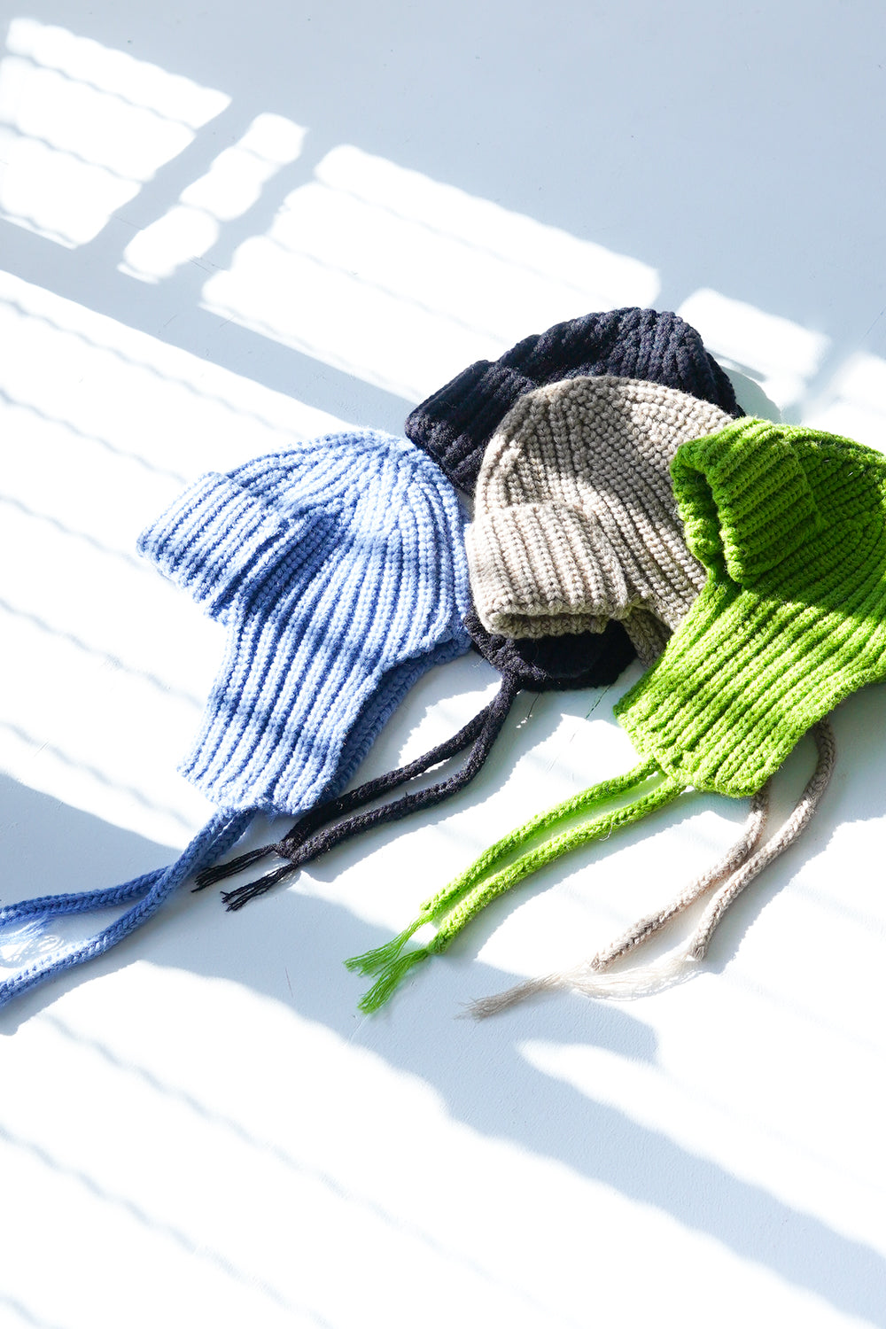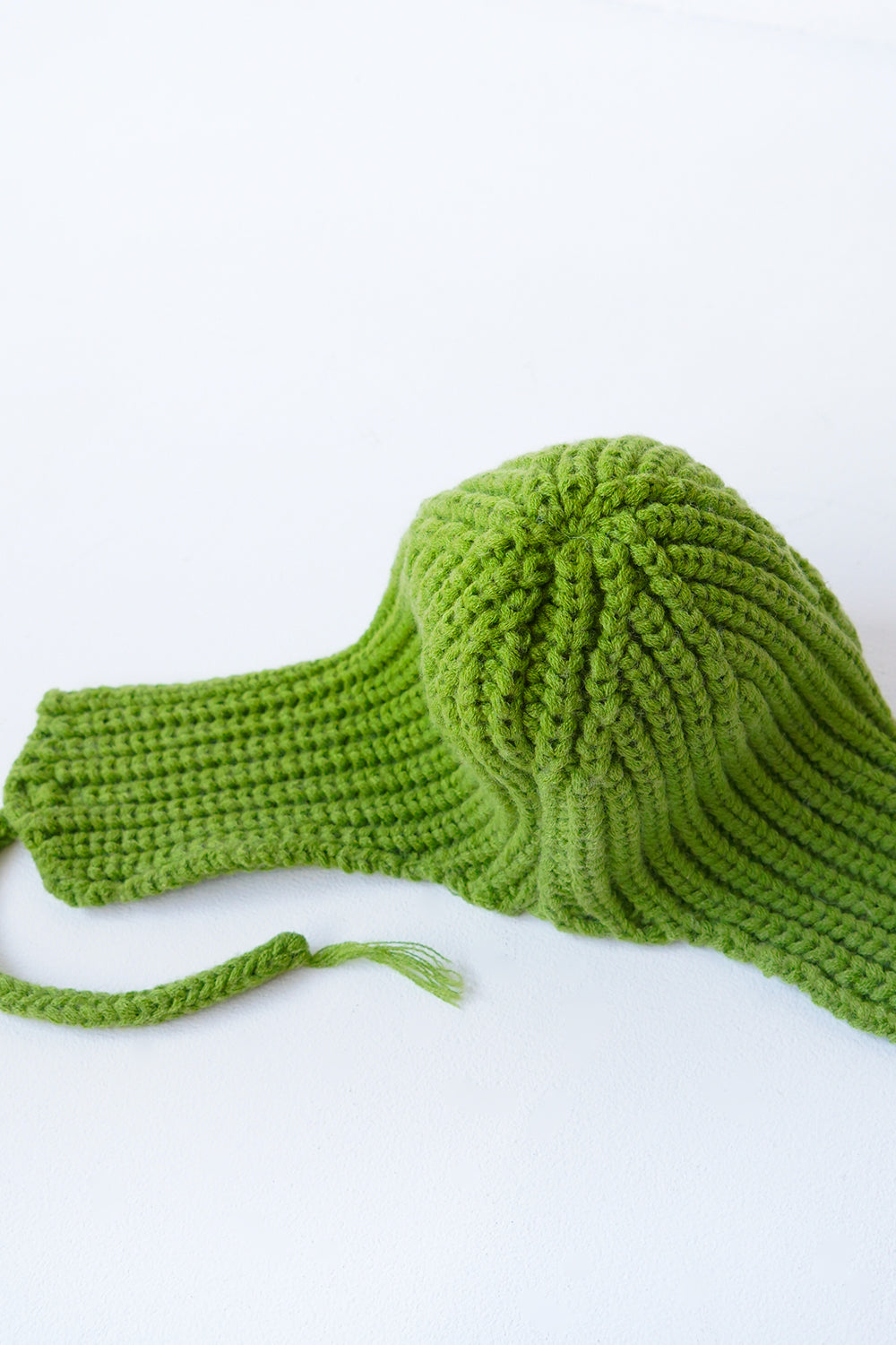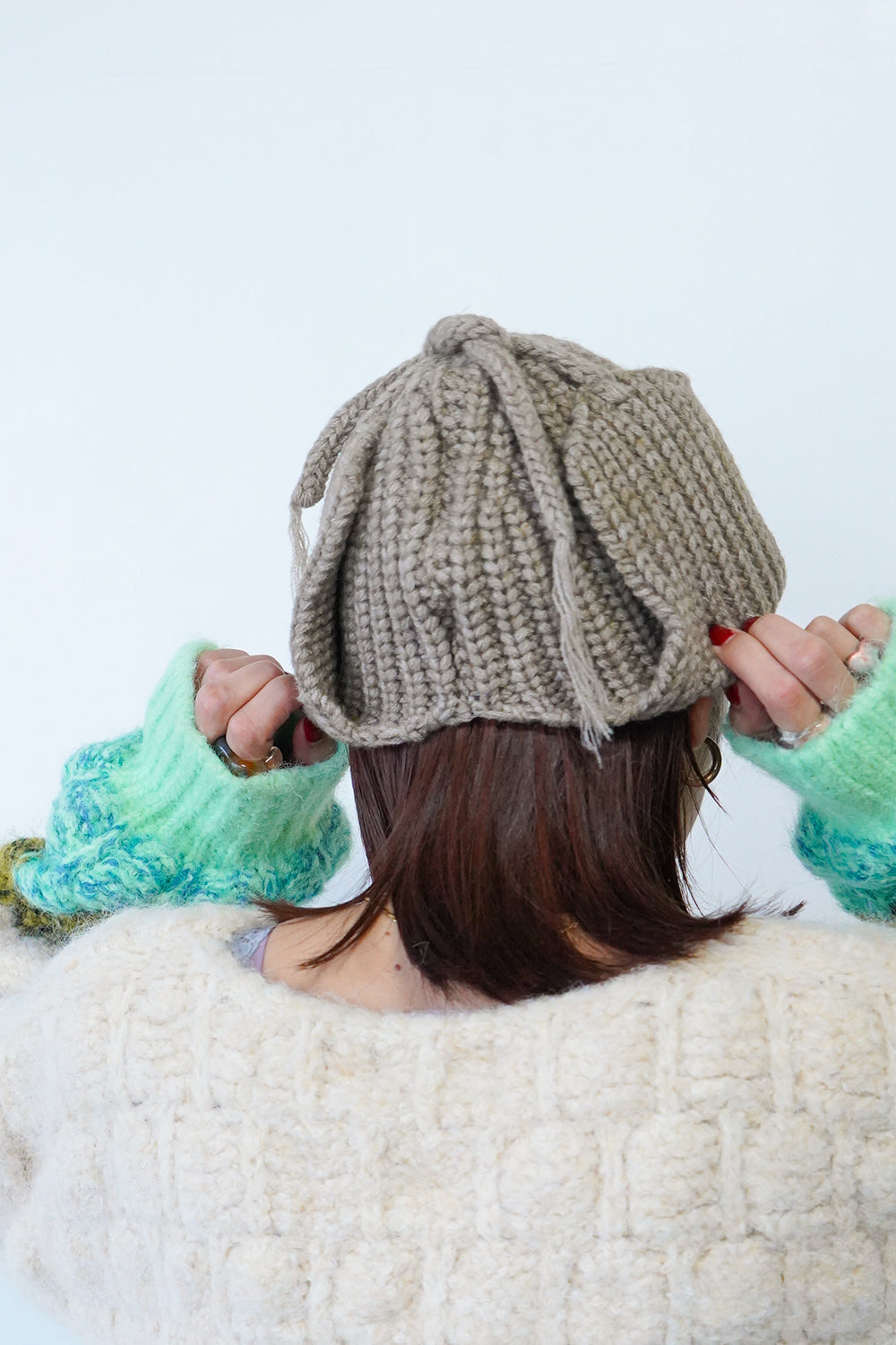 コンパクトなサイズ感がかわいい耳当て付きニット帽。上で結んだ状態だとスッキリとまとまり、フラップを降ろして着用すれば耳周りも暖かく防寒対策にも◎シンプルなデザインなので多彩なスタイリングにもマッチしてくれます。ベーシックに使いやすい2色とポップなカラー2色展開をセレクトしました。紐先の糸がさりげないポイント。