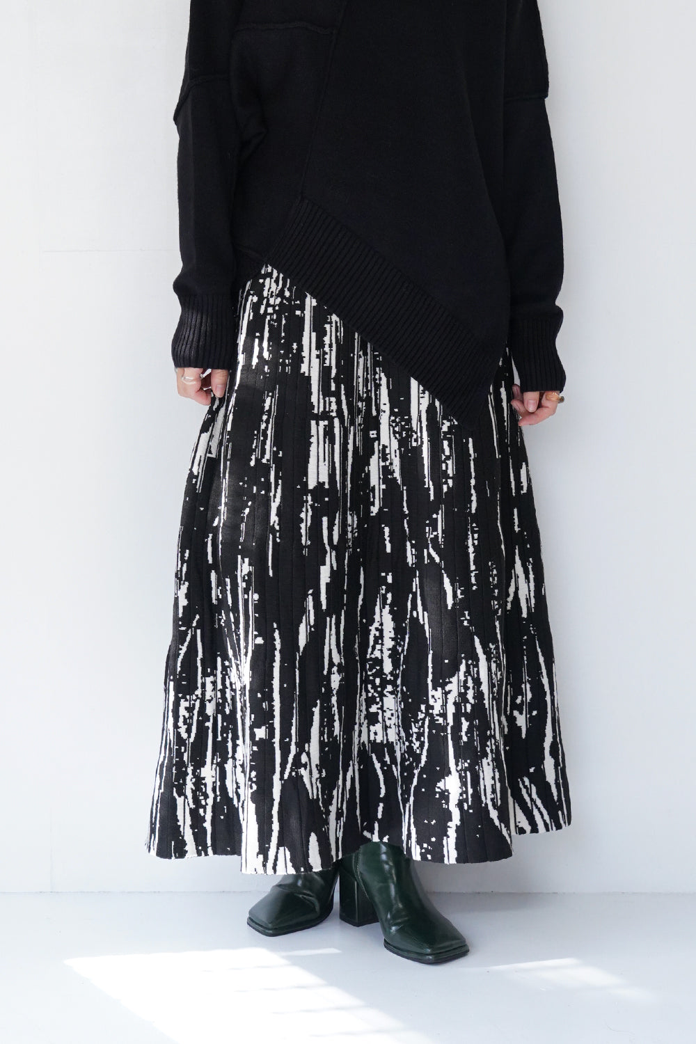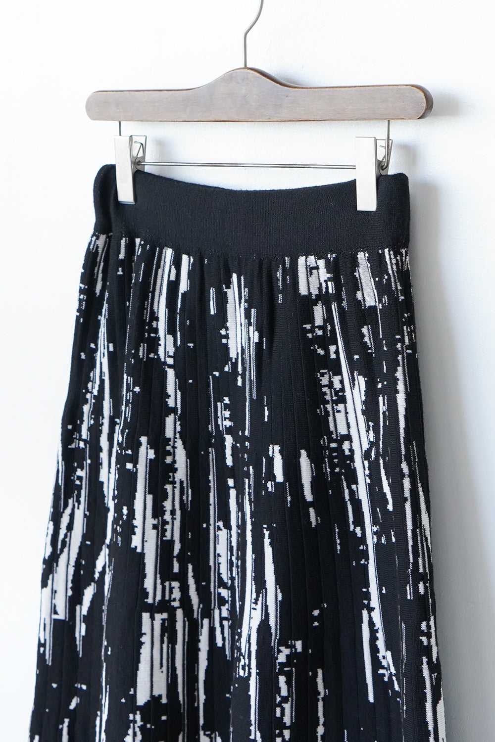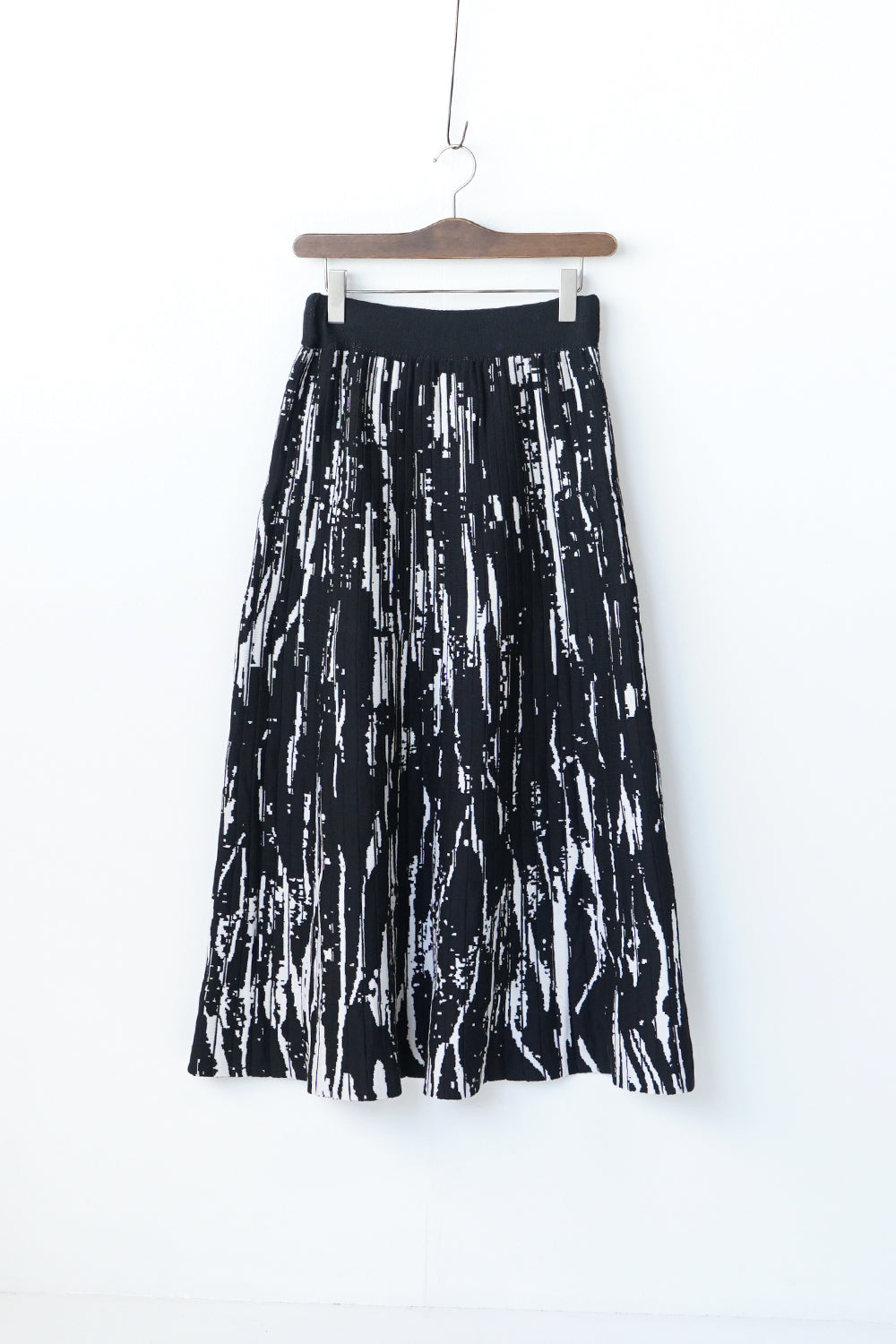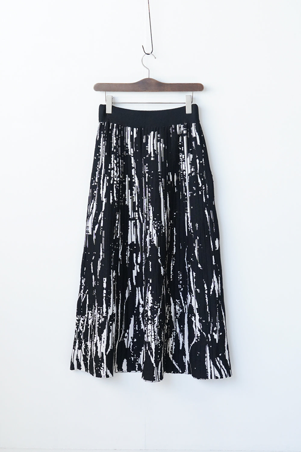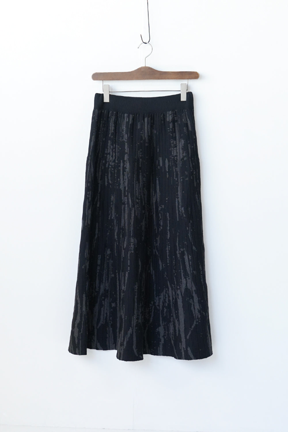大人モードな柄が特徴的なニットスカート。ニット生地ならではの温かみと細かいプリーツ加工が女性らしい印象。ウエストはオールゴム仕様でフィット感のある優しい穿き心地です。伸びのあるニット生地は1枚でも透けることなく、スカートを主役にした着こなしを楽しめます。