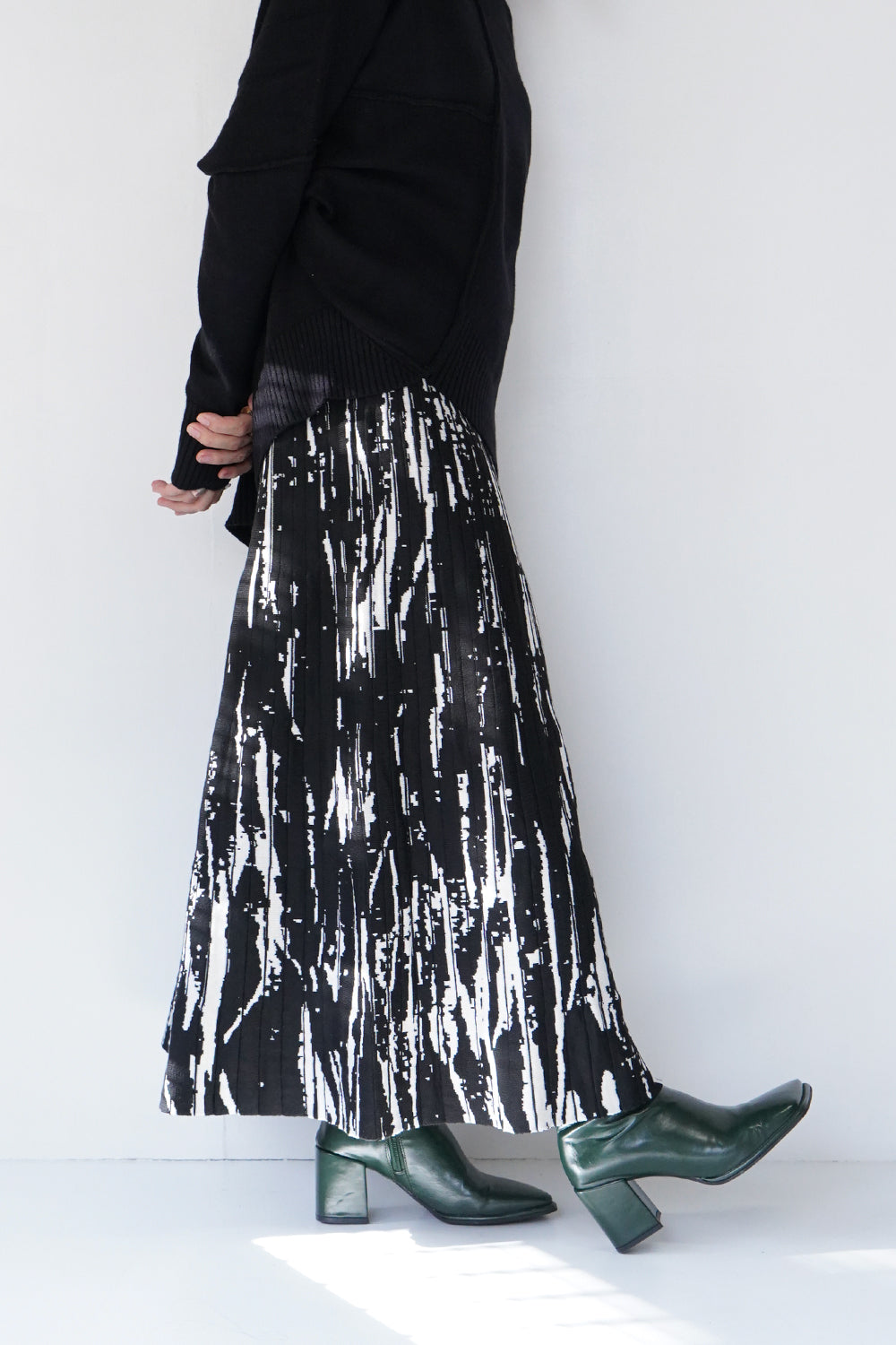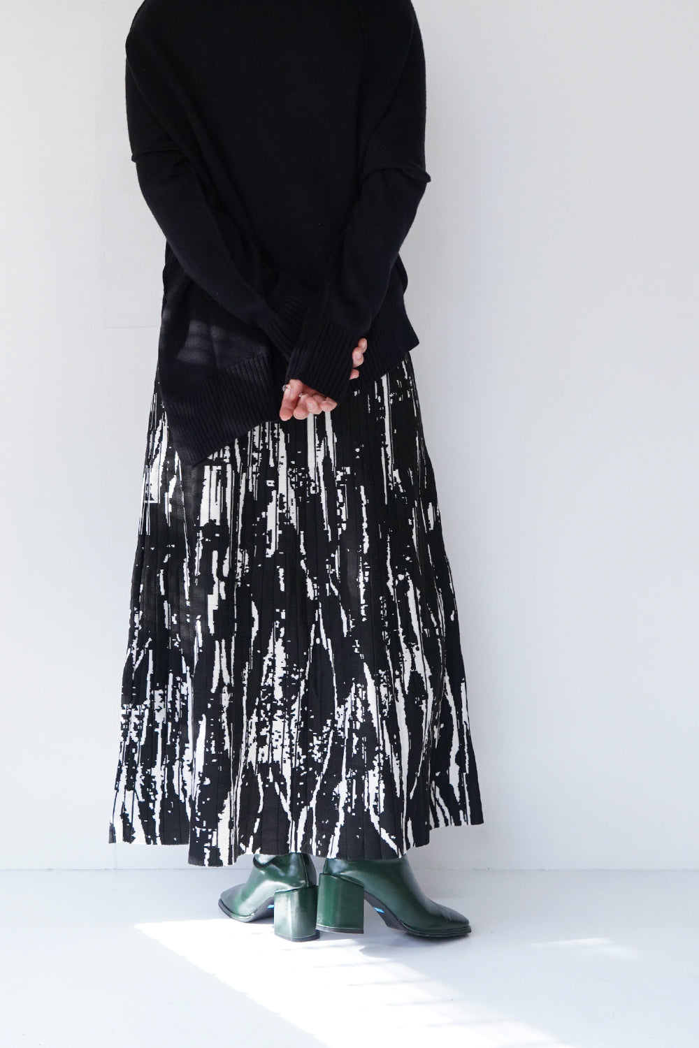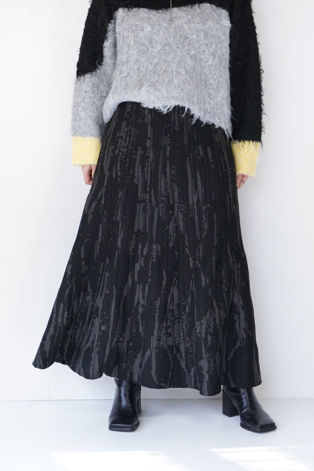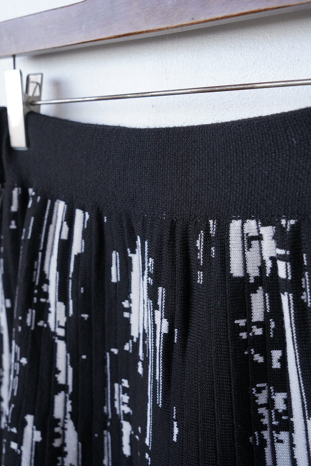 大人モードな柄が特徴的なニットスカート。ニット生地ならではの温かみと細かいプリーツ加工が女性らしい印象。ウエストはオールゴム仕様でフィット感のある優しい穿き心地です。伸びのあるニット生地は1枚でも透けることなく、スカートを主役にした着こなしを楽しめます。