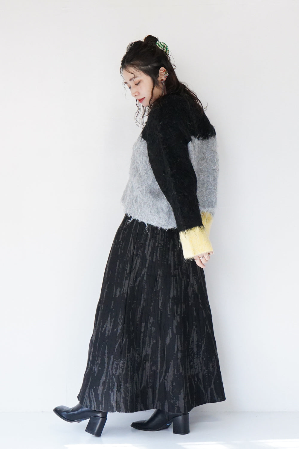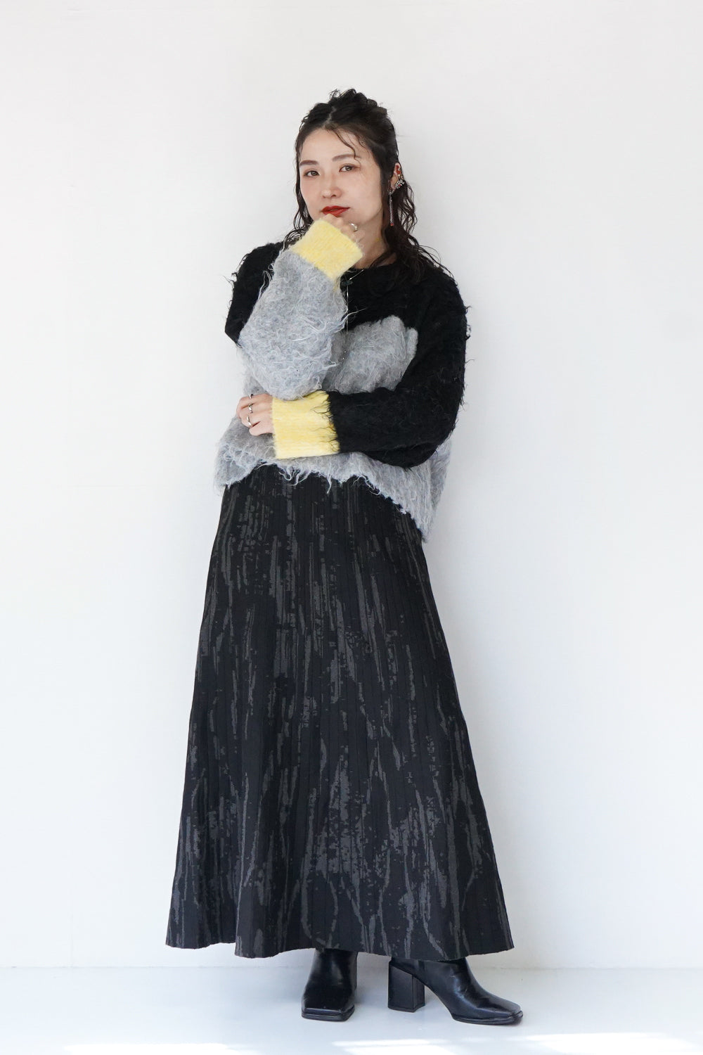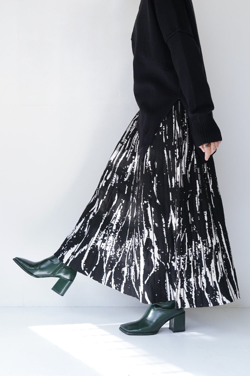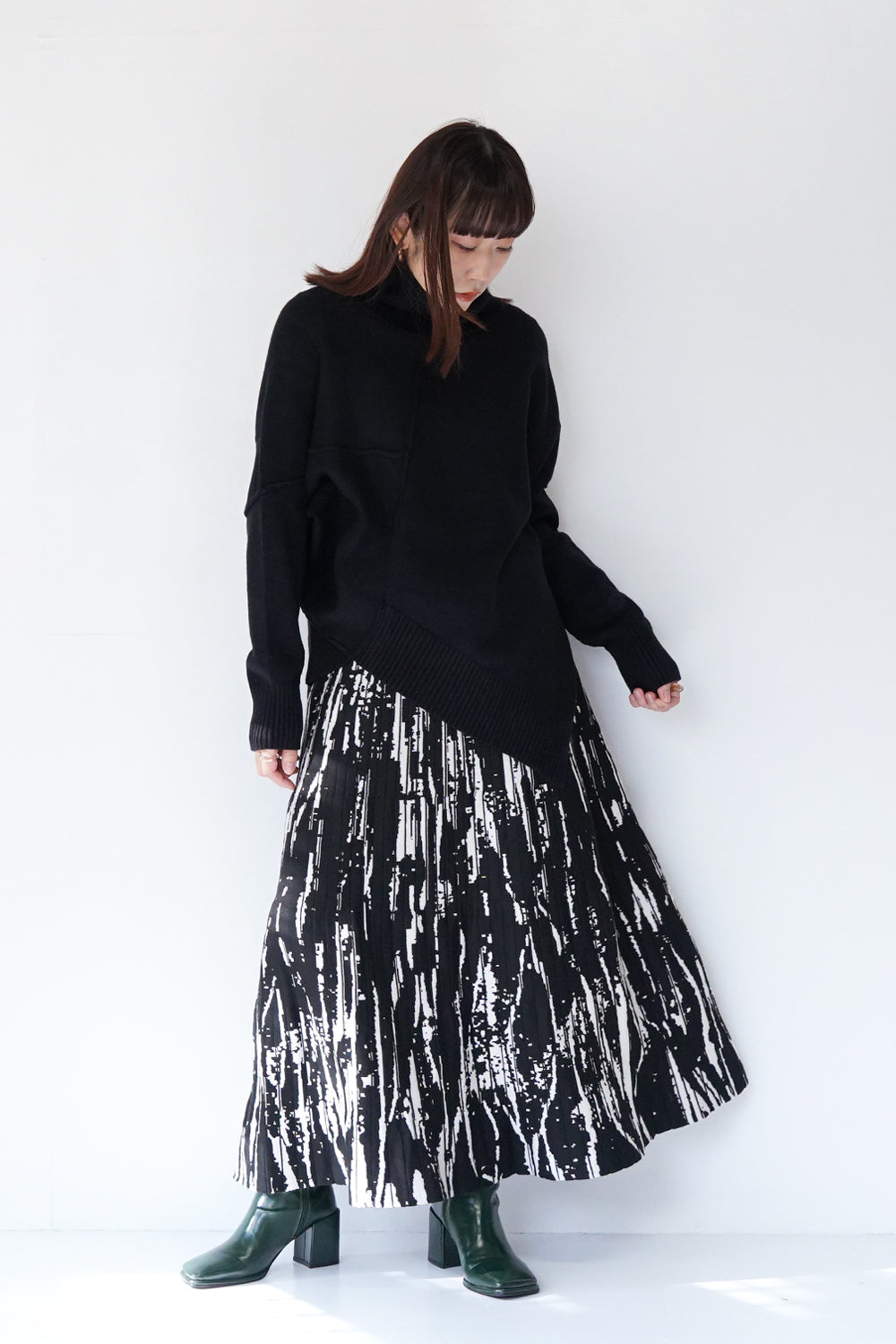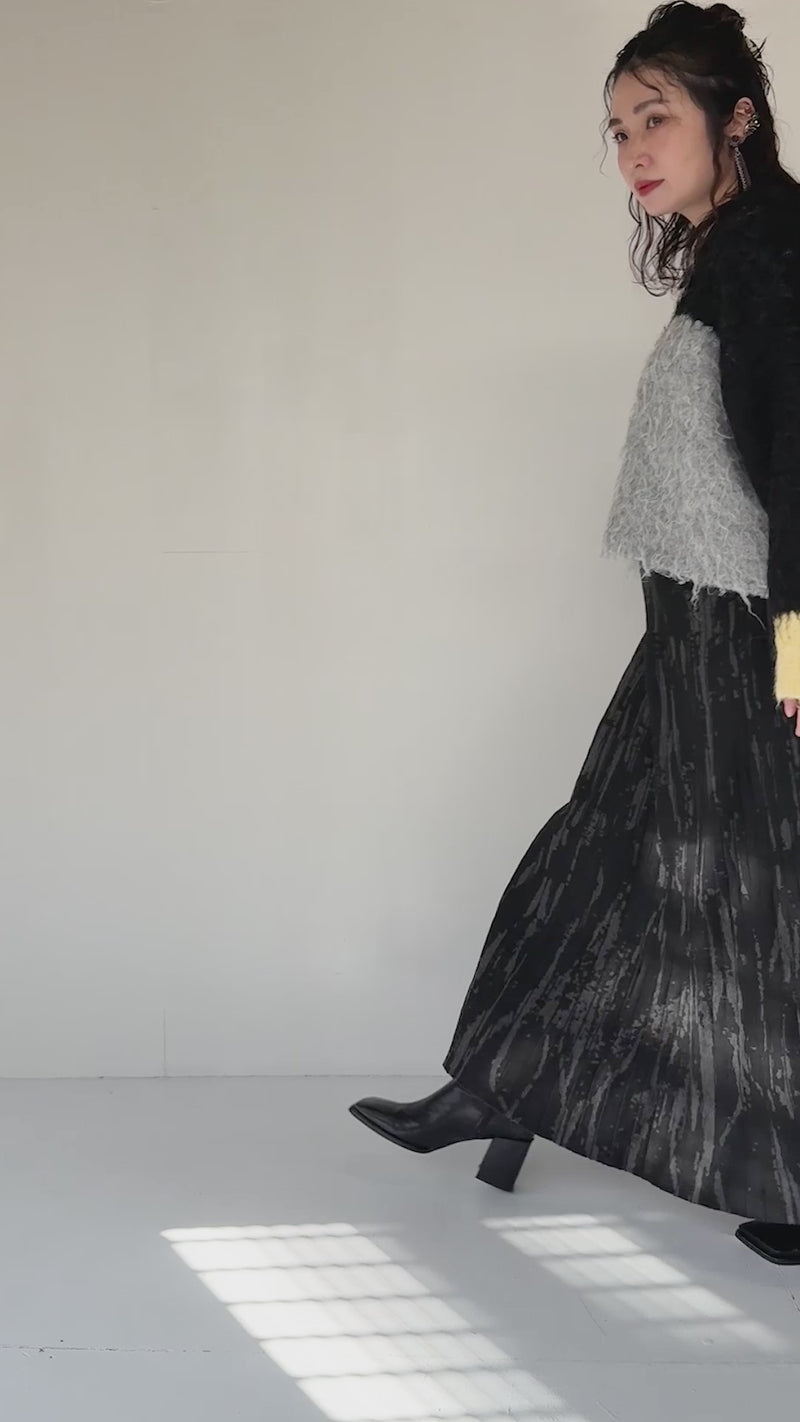 大人モードな柄が特徴的なニットスカート。ニット生地ならではの温かみと細かいプリーツ加工が女性らしい印象。ウエストはオールゴム仕様でフィット感のある優しい穿き心地です。伸びのあるニット生地は1枚でも透けることなく、スカートを主役にした着こなしを楽しめます。