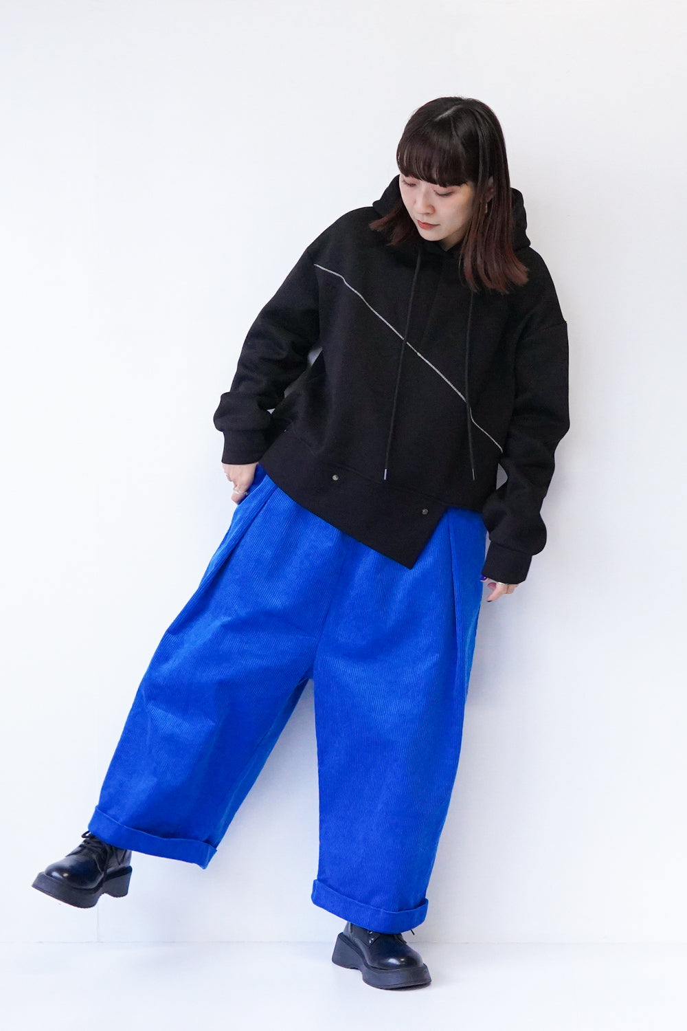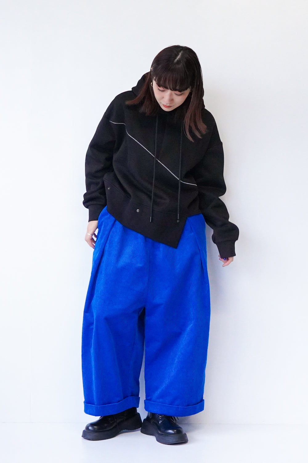 モード好きさん必見のフードパーカー。軽い着心地ですが裏起毛なのであったか!オリジナルコーデュロイパンツのブルーをアクセントに!