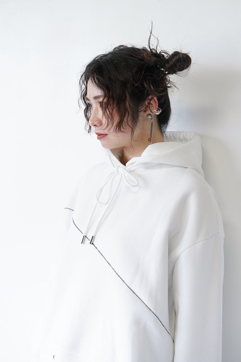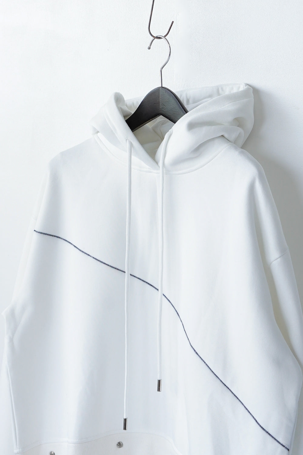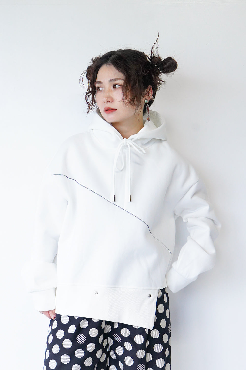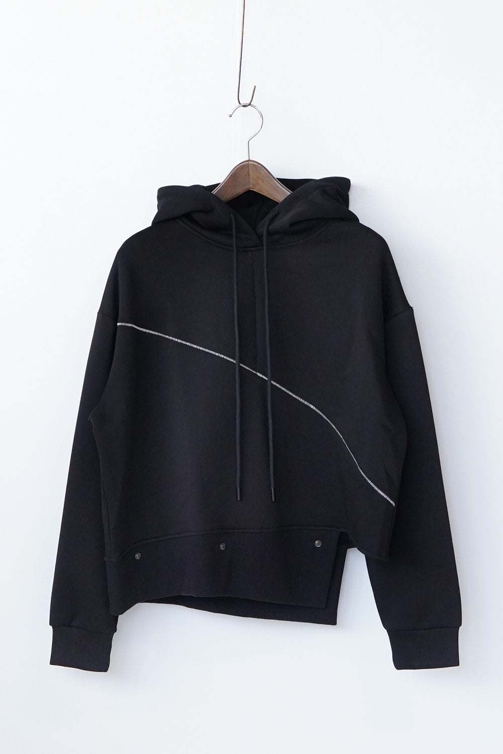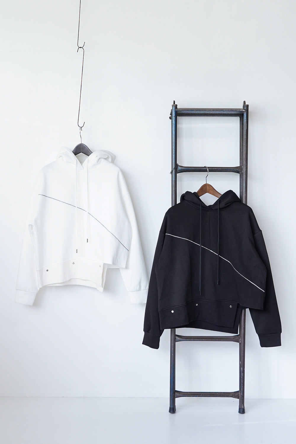 ステッチデザインがモードな印象の裏起毛パーカ。サイズ感はゆったりとしていて裏起毛仕様でとても暖かくておすすめ。裾の大きなリブとスタッズボタンがアクセントに。アンバランスな丈感も遊び心が詰まった1枚。