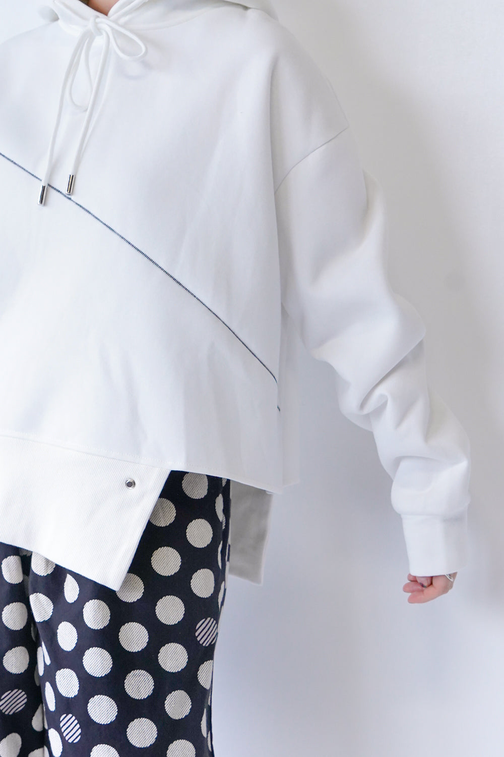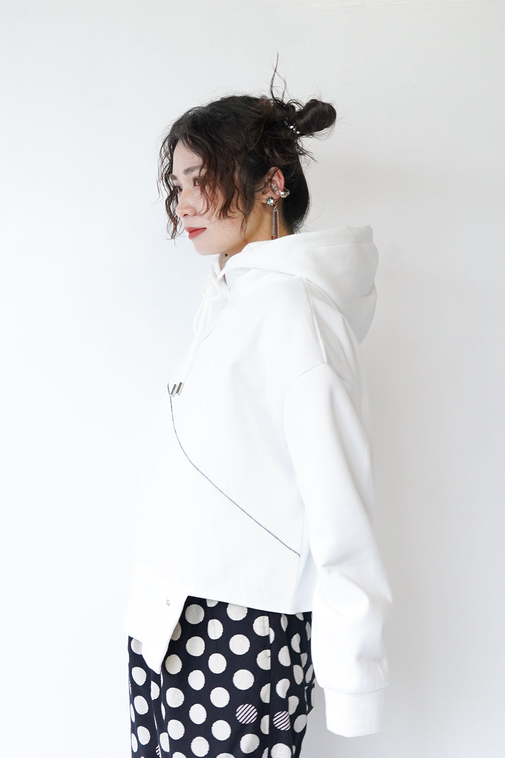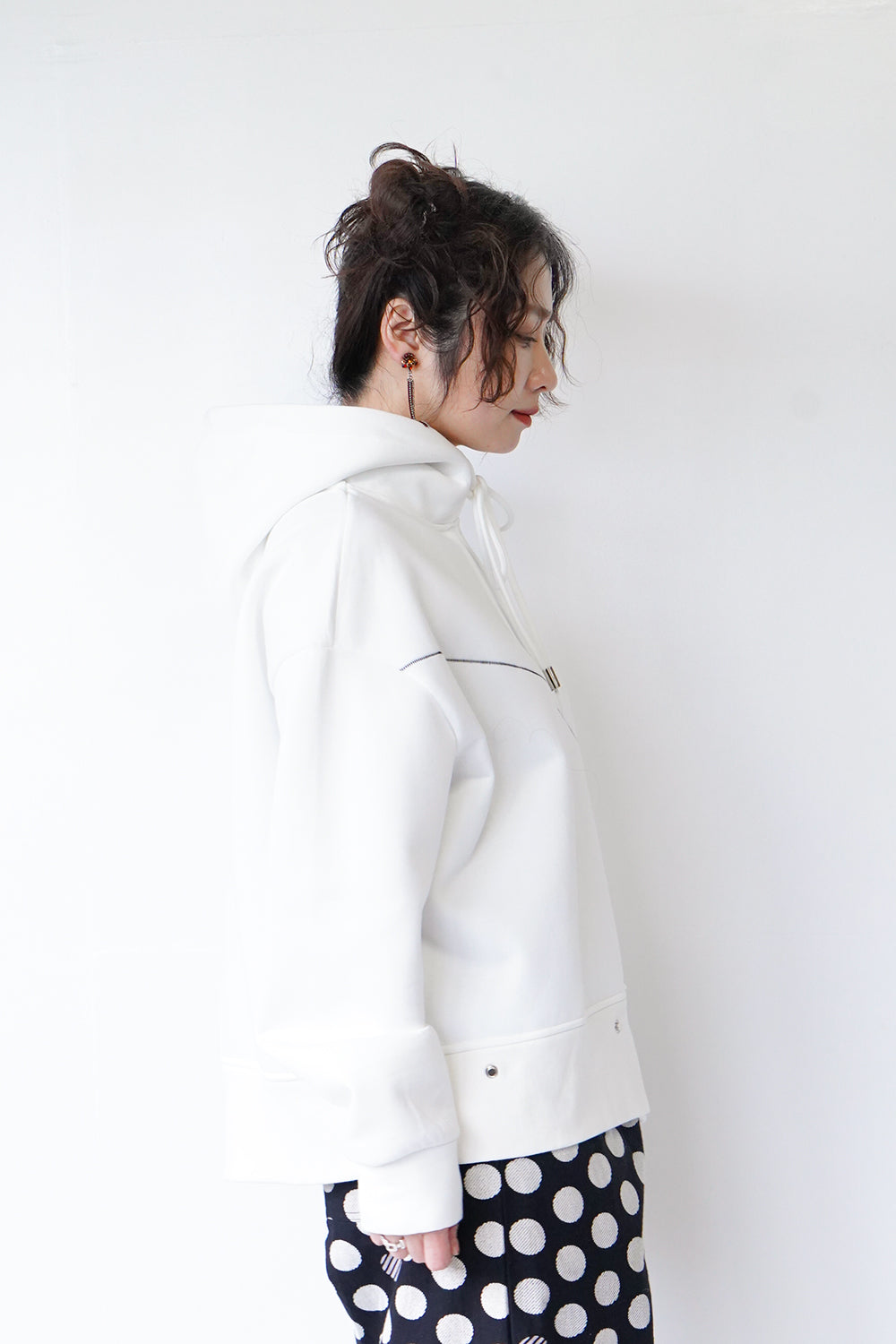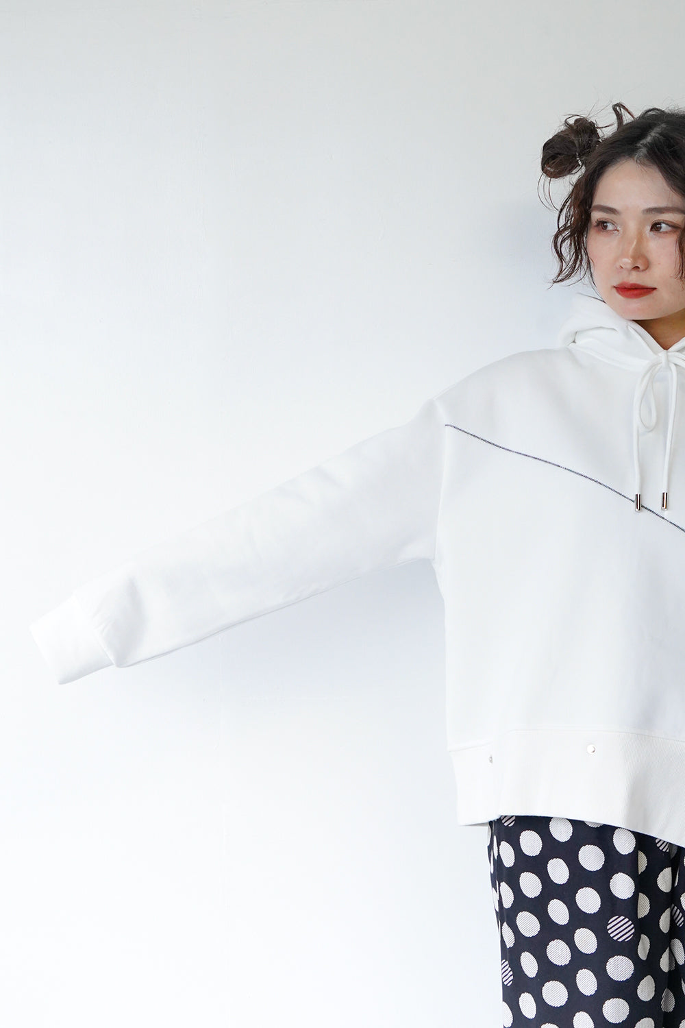 ステッチデザインがモードな印象の裏起毛パーカ。サイズ感はゆったりとしていて裏起毛仕様でとても暖かくておすすめ。裾の大きなリブとスタッズボタンがアクセントに。アンバランスな丈感も遊び心が詰まった1枚。